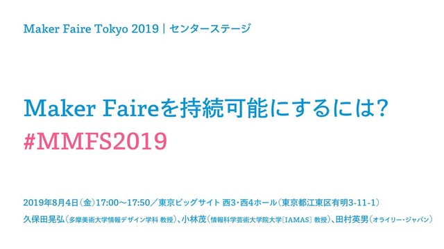 2019年8月4日に開催されたMaker Faire Tokyo 2019のセッション「Maker Faireを持続可能にするには?」ために作成した資料です。補足資料「The Maker Movement in Japan」は https://time.graphics/line/285105 からご覧ください。