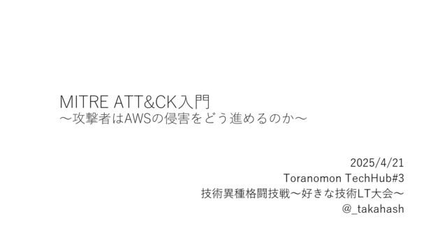 攻撃者管理のS3バケットへのデータコピー。別AWS地域の侵害済みア カウントへのデータ転送。攻撃者管理のECRリポジトリへのコンテナ イメージとしてのデータ流出。 • T1048: Exfiltration Over Alternative Protocol • C2チャネルで使用するプロトコル以外をデータ漏洩に利用。例えば DNSプロトコルで指示を行うが、データ流出はAWS APIで行うなど。 • T1567: Exfiltration Over Web Service • 攻撃者自前のサービスではなく、S3など一般的に利用されるWebサー ビスを経由したデータのアップロード。 Initial Access Execution Persistence Priviledge Escalation Defanse Evasion Credential Access Discovery C&C Lateral Movement Collection Exfiltraion Impact