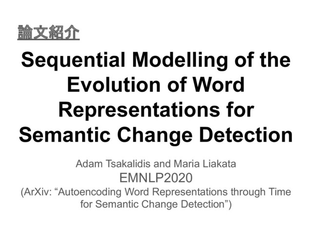 Change Detection Adam Tsakalidis and Maria Liakata EMNLP2020 (ArXiv: “Autoencoding Word Representations through Time for Semantic Change Detection”) 論文紹介