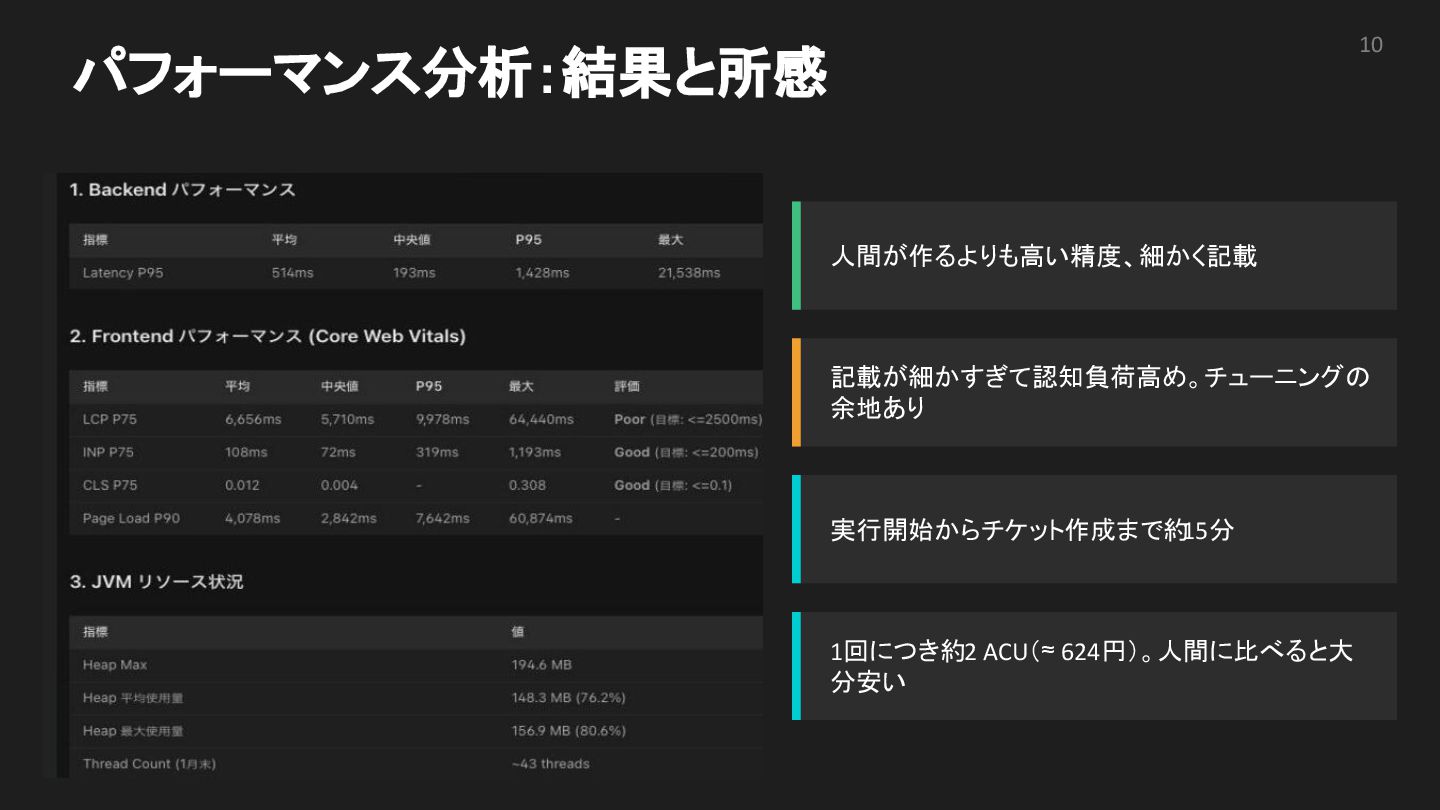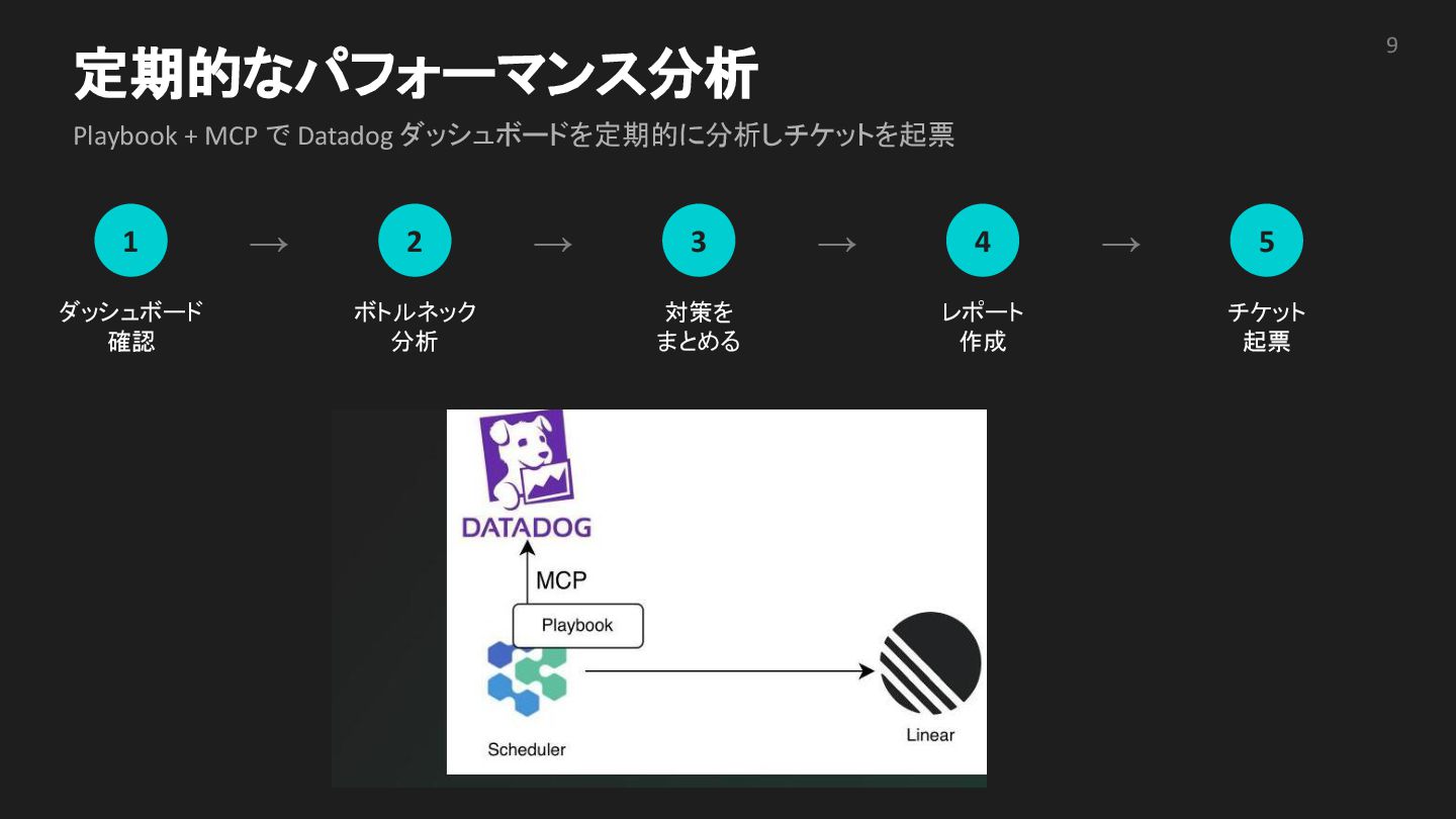 2. 9 定期的なパフォーマンス分析 Playbook + MCP で Datadog ダッシュボードを定期的に分析しチケットを起票 1 ダッシュボード