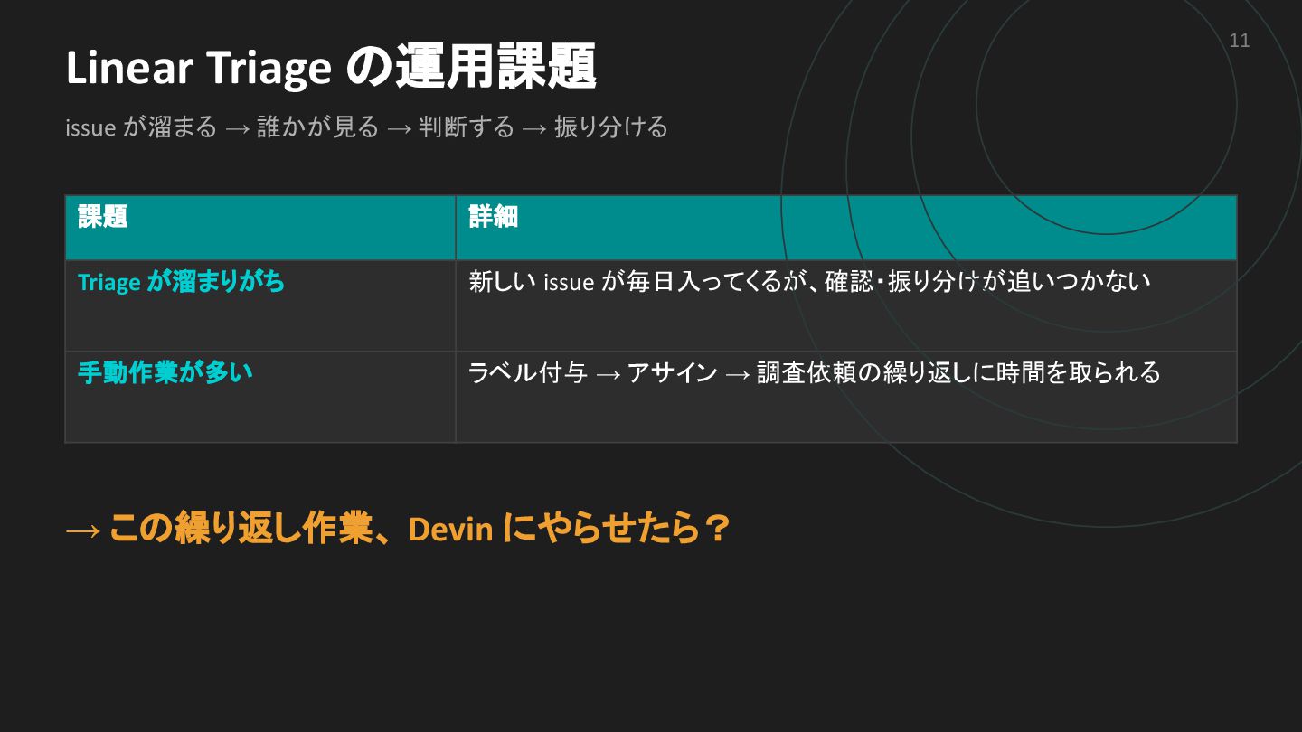 → 振り分ける 課題 詳細 Triage が溜まりがち 新しい issue が毎日入ってくるが、確認・振り分けが追いつかない 手動作業が多い ラベル付与 → アサイン → 調査依頼の繰り返しに時間を取られる → この繰り返し作業、 Devin にやらせたら?