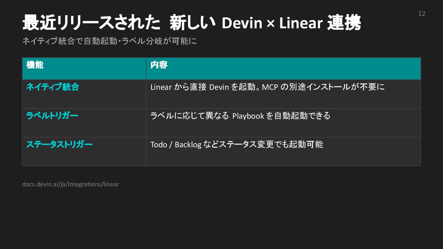 5. 12 最近リリースされた 新しい Devin × Linear 連携 ネイティブ統合で自動起動・ラベル分岐が可能に 機能 内容