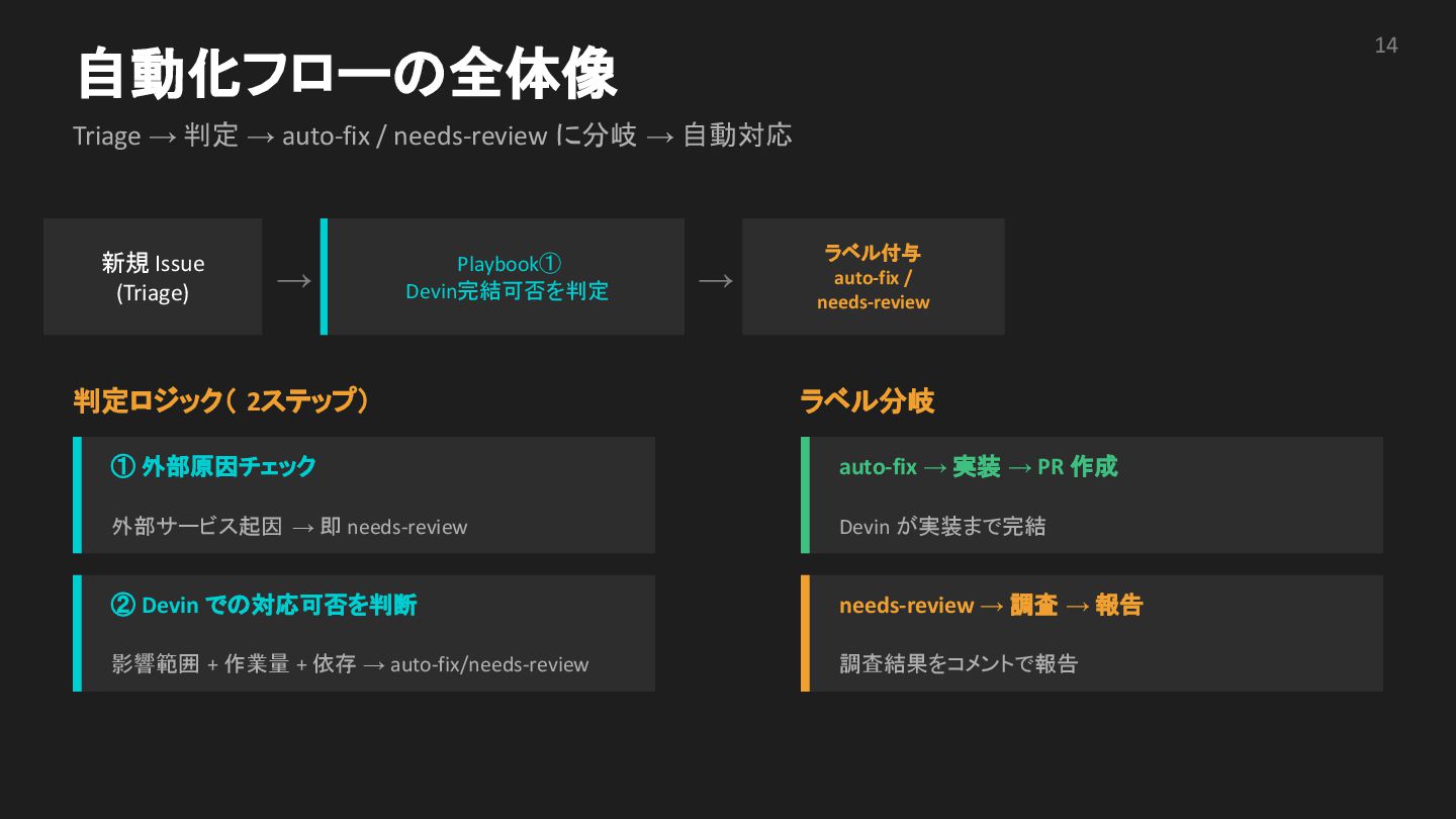 → 自動対応 新規 Issue (Triage) → Playbook① Devin完結可否を判定 → ラベル付与 auto-fix / needs-review 判定ロジック( 2ステップ) ① 外部原因チェック 外部サービス起因 → 即 needs-review ② Devin での対応可否を判断 影響範囲 + 作業量 + 依存 → auto-fix/needs-review ラベル分岐 auto-fix → 実装 → PR 作成 Devin が実装まで完結 needs-review → 調査 → 報告 調査結果をコメントで報告