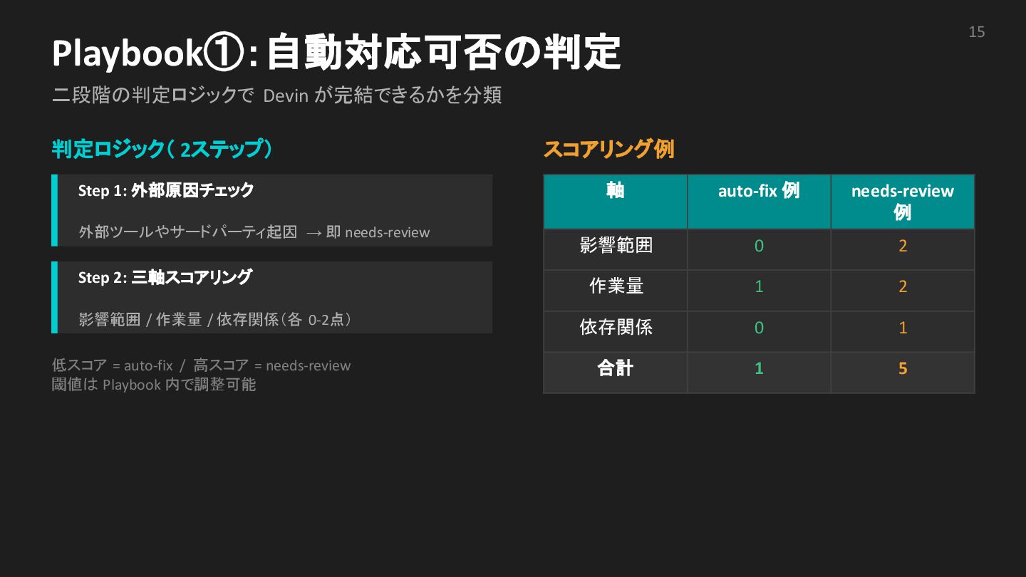 外部ツールやサードパーティ起因 → 即 needs-review Step 2: 三軸スコアリング 影響範囲 / 作業量 / 依存関係(各 0-2点) 低スコア = auto-fix / 高スコア = needs-review 閾値は Playbook 内で調整可能 スコアリング例 軸 auto-fix 例 needs-review 例 影響範囲 0 2 作業量 1 2 依存関係 0 1 合計 1 5