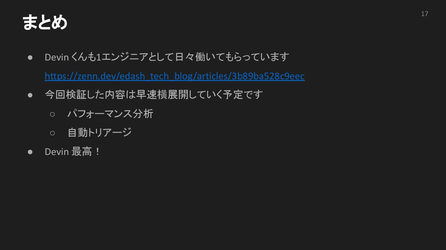 Devin にアサインし自動着手: 1. issue の要件を分析 2. コード修正・テスト実行 3. PR を作成して提出 needs-review → 調査報告で人間を支援 コード調査してコメントで報告: 1. issue の要件を詳細に分析 2. 影響範囲をコードベースから調査 3. 変更方針・リスクを整理 4. issue コメントで調査結果を報告 → レビュー依頼まで完全自動! → 人間が判断すべき部分だけ残す