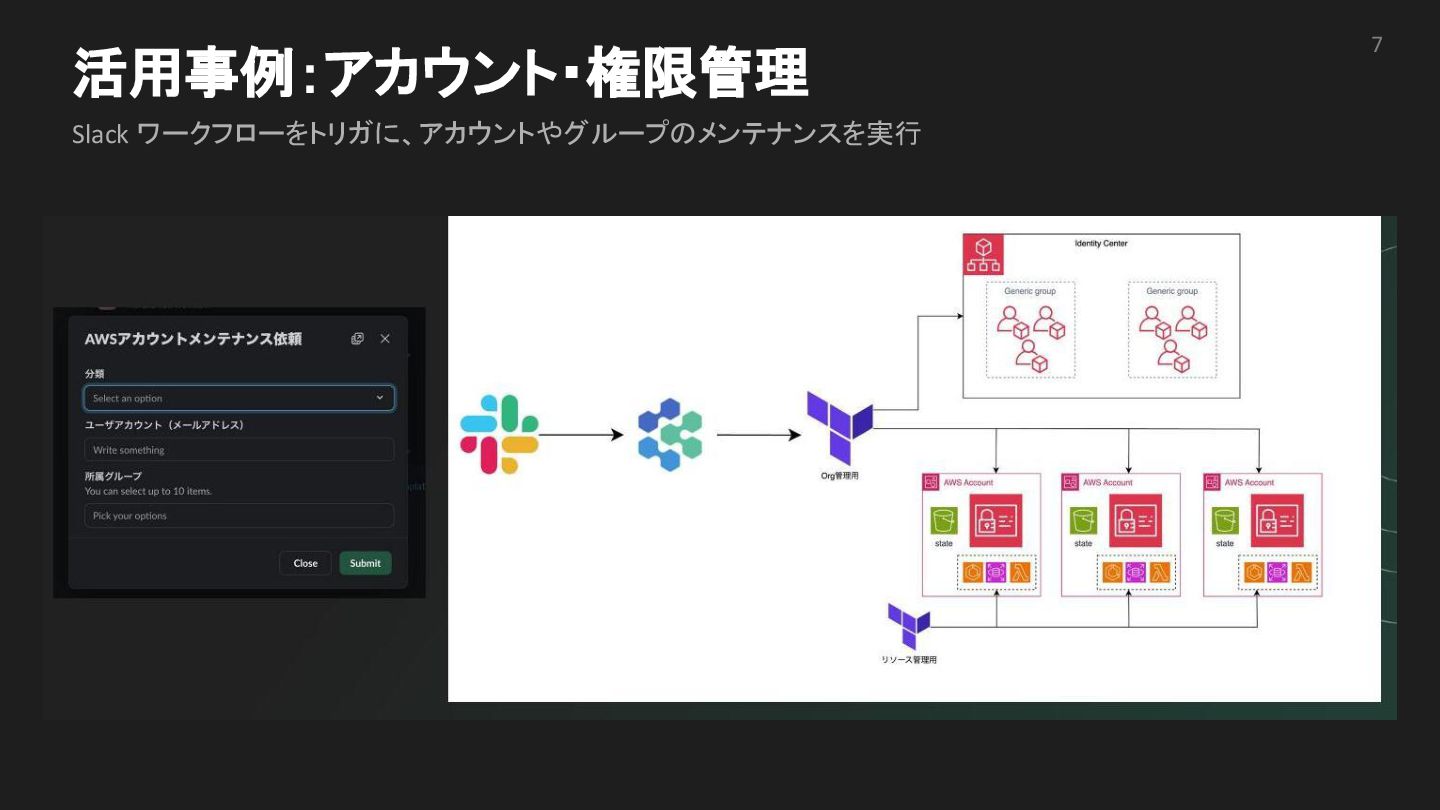 Slackワークフローを起点にしたアカウント・権限管理 Slack ワークフローをトリガに、アカウントやグループのメンテナンスを実行 PR レビュー 最近公式機能としてリリースされたPRレビュー機能を活用 DeepWiki への集約 会議議事録を自動で DeepWiki(社内ナレッジ)へ構造化して集約