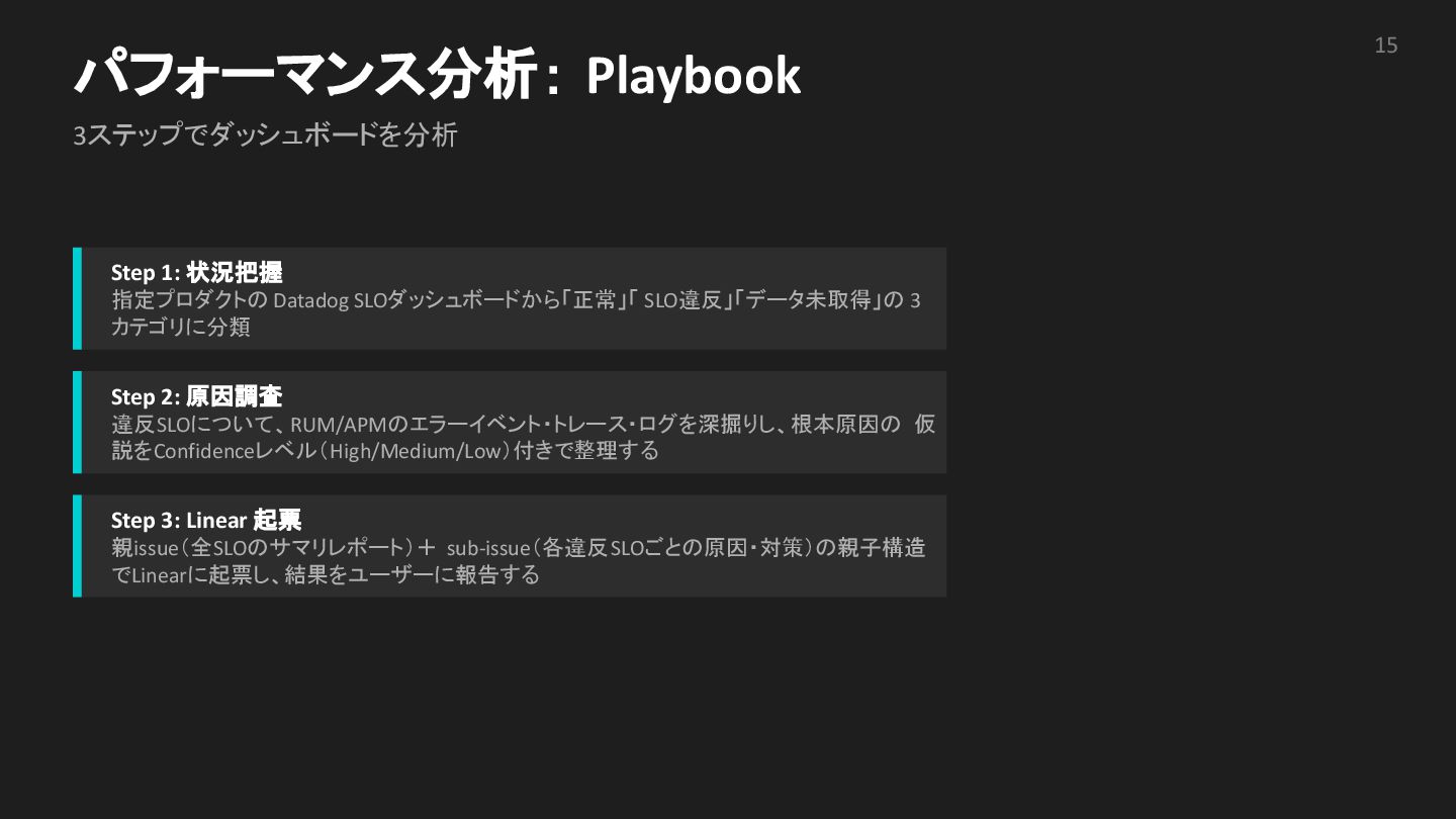SLO違反」「データ未取得」の 3 カテゴリに分類      Step 2: 原因調査 違反SLOについて、RUM/APMのエラーイベント・トレース・ログを深掘りし、根本原因の 仮 説をConfidenceレベル(High/Medium/Low)付きで整理する Step 3: Linear 起票 親issue(全SLOのサマリレポート)+ sub-issue(各違反SLOごとの原因・対策)の親子構造 でLinearに起票し、結果をユーザーに報告する