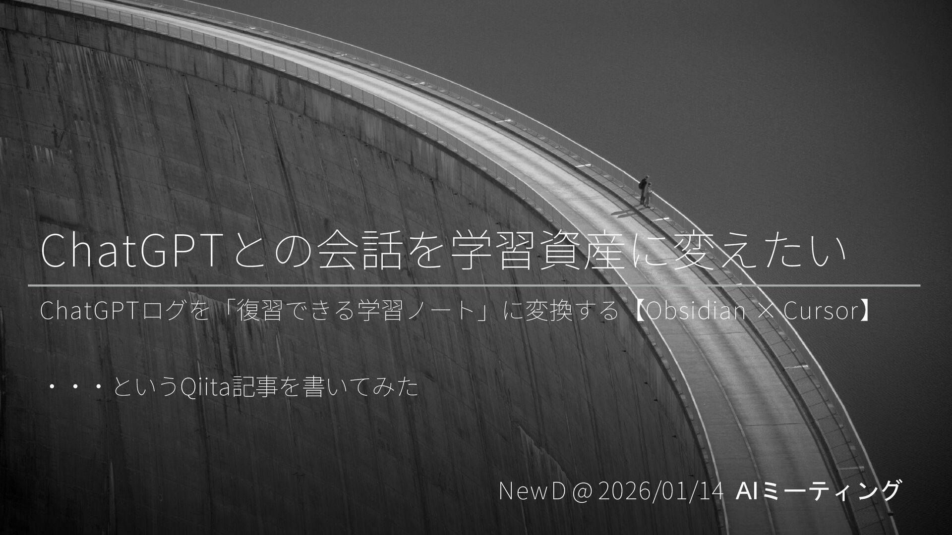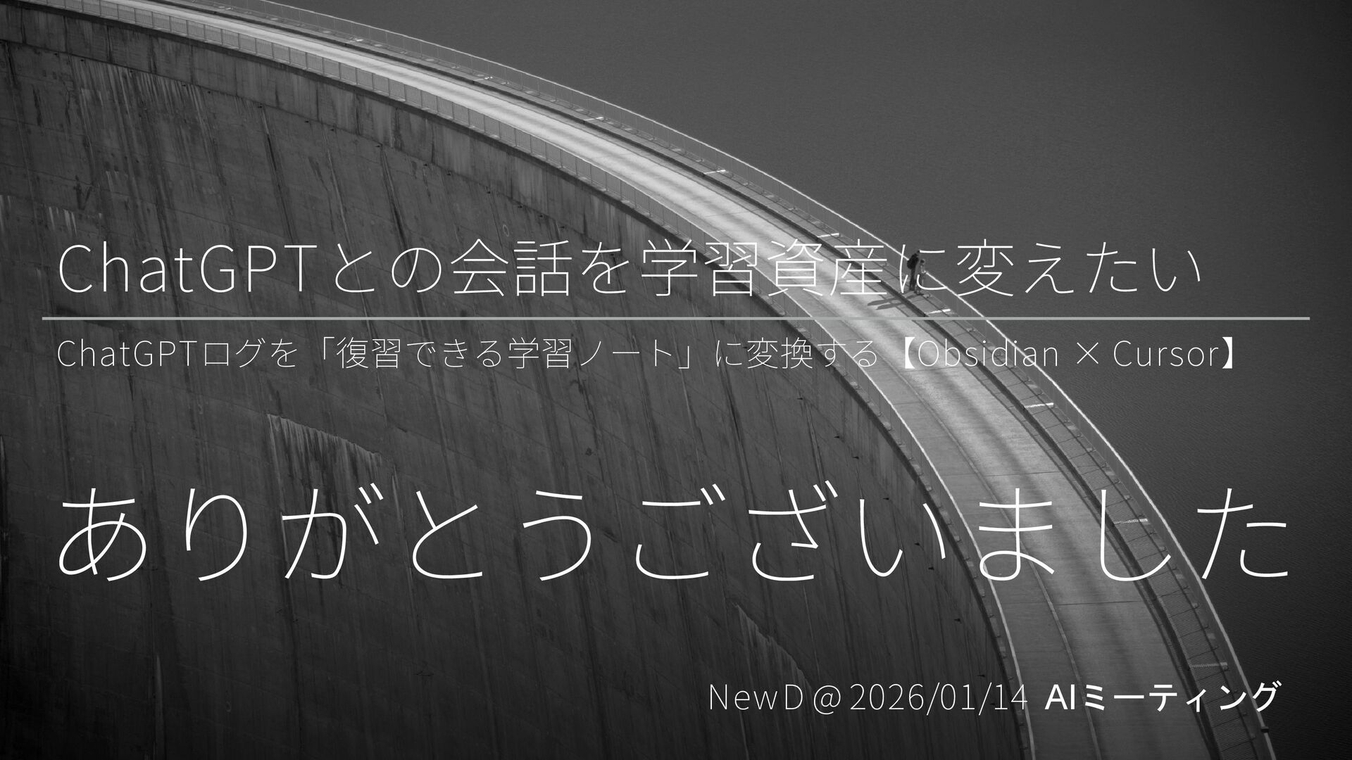 ChatGPTとの会話を学習資産に変えたい ChatGPTログを「復習できる学習ノート」に変換する【Obsidian × Cursor】 ありがとうございました NewD @ 2026/01/14 AIミーティング