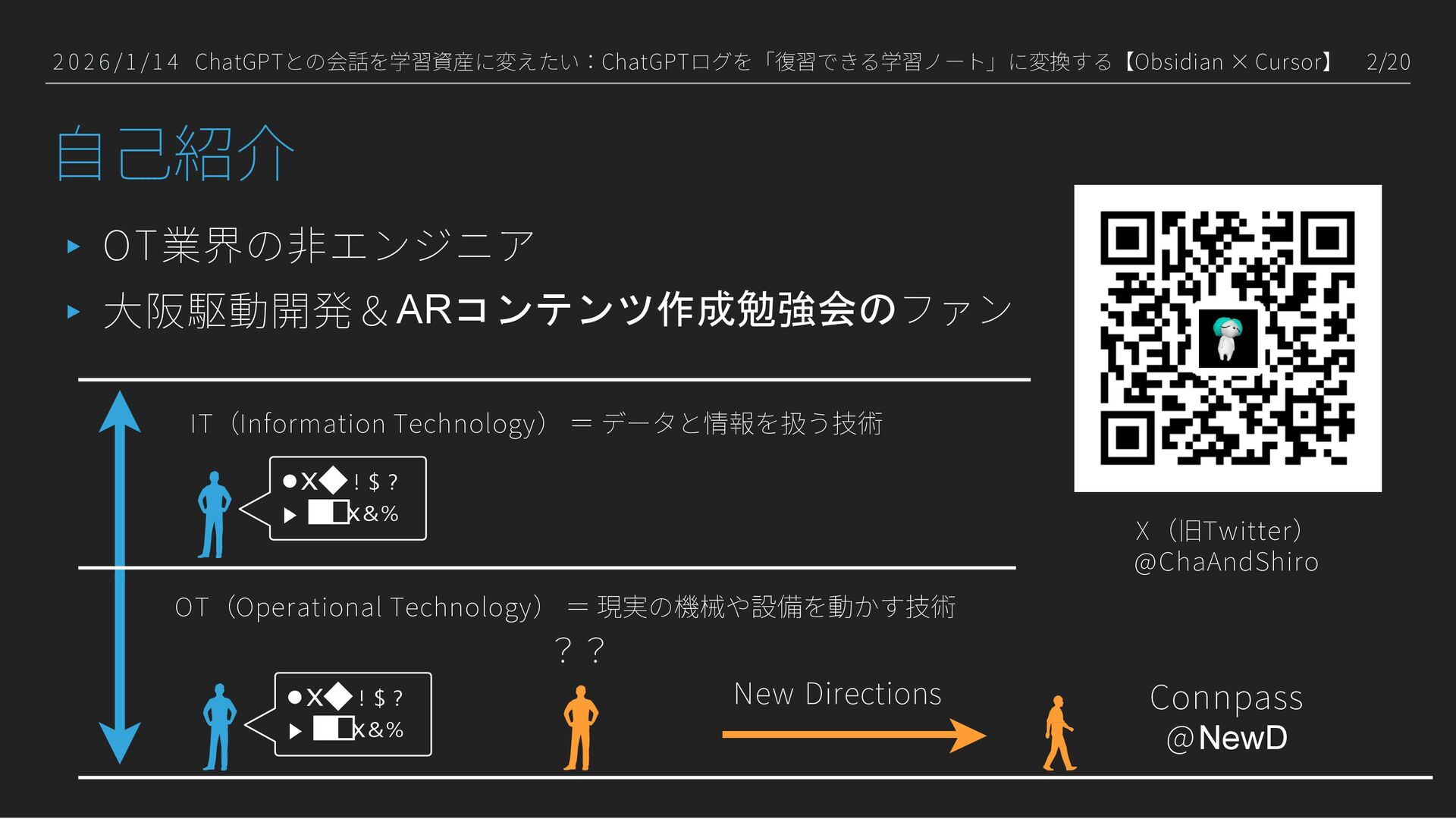 Technology) = 現実の機械や設備を動かす技術 •x◆!$? ?? •x◆!$? ▪ □ x&% 自己紹介 ▸ OT業界の非エンジニア ▸ 大阪駆動開発&ARコンテンツ作成勉強会のファン 2 0 2 6 /1 /1 4 ChatGPTとの会話を学習資産に変えたい:ChatGPTログを「復習できる学習ノート」に変換する【Obsidian × Cursor】 2/20 X(旧Twitter) @ChaAndShiro Connpass @NewD