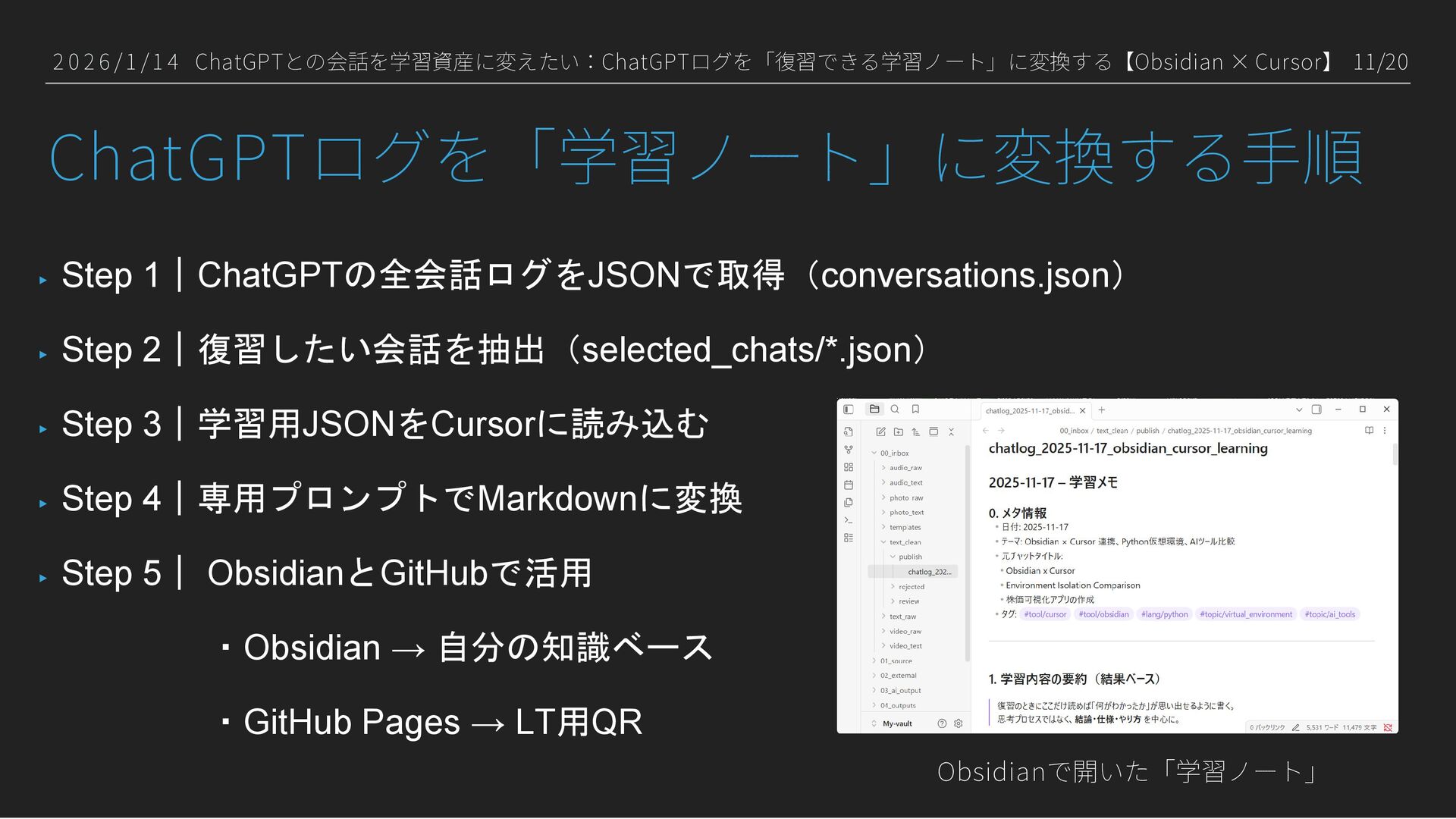 ▸ Step 4|専用プロンプトでMarkdownに変換 ▸ Step 5| ObsidianとGitHubで活用 ・Obsidian → 自分の知識ベース ・GitHub Pages → LT用QR 2 0 2 6 /1 /1 4 ChatGPTとの会話を学習資産に変えたい:ChatGPTログを「復習できる学習ノート」に変換する【Obsidian × Cursor】 11/20 Obsidianで開いた「学習ノート」