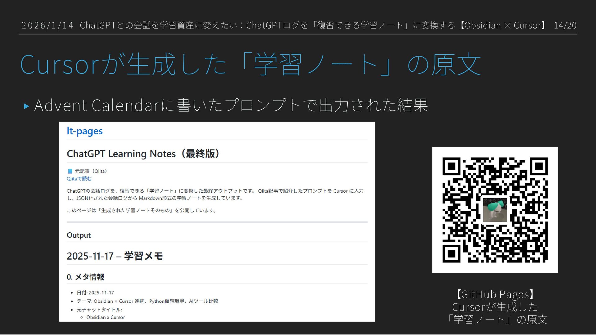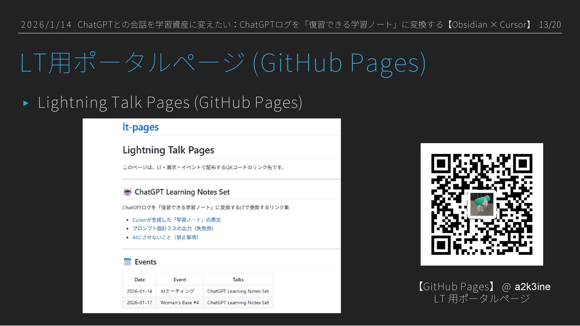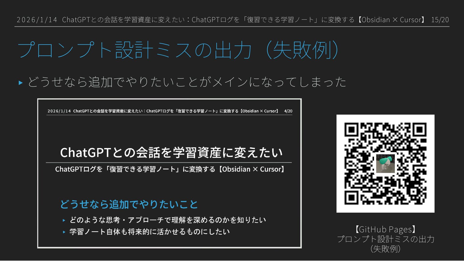 Lightning Talk Pages (GitHub Pages) 2 0 2 6 /1 /1 4 ChatGPTとの会話を学習資産に変えたい:ChatGPTログを「復習できる学習ノート」に変換する【Obsidian × Cursor】 13/20