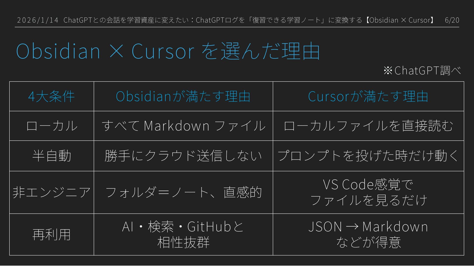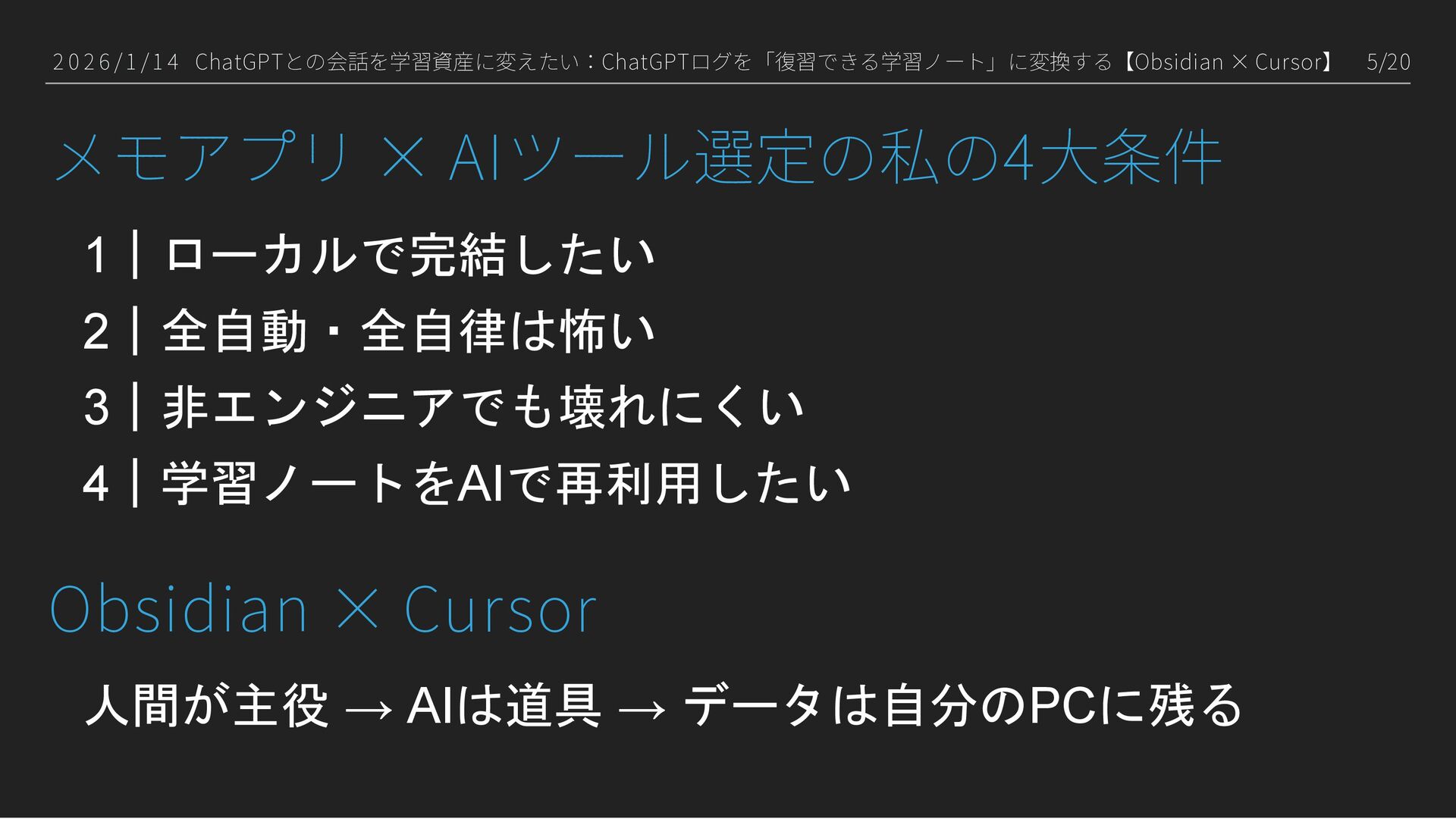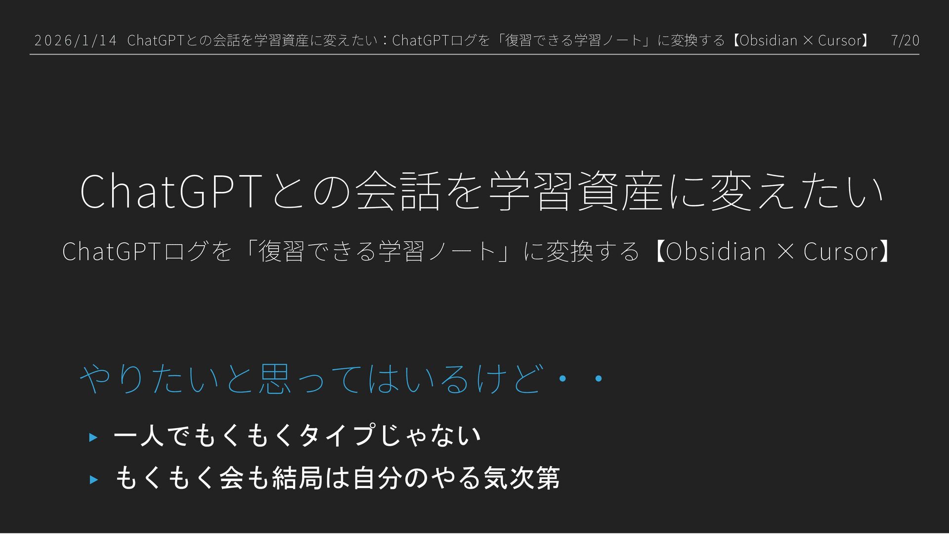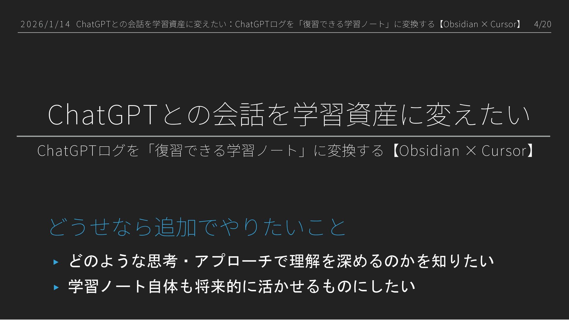 Lightning Talk Pages (GitHub Pages) 2 0 2 6 /1 /1 4 ChatGPTとの会話を学習資産に変えたい:ChatGPTログを「復習できる学習ノート」に変換する【Obsidian × Cursor】 13/20