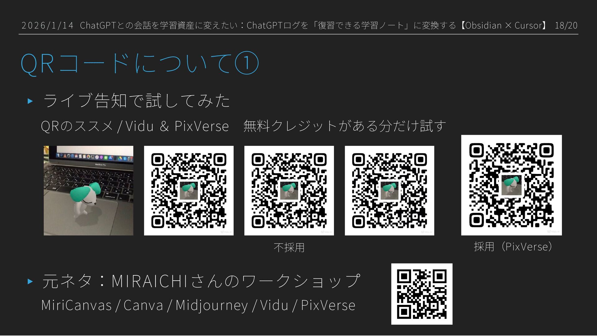 & (解決策) ▸ AIにさせないこと(禁止事項) ▸ QRコードについて①② 2 0 2 6 /1 /1 4 ChatGPTとの会話を学習資産に変えたい:ChatGPTログを「復習できる学習ノート」に変換する【Obsidian × Cursor】 12/20 【Qiita記事】ChatGPTとの会話を 学習資産に変えたい