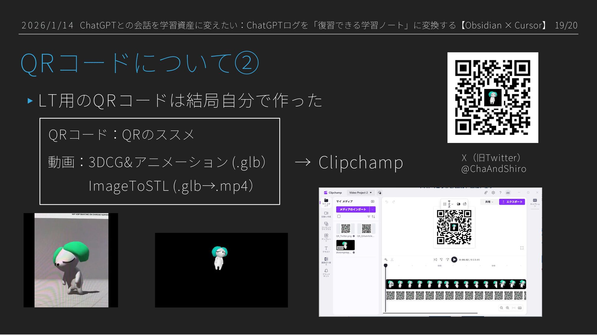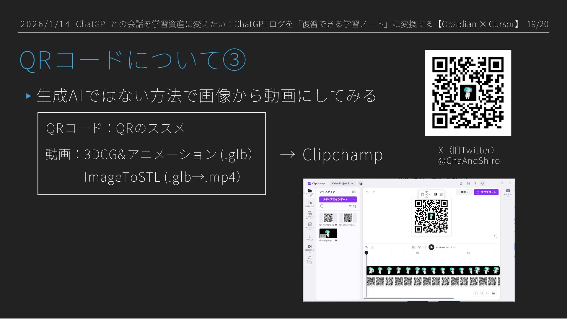 × Cursor】 19/20 → Clipchamp QRコード:QRのススメ 動画:3DCG&アニメーション (.glb) ImageToSTL (.glb→.mp4) X(旧Twitter) @ChaAndShiro