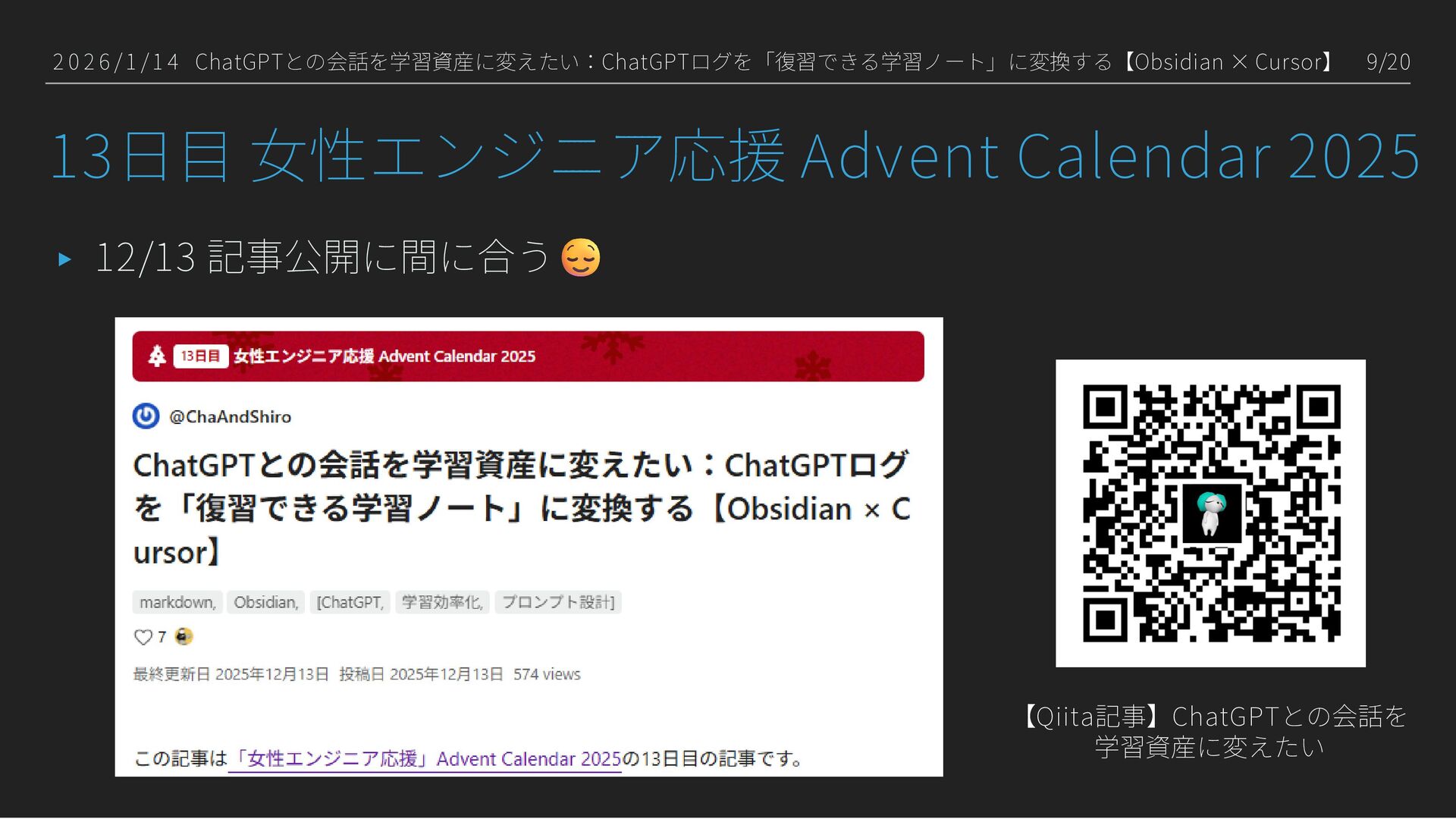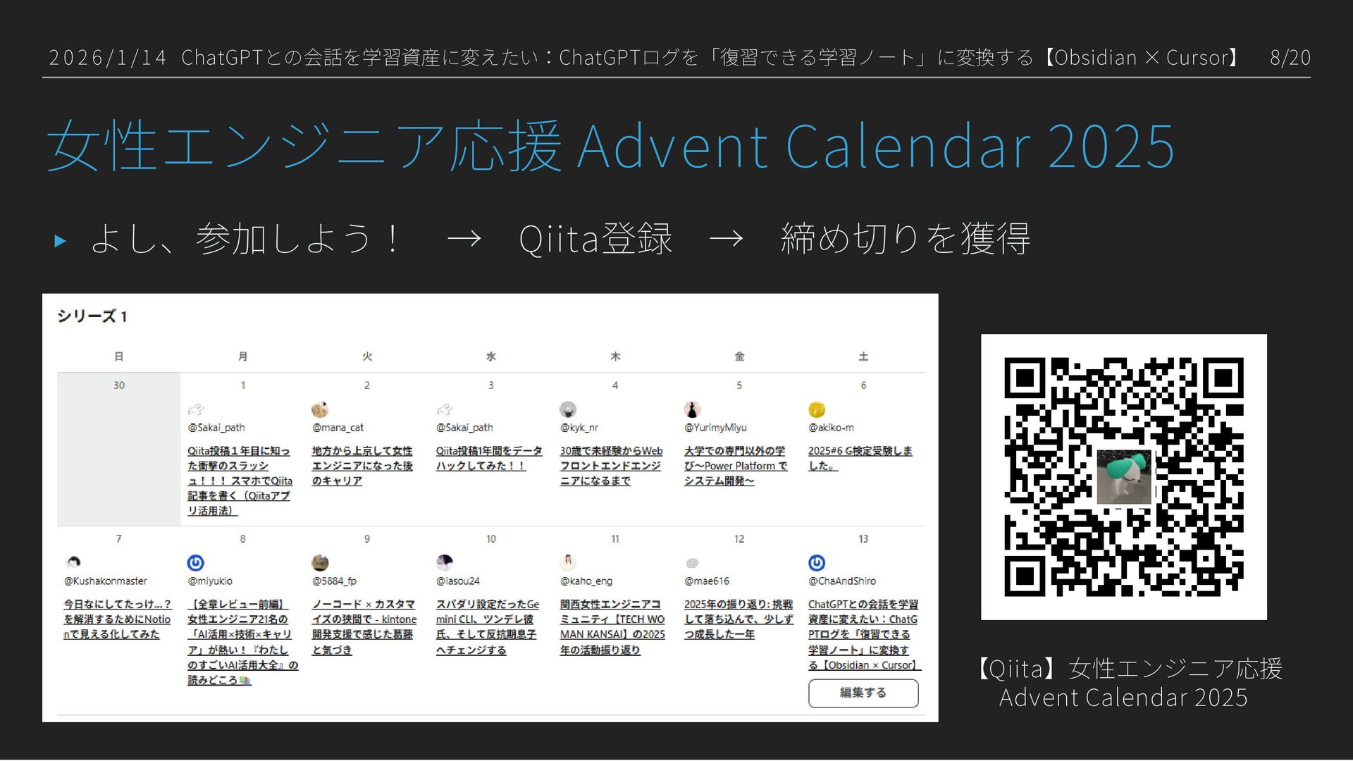 【Qiita】女性エンジニア応援 Advent Calendar 2025 2 0 2 6 /1 /1 4 ChatGPTとの会話を学習資産に変えたい:ChatGPTログを「復習できる学習ノート」に変換する【Obsidian × Cursor】 8/20
