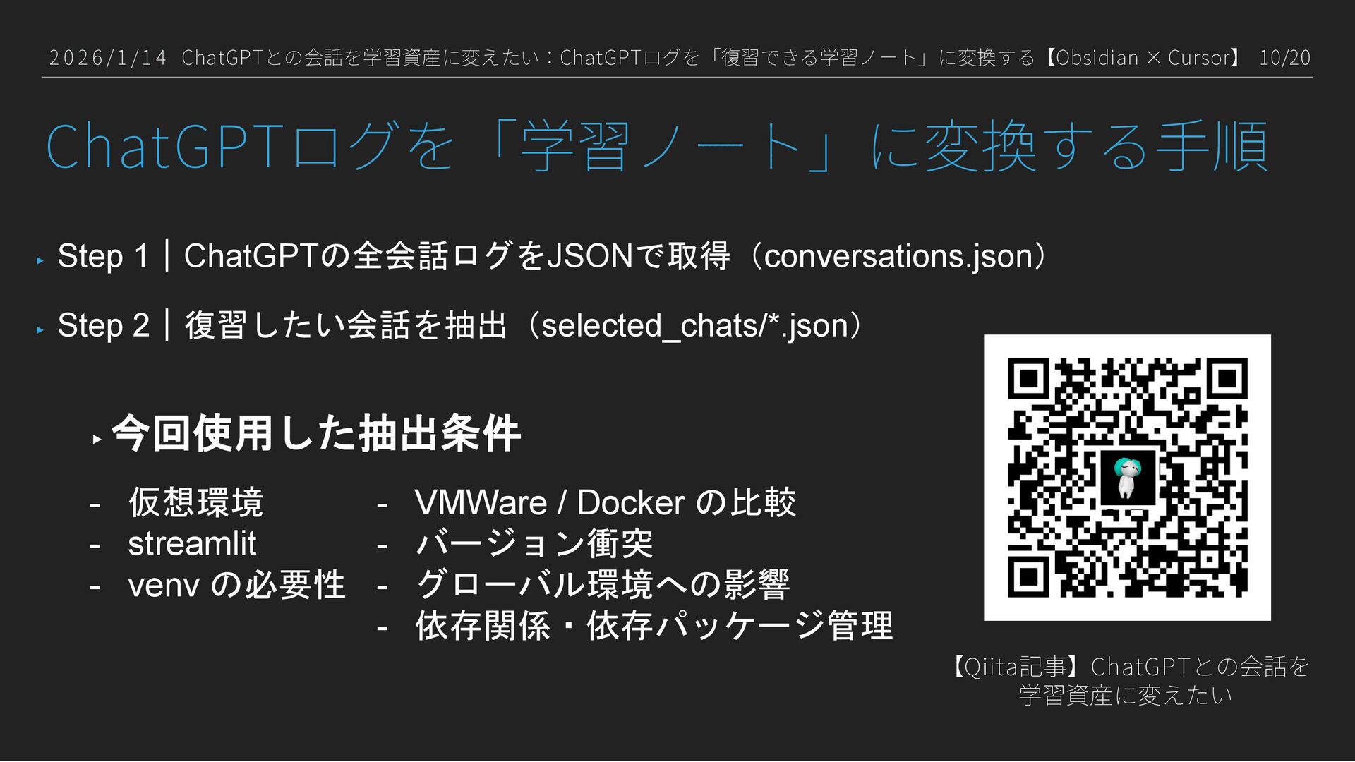 - streamlit - venv の必要性 - VMWare / Docker の比較 - バージョン衝突 - グローバル環境への影響 - 依存関係・依存パッケージ管理 2 0 2 6 /1 /1 4 ChatGPTとの会話を学習資産に変えたい:ChatGPTログを「復習できる学習ノート」に変換する【Obsidian × Cursor】 10/20 【Qiita記事】ChatGPTとの会話を 学習資産に変えたい