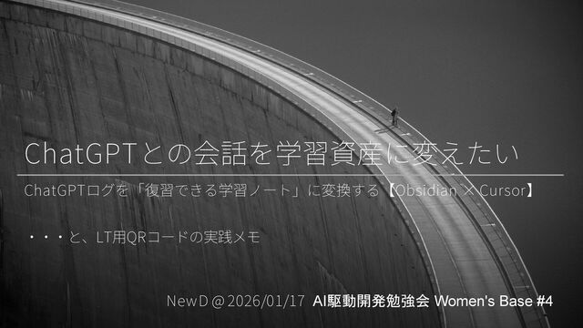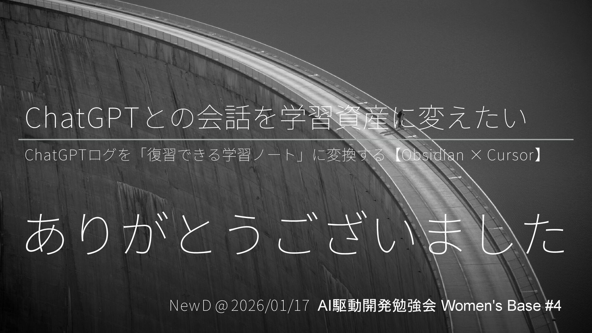 ChatGPTとの会話を学習資産に変えたい ChatGPTログを「復習できる学習ノート」に変換する【Obsidian × Cursor】 ありがとうございました NewD @ 2026/01/17 AI駆動開発勉強会 Women's