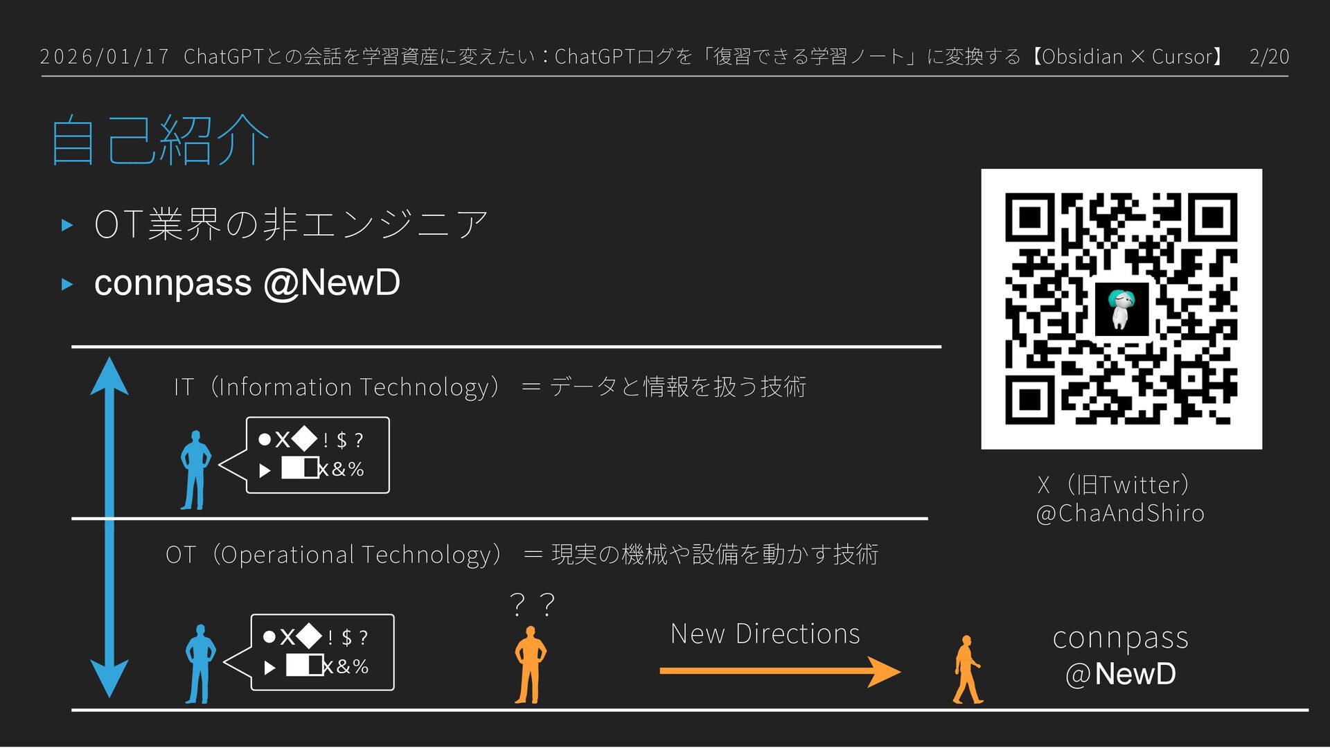 Technology) = 現実の機械や設備を動かす技術 •x◆!$? ?? •x◆!$? ▪ □ x&% 自己紹介 ▸ OT業界の非エンジニア ▸ connpass @NewD 2 0 2 6 /0 1 /1 7 ChatGPTとの会話を学習資産に変えたい:ChatGPTログを「復習できる学習ノート」に変換する【Obsidian × Cursor】 2/20 X(旧Twitter) @ChaAndShiro connpass @NewD