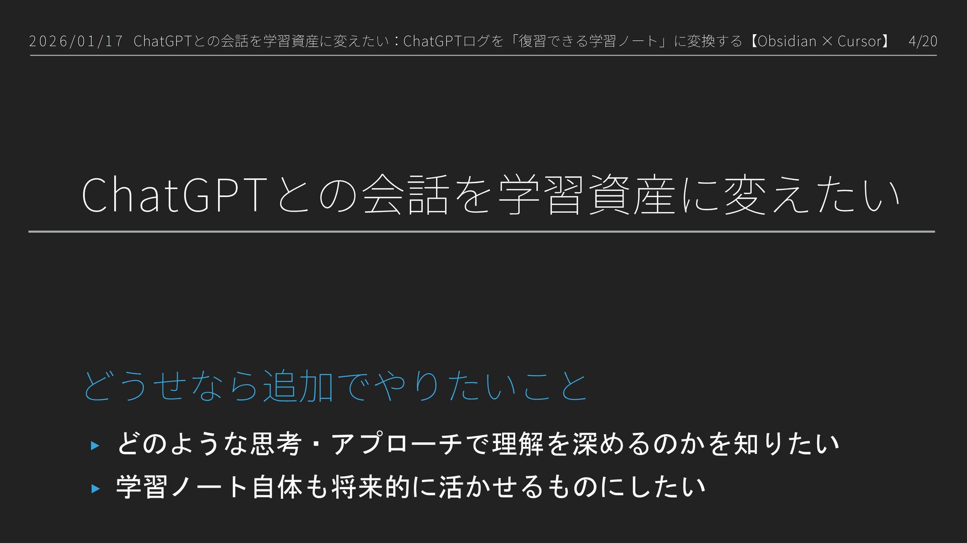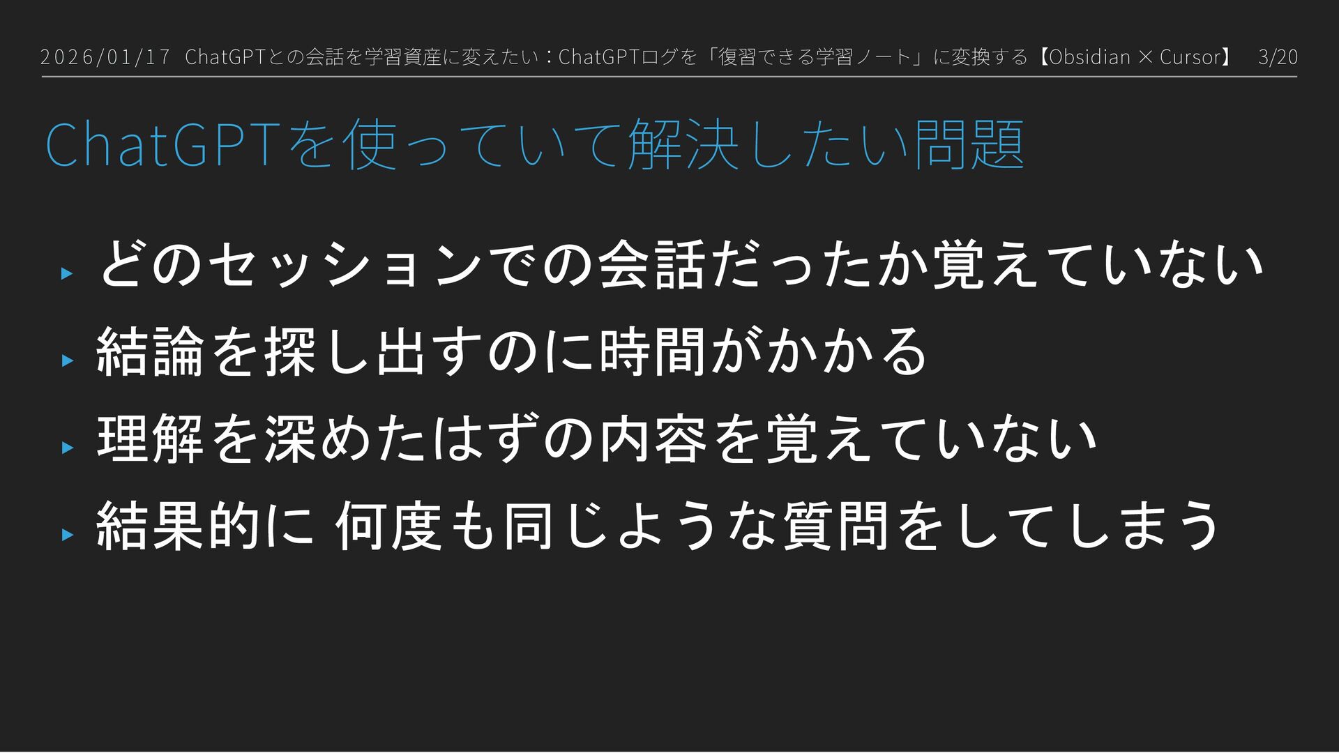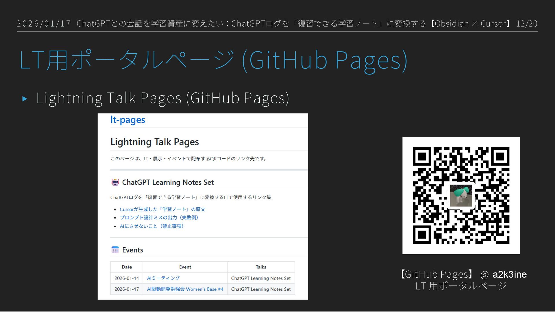 Lightning Talk Pages (GitHub Pages) 2 0 2 6 /0 1 /1 7 ChatGPTとの会話を学習資産に変えたい:ChatGPTログを「復習できる学習ノート」に変換する【Obsidian × Cursor】 12/20