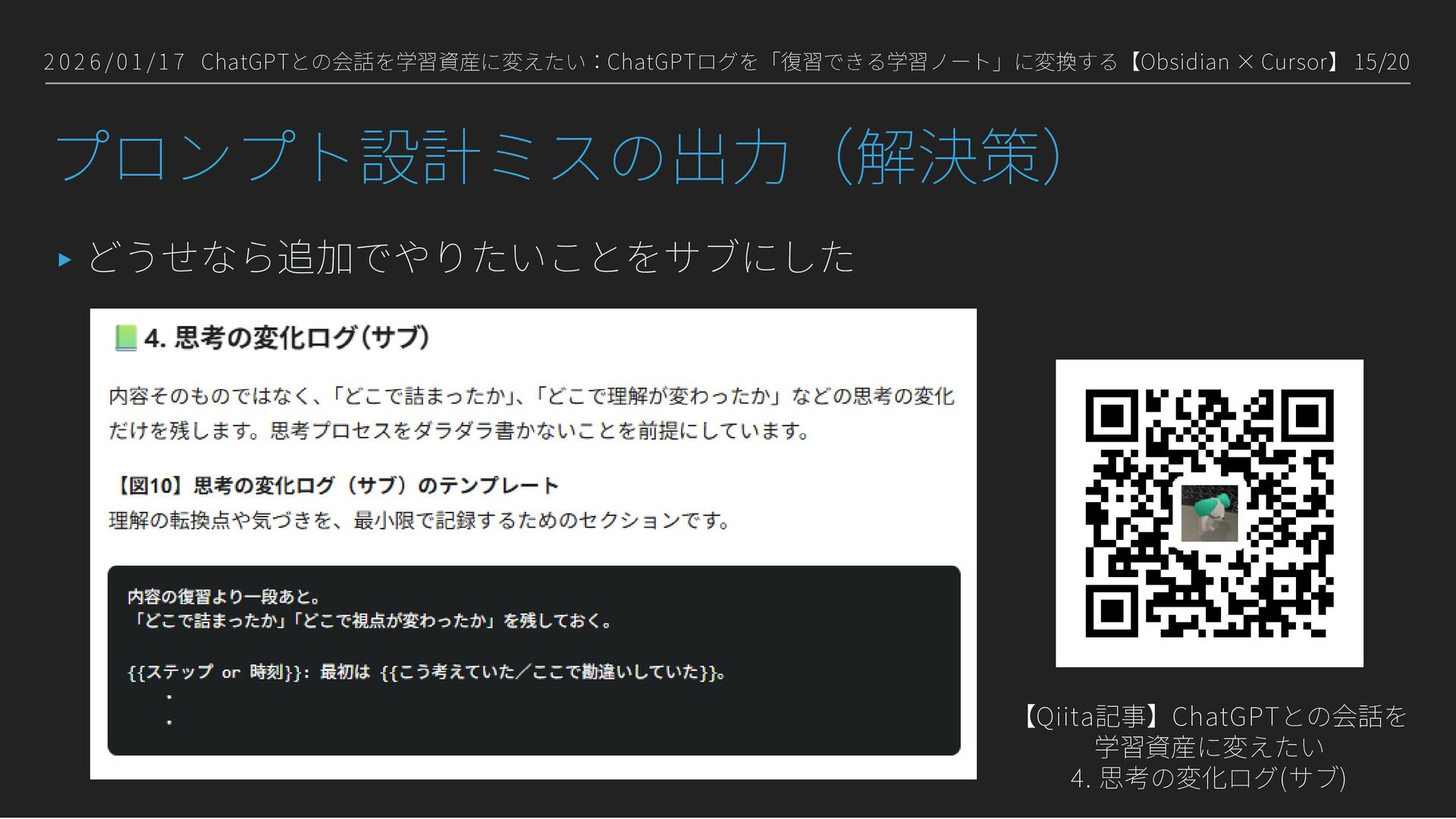プロンプト設計ミスの出力(解決策) ▸どうせなら追加でやりたいことをサブにした 【Qiita記事】ChatGPTとの会話を 学習資産に変えたい 4. 思考の変化ログ(サブ) 2 0 2 6