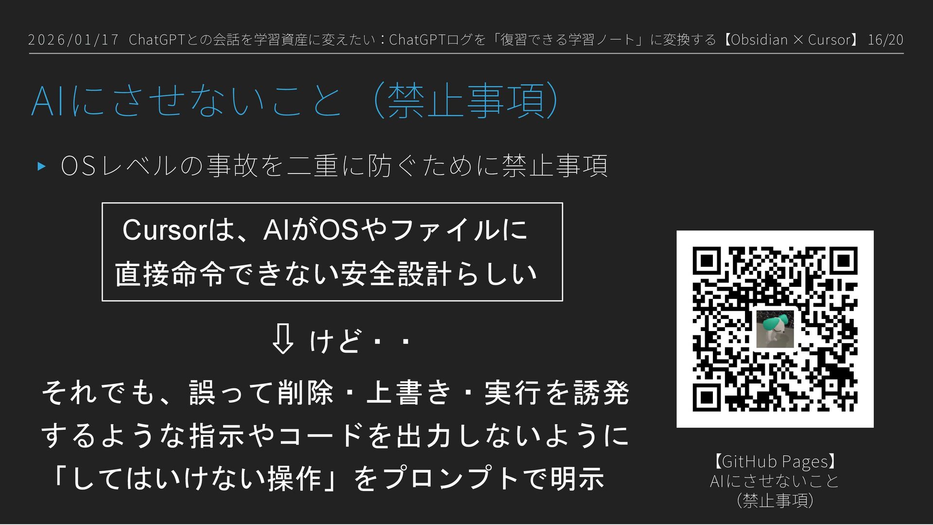 直接命令できない安全設計らしい それでも、誤って削除・上書き・実行を誘発 するような指示やコードを出力しないように 「してはいけない操作」をプロンプトで明示 2 0 2 6 /0 1 /1 7 ChatGPTとの会話を学習資産に変えたい:ChatGPTログを「復習できる学習ノート」に変換する【Obsidian × Cursor】 16/20