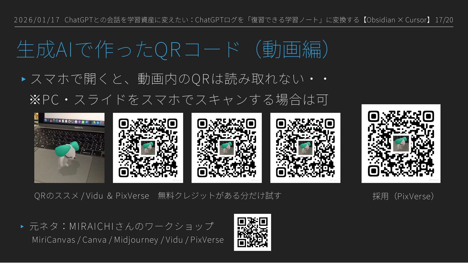 / PixVerse QRのススメ / Vidu & PixVerse 無料クレジットがある分だけ試す ▸スマホで開くと、動画内のQRは読み取れない・・ ※PC・スライドをスマホでスキャンする場合は可 採用(PixVerse) 2 0 2 6 /0 1 /1 7 ChatGPTとの会話を学習資産に変えたい:ChatGPTログを「復習できる学習ノート」に変換する【Obsidian × Cursor】 17/20