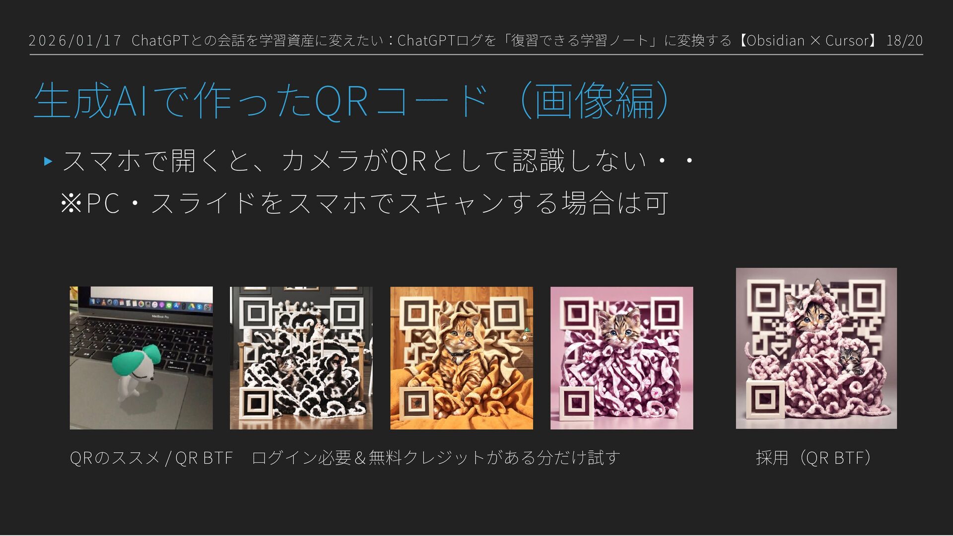 7 ChatGPTとの会話を学習資産に変えたい:ChatGPTログを「復習できる学習ノート」に変換する【Obsidian × Cursor】 18/20 QRのススメ / QR BTF ログイン必要&無料クレジットがある分だけ試す ▸スマホで開くと、カメラがQRとして認識しない・・ ※PC・スライドをスマホでスキャンする場合は可
