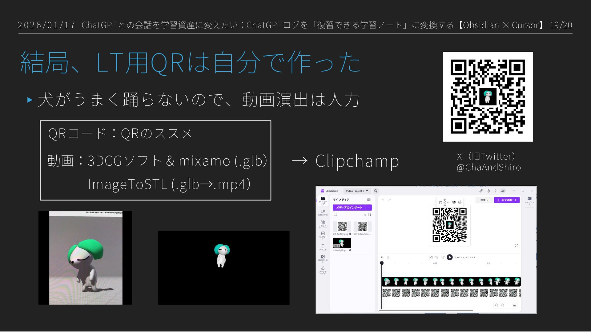 (.glb→.mp4) X(旧Twitter) @ChaAndShiro 2 0 2 6 /0 1 /1 7 ChatGPTとの会話を学習資産に変えたい:ChatGPTログを「復習できる学習ノート」に変換する【Obsidian × Cursor】 19/20
