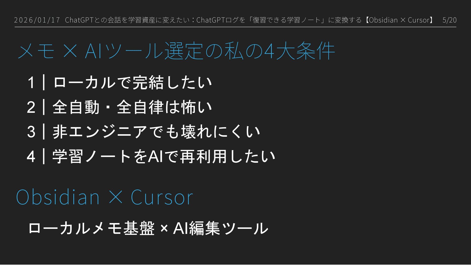2 0 2 6 /0 1 /1 7 ChatGPTとの会話を学習資産に変えたい:ChatGPTログを「復習できる学習ノート」に変換する【Obsidian × Cursor】 9/20 12/13 記事公開に間に合う