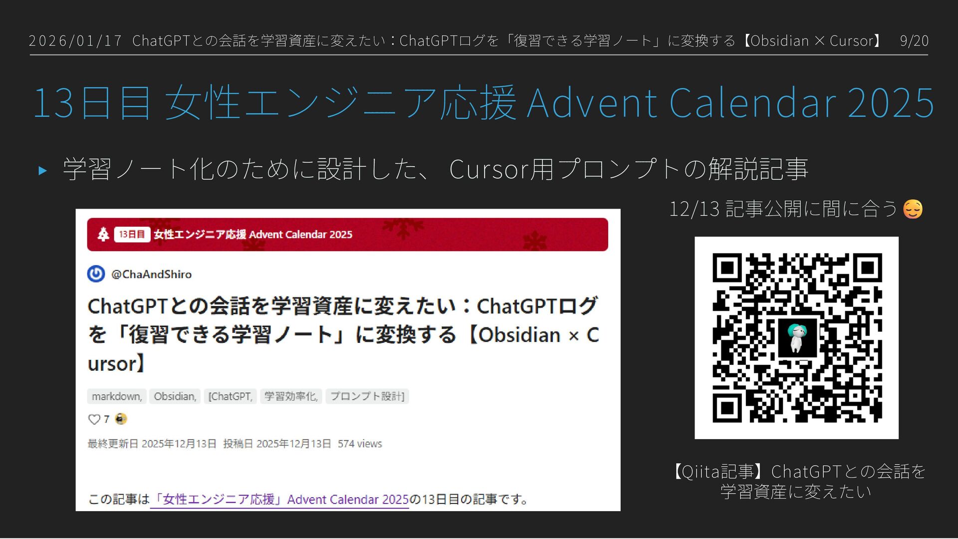 【Qiita】女性エンジニア応援 Advent Calendar 2025 2 0 2 6 /0 1 /1 7 ChatGPTとの会話を学習資産に変えたい:ChatGPTログを「復習できる学習ノート」に変換する【Obsidian × Cursor】 8/20