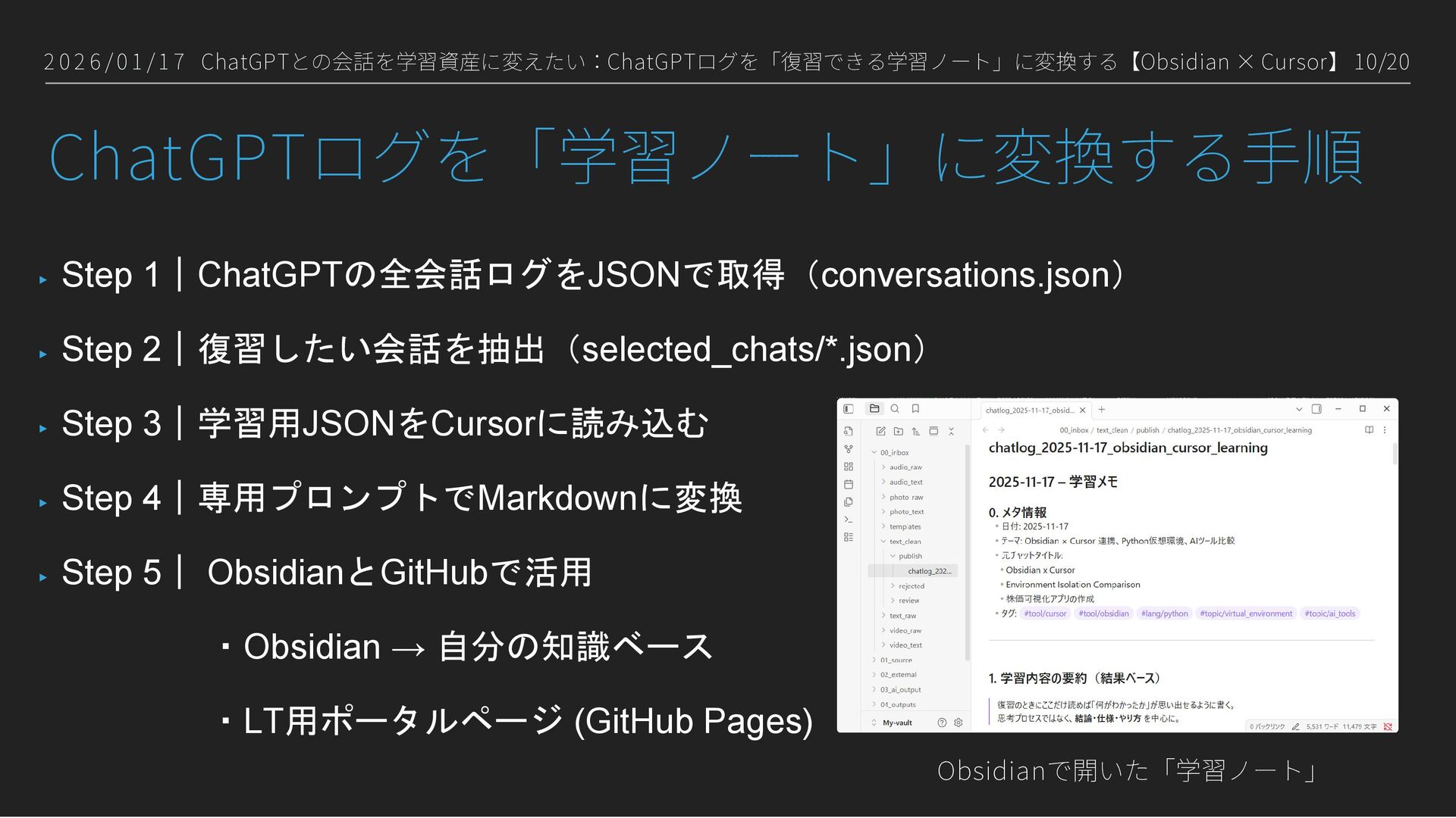 ▸ Step 4|専用プロンプトでMarkdownに変換 ▸ Step 5| ObsidianとGitHubで活用 ・Obsidian → 自分の知識ベース ・LT用ポータルページ (GitHub Pages) Obsidianで開いた「学習ノート」 2 0 2 6 /0 1 /1 7 ChatGPTとの会話を学習資産に変えたい:ChatGPTログを「復習できる学習ノート」に変換する【Obsidian × Cursor】 10/20