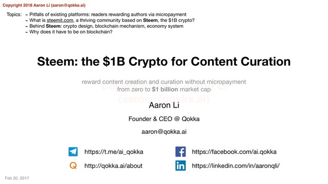 Topics covered: 1) Pitfalls of existing platforms: readers rewarding authors via micropayment 2) What is steemit.com, a thriving community based on Steem, the $1B crypto? 3) Behind Steem: crypto design, blockchain mechanism, economy system 4) Why does it have to be on blockchain?