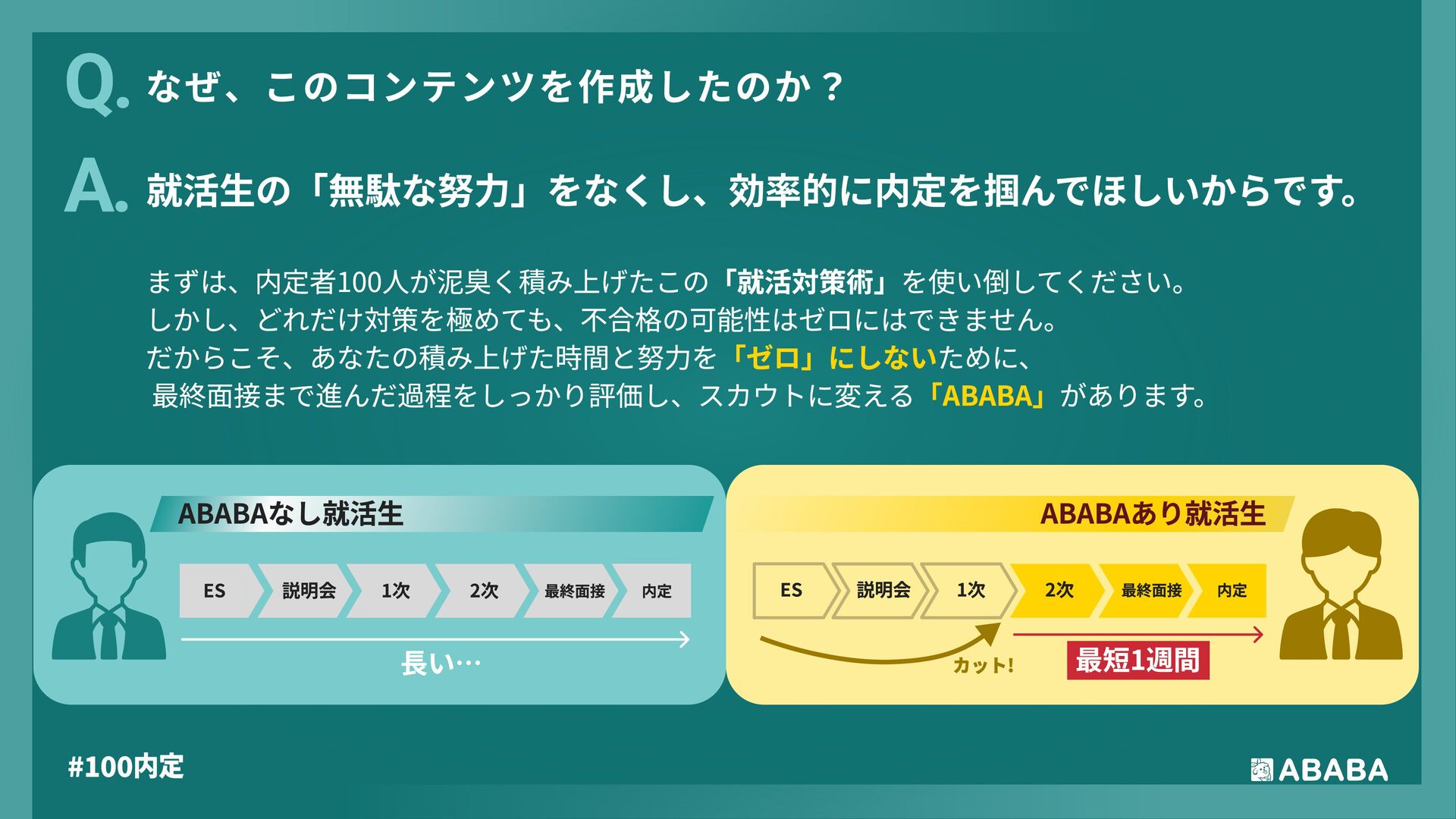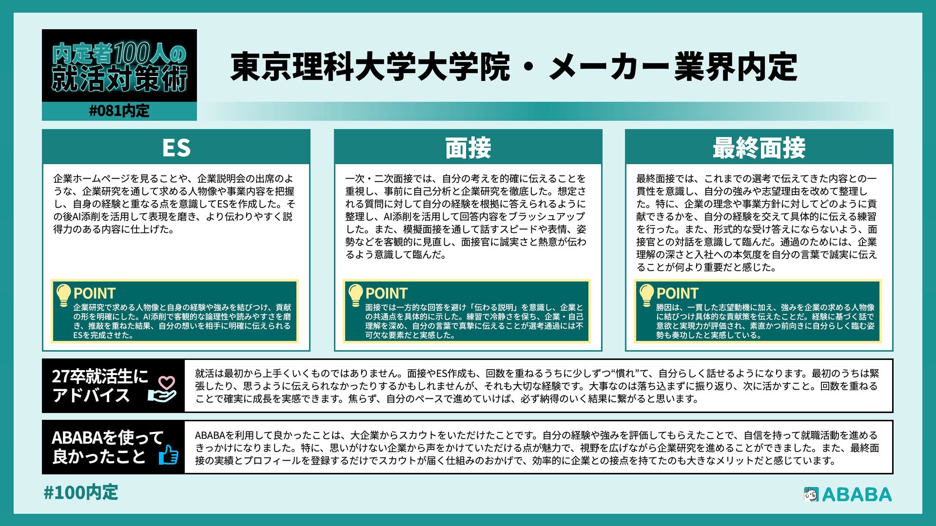 8. #100内 選考結果が単なる「お祈り」で終わらず、その過程を評価してスカウトという形で「次」に繋げられる点は、精神的に非常に大きな支えとなりました。お祈りメールが届い た際の喪失感を、ABABAが新たな企業との出会いという前向きな機会に変換してくれるため、モチベーションを切らさずに就職活動を継続できました。最終面接の実績を評 価する企業からのスカウトにより、自分の努力が否定されず資産として積み上がっていることを実感でき、心強かったです ABABAを使っz 良かったこ 就活は正解を探すゲームではなく、自分という商品をどのように見せ、相手に納得してもらうかという「戦略」の連続です。ESで事実を絞り面接で熱意を語る「情報の出し引 き」を意識すれば、主導権を握った対話ができるようになります。不安な時はAIやツールを賢く頼って効率化し、浮いた時間を「自分はどうありたいか」の深掘りに充ててくだ さい。自らの意思で選んだ道であれば、どんな結果も必ず将来の糧になります。自分を信じて、一歩ずつ力強く進んでいきましょう 27卒就活生Ä