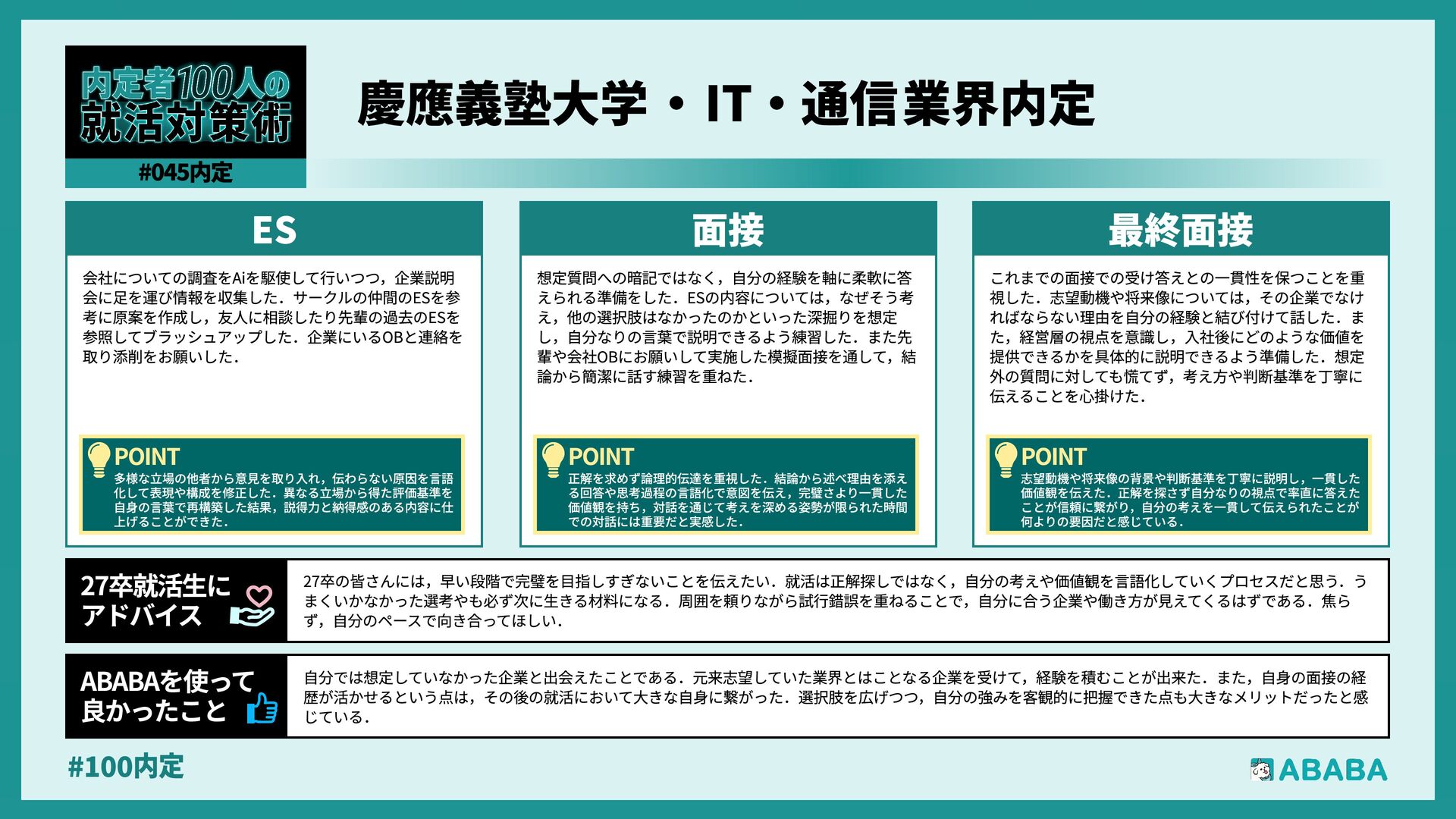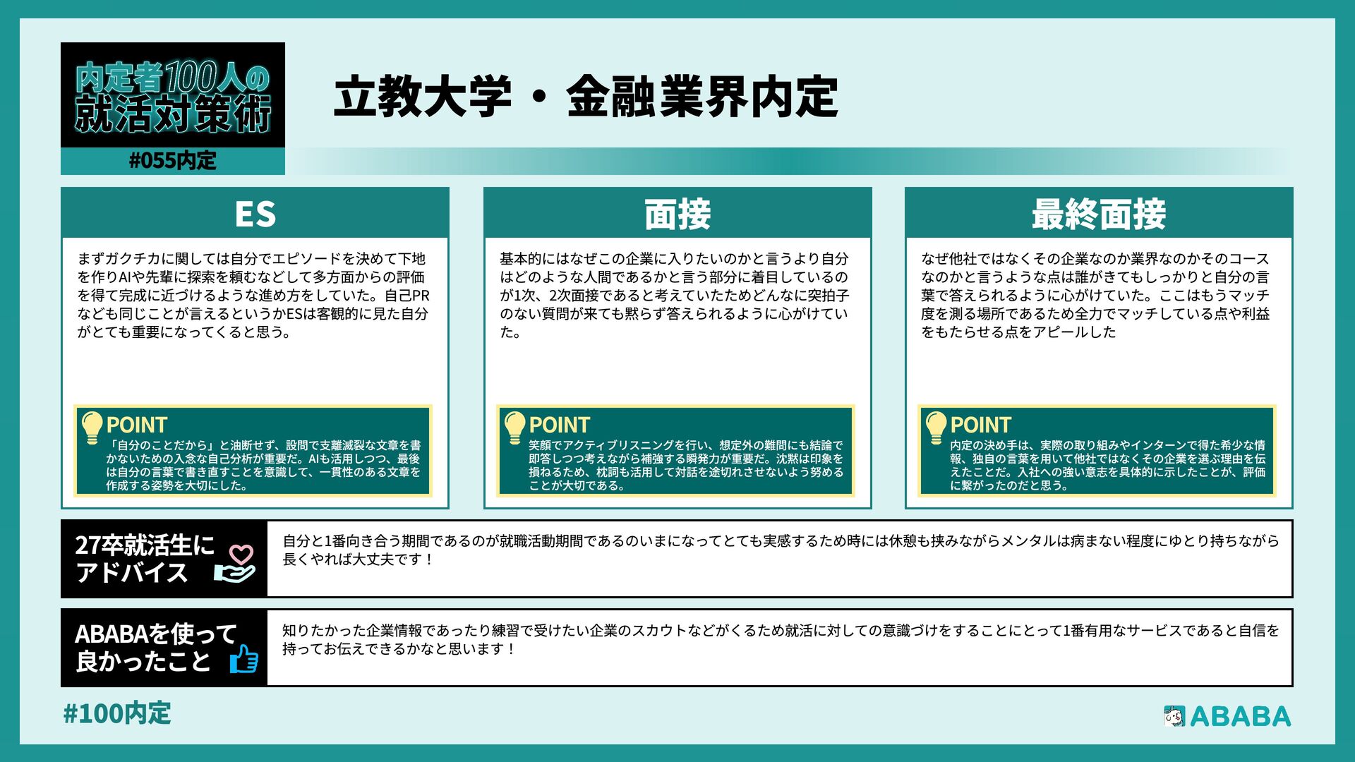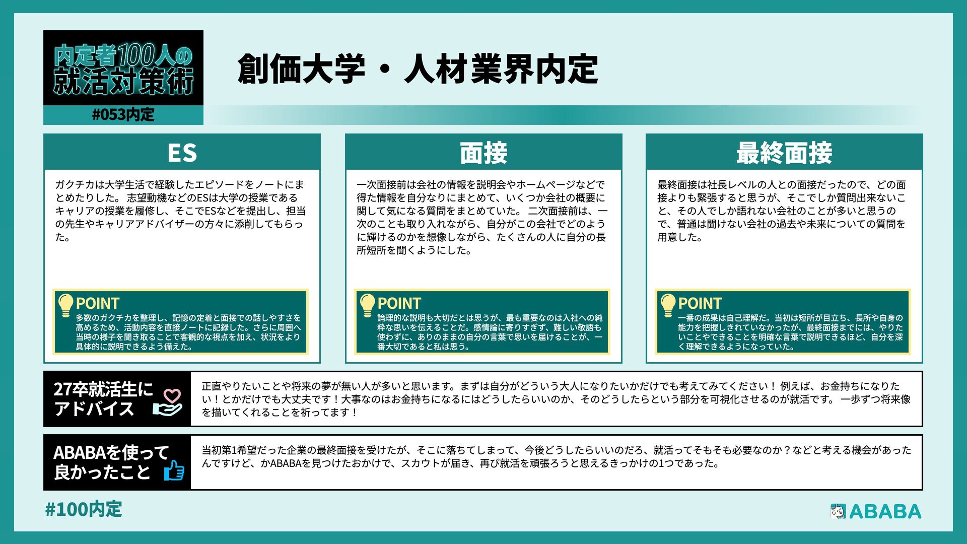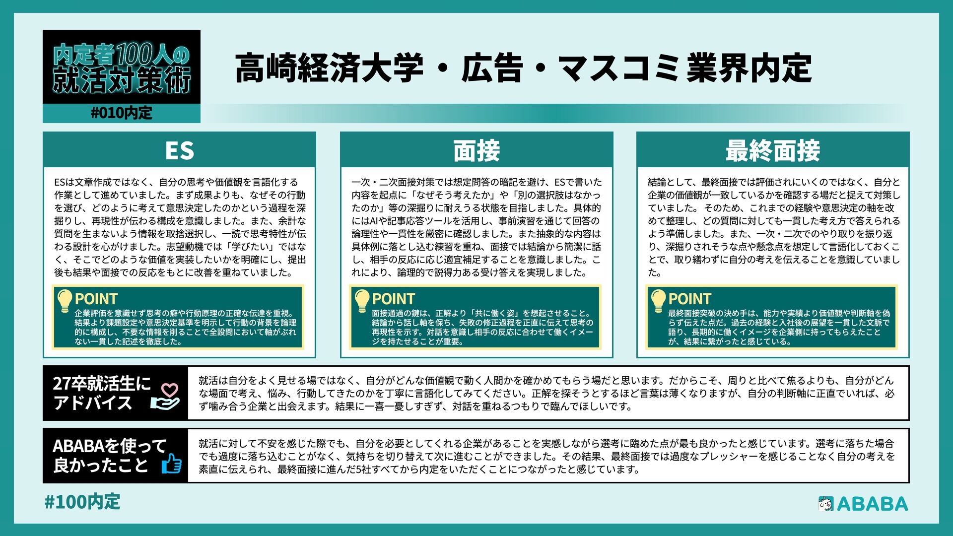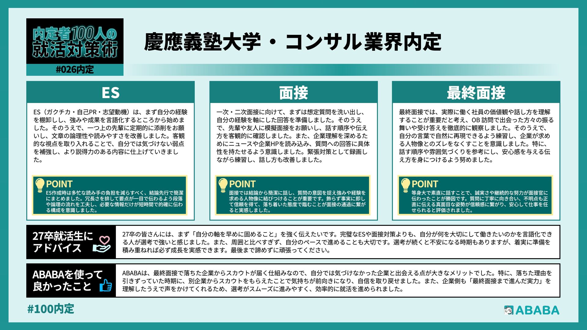 10. #100内 業界を広く見られるようになることです。おそらく多くの人が、懸けていた最終面接に落ちた時に登録することになると思いますが、私は業界を絞ってかなり 狭く見ていたため、企業からのスカウトが届いた時に、私のビジョンに近い企業が他の業界にもこんなにあったのか、と知りました。最終的にはABABAにご紹 介頂いたのとは別の企業に行くことになりましたが、近視眼的な企業選びを大きく広げてくれました ABABAを使っ 良かったこ 就活では、特別な経験を増やすより、自分が何を考えて行動してきたかを言語化することが重要です。早い段階で軸を整理し、ESや面接で一貫して伝えられる よう準備することが、結果的に選考を安定させる近道です。私自身もかなり苦労しましたし、緊張でダメにした面接はかなり落ち込みました。ですが、もがい ている中であなたにぴったりの企業に出会えると思います。何があっても前向きに頑張ってください 27卒就活生Ç