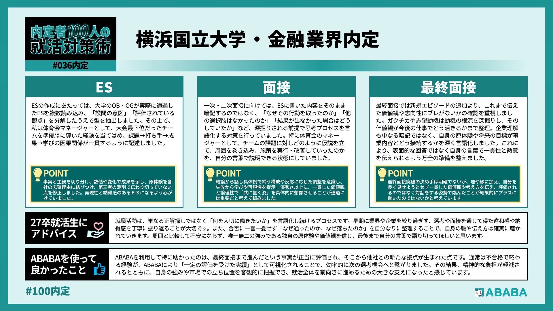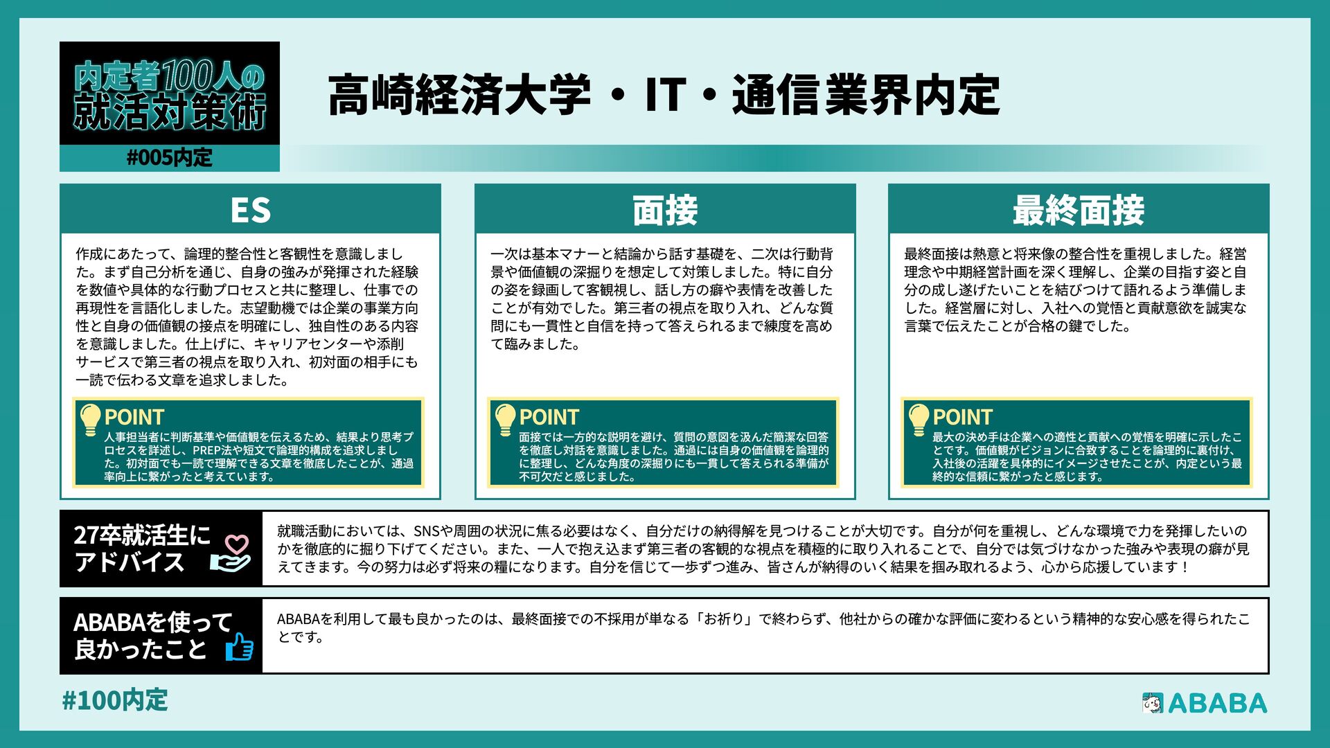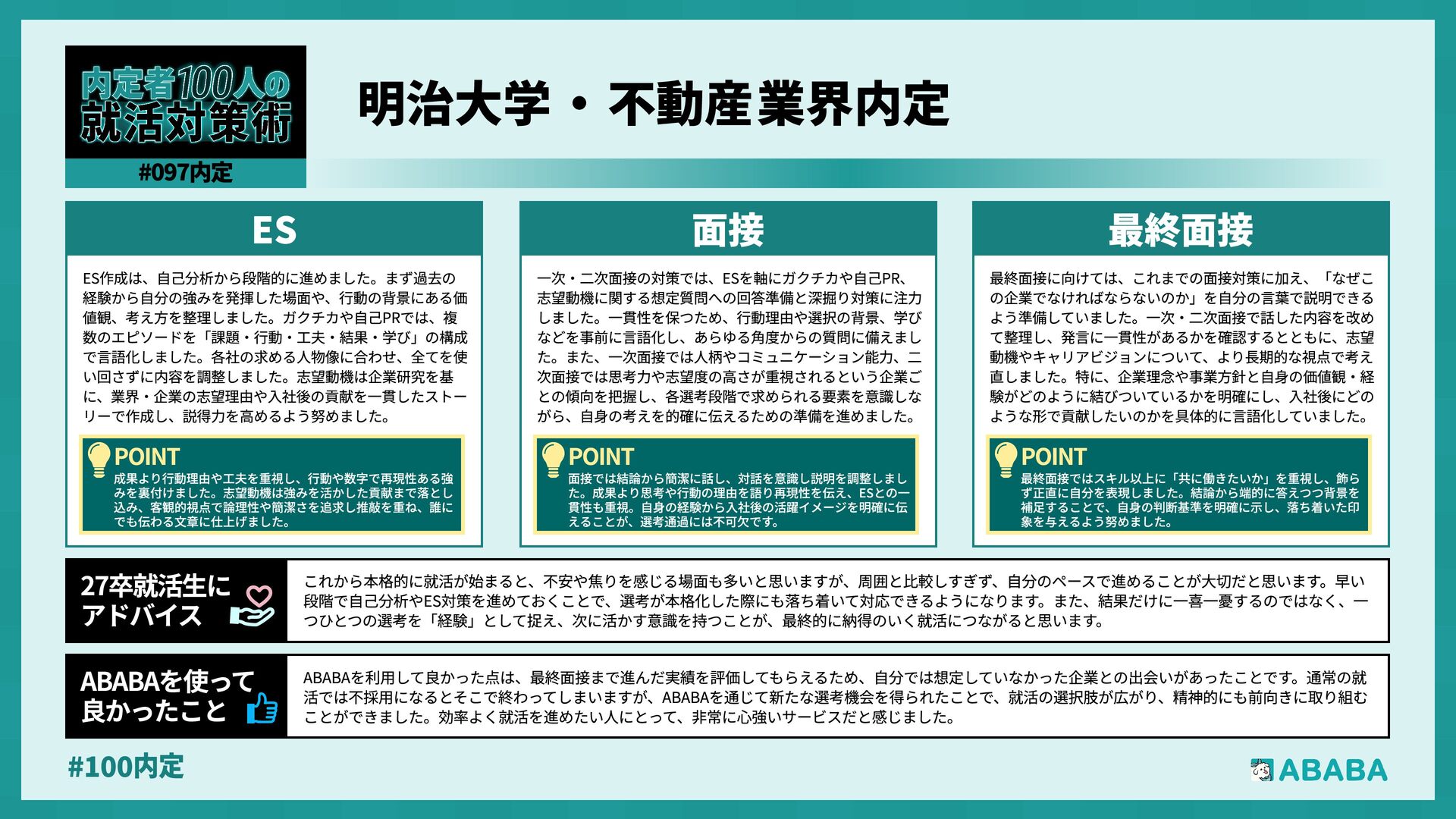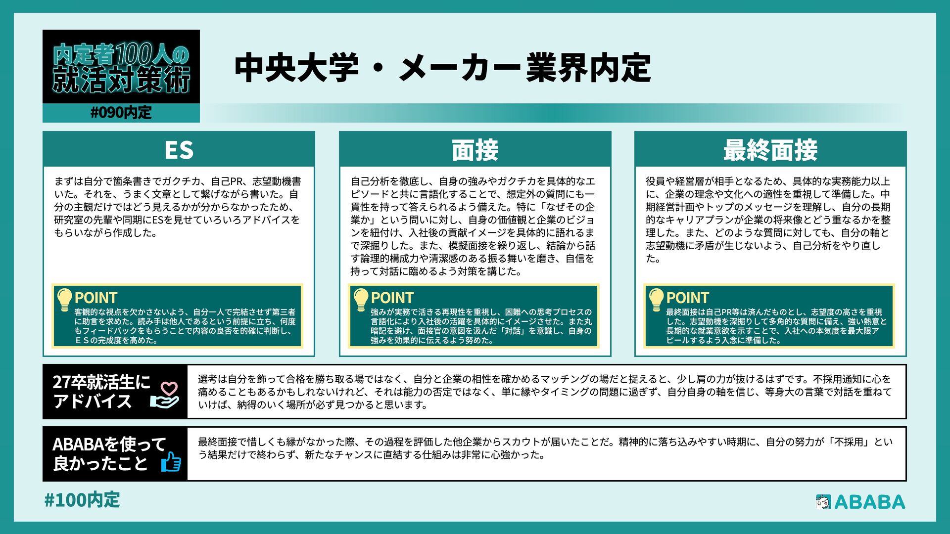 10. #100内 業界を広く見られるようになることです。おそらく多くの人が、懸けていた最終面接に落ちた時に登録することになると思いますが、私は業界を絞ってかなり 狭く見ていたため、企業からのスカウトが届いた時に、私のビジョンに近い企業が他の業界にもこんなにあったのか、と知りました。最終的にはABABAにご紹 介頂いたのとは別の企業に行くことになりましたが、近視眼的な企業選びを大きく広げてくれました ABABAを使っ 良かったこ 就活では、特別な経験を増やすより、自分が何を考えて行動してきたかを言語化することが重要です。早い段階で軸を整理し、ESや面接で一貫して伝えられる よう準備することが、結果的に選考を安定させる近道です。私自身もかなり苦労しましたし、緊張でダメにした面接はかなり落ち込みました。ですが、もがい ている中であなたにぴったりの企業に出会えると思います。何があっても前向きに頑張ってください 27卒就活生Ç