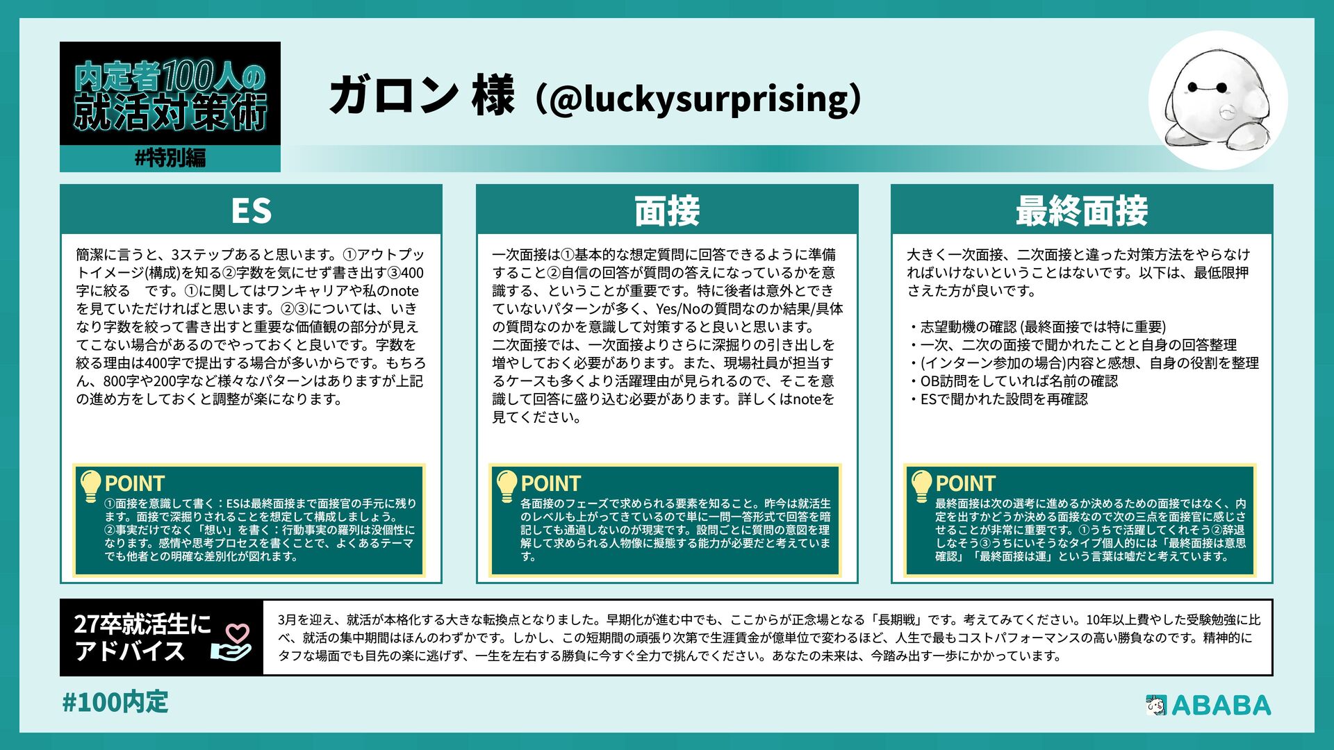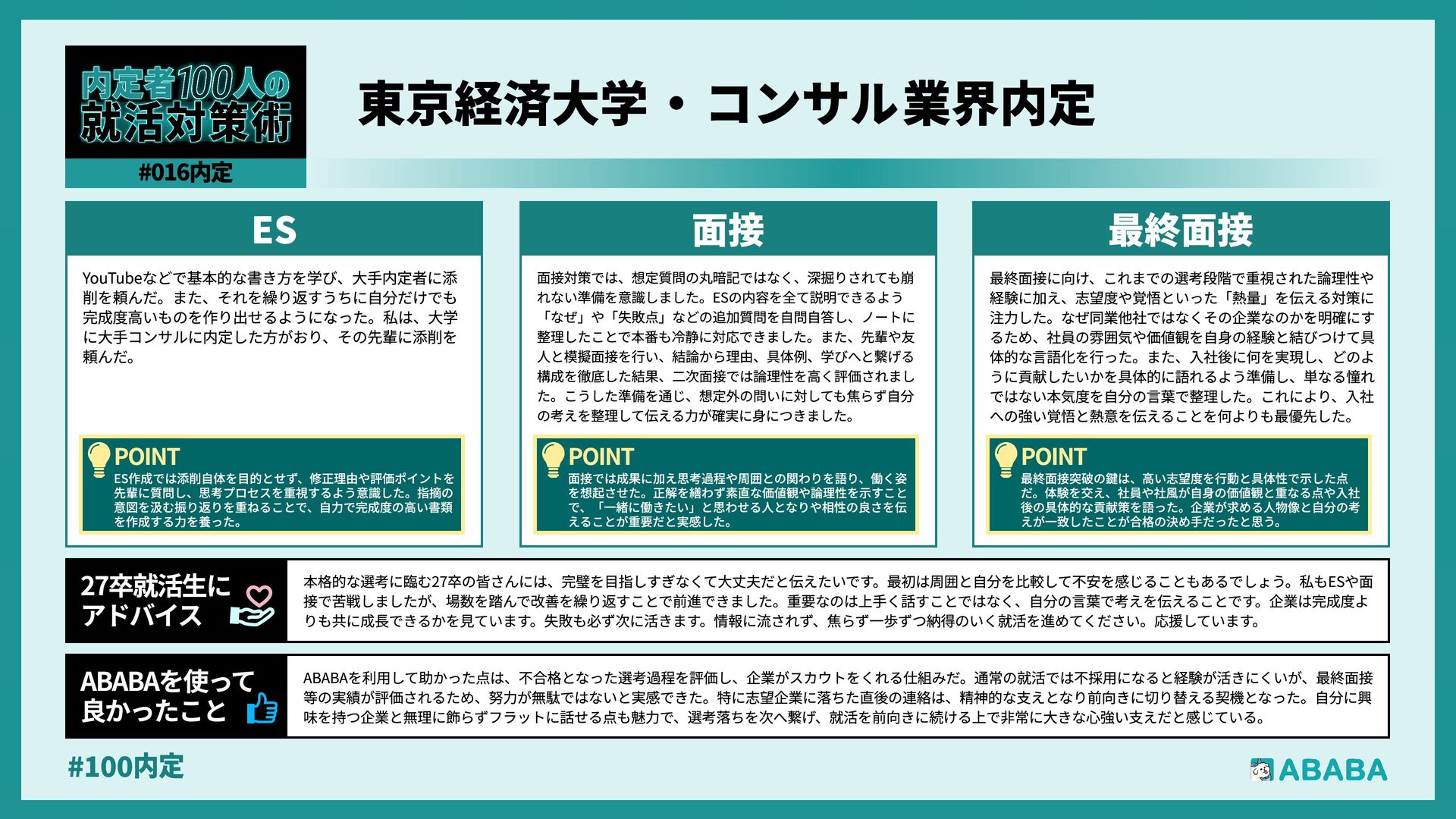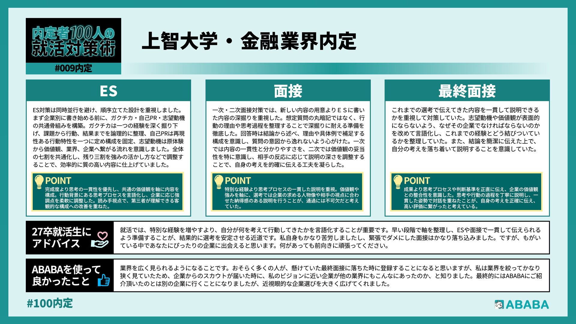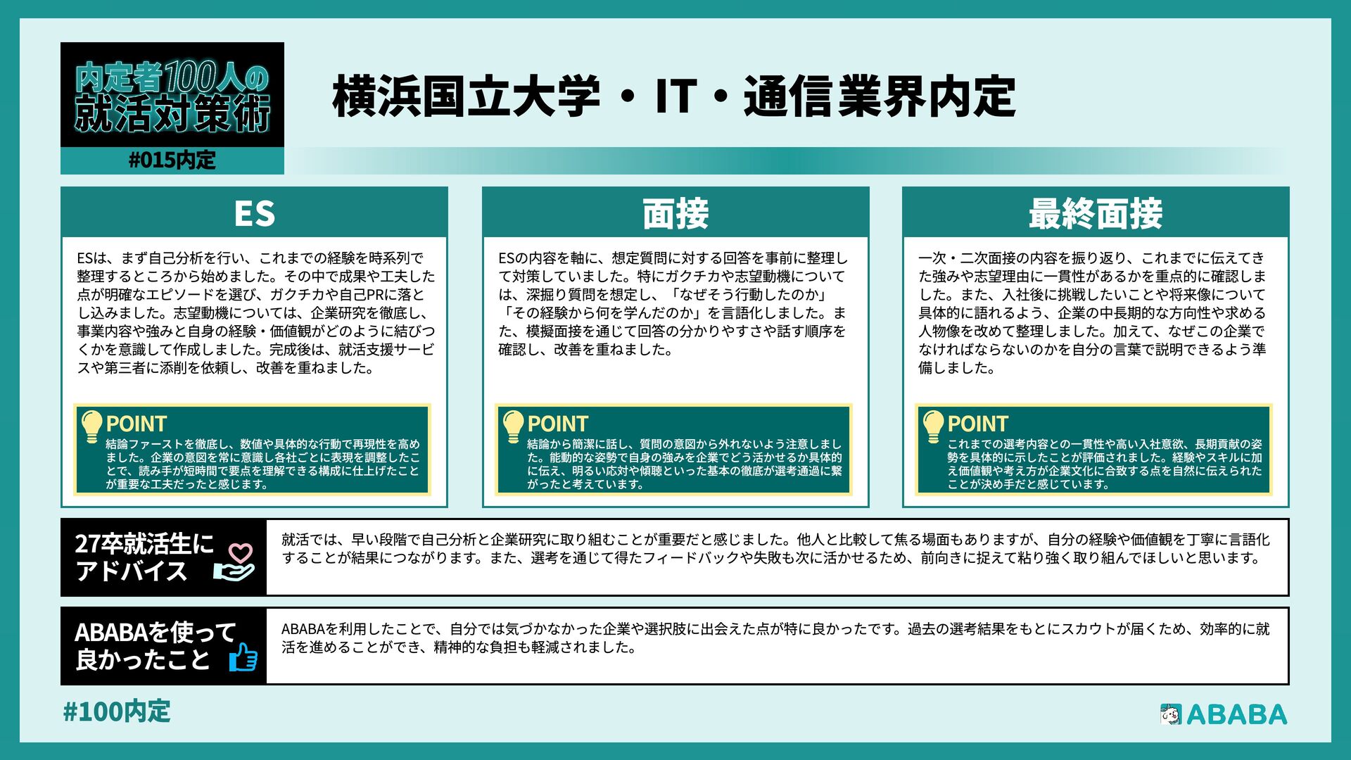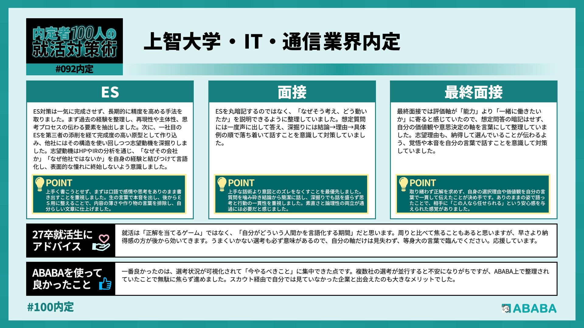 10. #100内 業界を広く見られるようになることです。おそらく多くの人が、懸けていた最終面接に落ちた時に登録することになると思いますが、私は業界を絞ってかなり 狭く見ていたため、企業からのスカウトが届いた時に、私のビジョンに近い企業が他の業界にもこんなにあったのか、と知りました。最終的にはABABAにご紹 介頂いたのとは別の企業に行くことになりましたが、近視眼的な企業選びを大きく広げてくれました ABABAを使っ 良かったこ 就活では、特別な経験を増やすより、自分が何を考えて行動してきたかを言語化することが重要です。早い段階で軸を整理し、ESや面接で一貫して伝えられる よう準備することが、結果的に選考を安定させる近道です。私自身もかなり苦労しましたし、緊張でダメにした面接はかなり落ち込みました。ですが、もがい ている中であなたにぴったりの企業に出会えると思います。何があっても前向きに頑張ってください 27卒就活生Ç