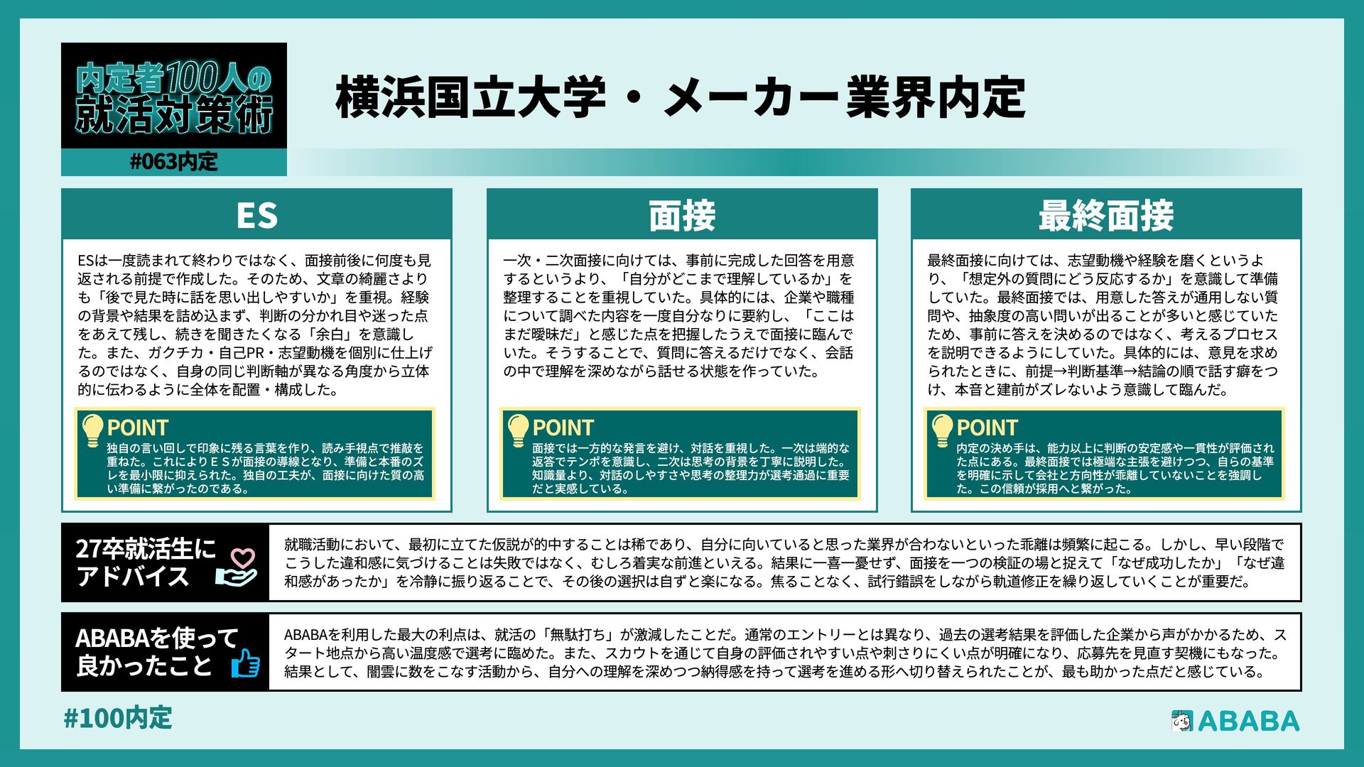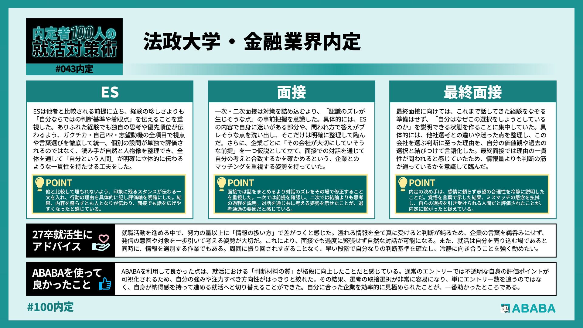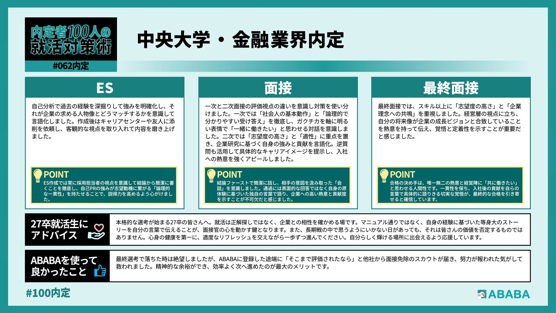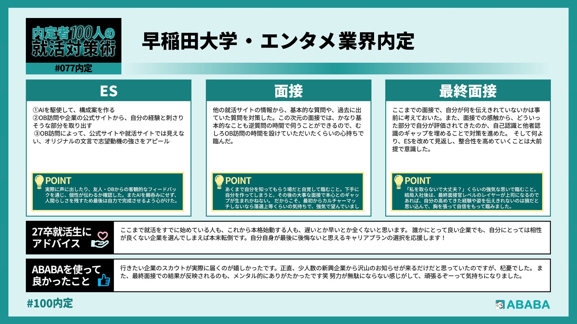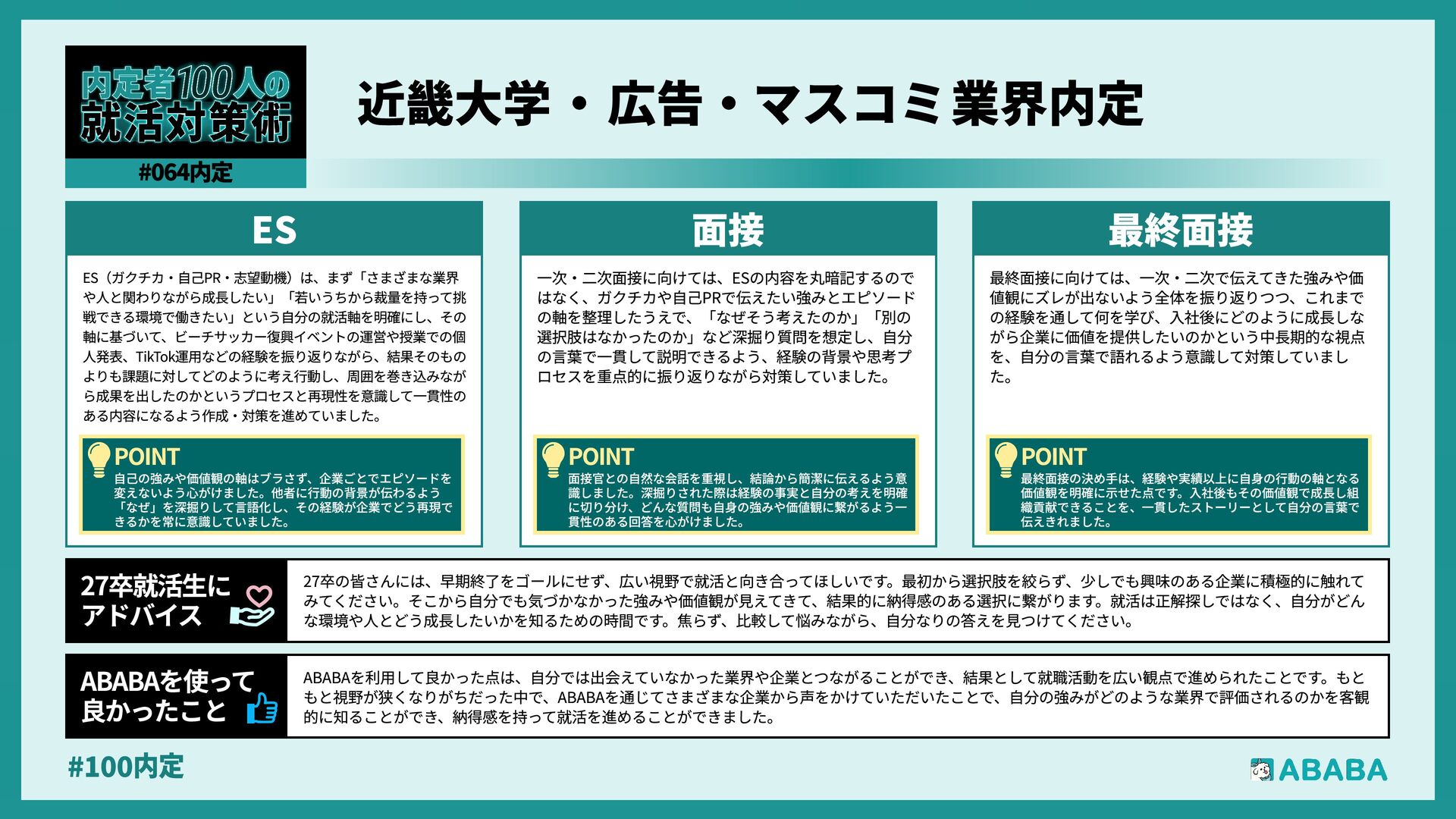 63. #100内 最終選考で落ちた時は絶望しましたが、ABABAに登録した途端に「そこまで評価されたなら」と他社から面接免除のスカウトが届き、努力が報われた気がして 救われました。精神的な余裕ができ、効率よく次へ進めたのが最大のメリットです ABABAを使っ‚ 良かったこ 本格的な選考が始まる27卒の皆さんへ。就活は正解探しではなく、企業との相性を確かめる場です。マニュアル通りではなく、自身の経験に基づいた等身大のストー リーを自分の言葉で伝えることが、面接官の心を動かす鍵となります。また、長期戦の中で思うようにいかない日があっても、それは皆さんの価値を否定するものでは ありません。心身の健康を第一に、適度なリフレッシュを交えながら一歩ずつ進んでください。自分らしく輝ける場所に出会えるよう応援しています 27卒就活生Ó アドバイ
