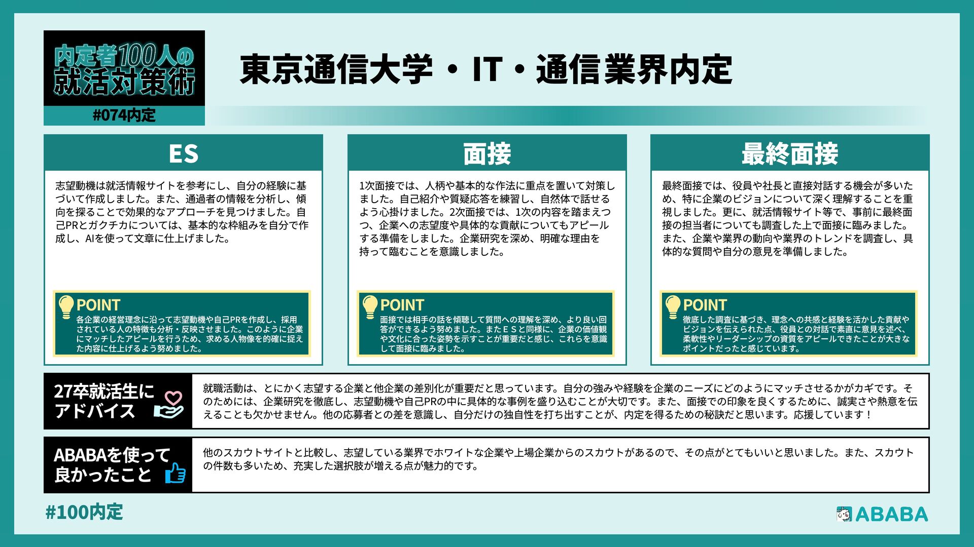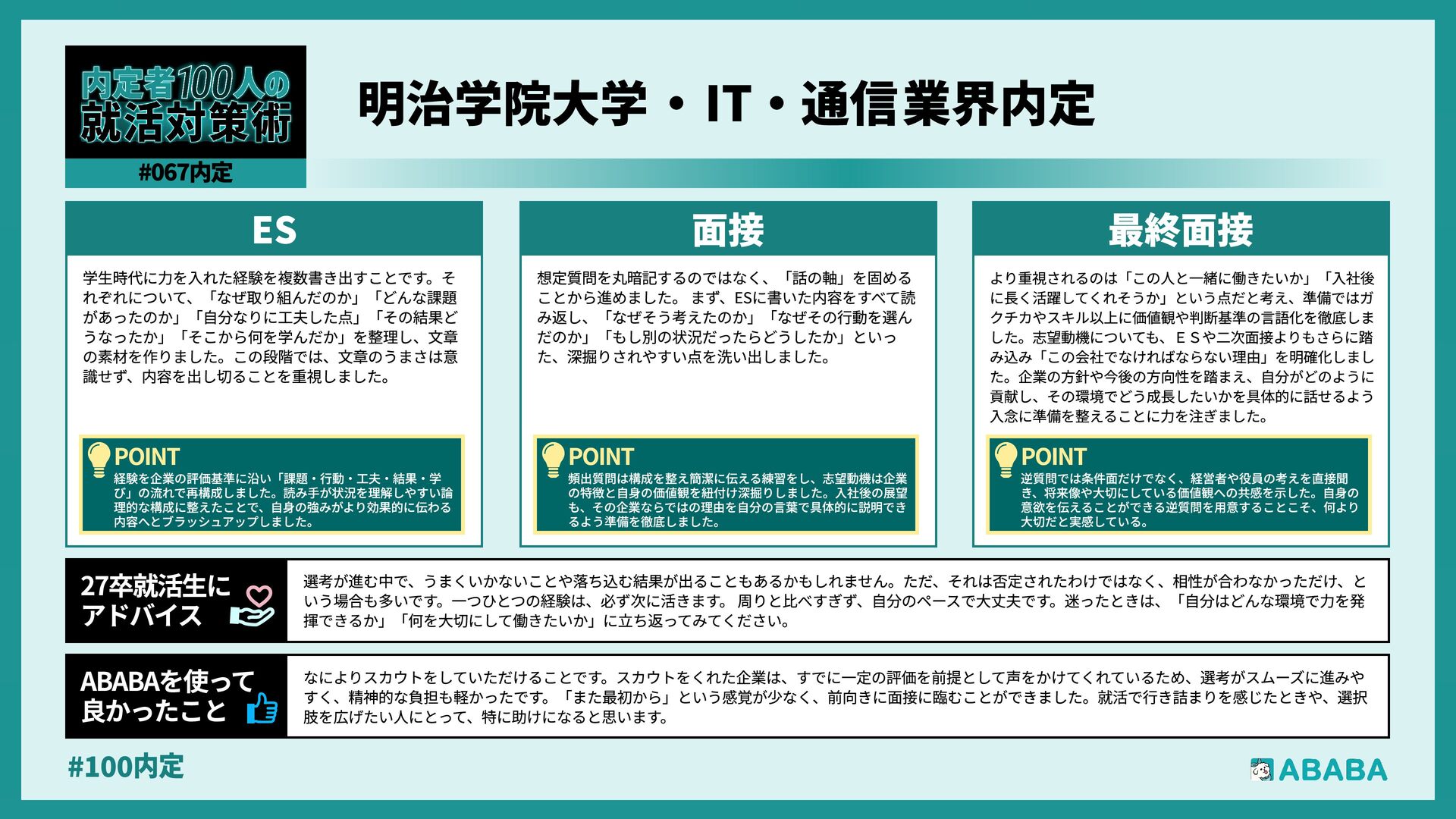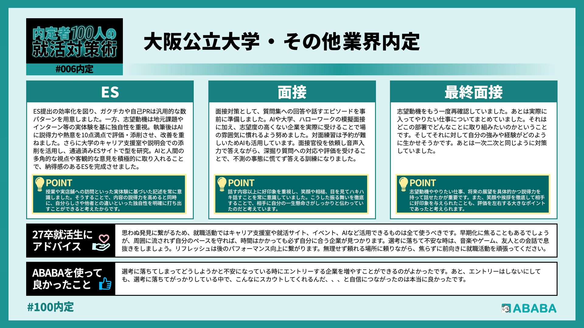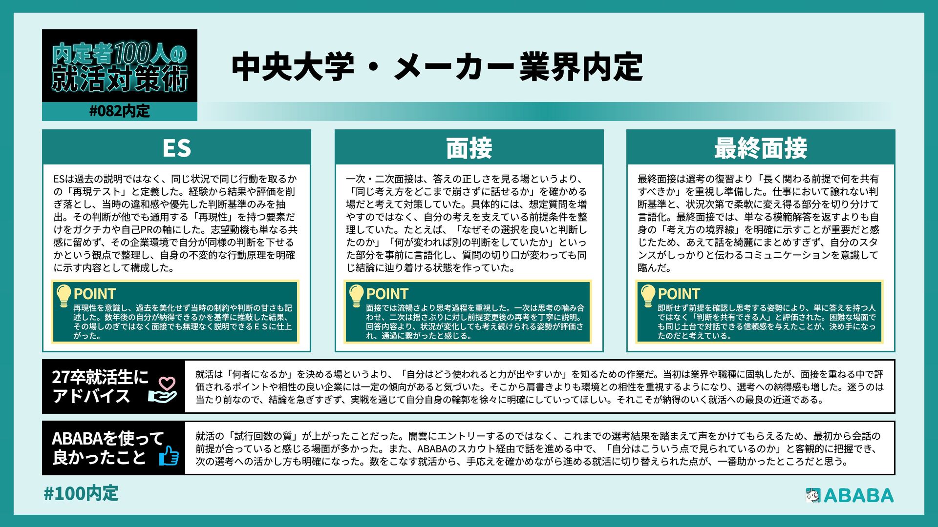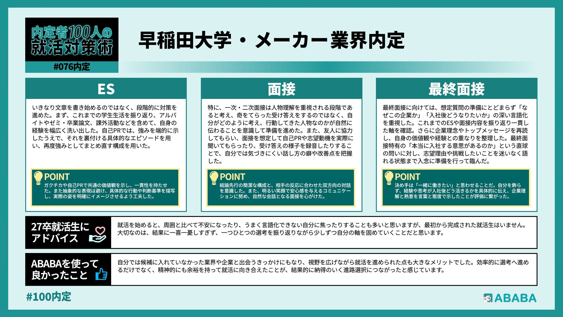 63. #100内 最終選考で落ちた時は絶望しましたが、ABABAに登録した途端に「そこまで評価されたなら」と他社から面接免除のスカウトが届き、努力が報われた気がして 救われました。精神的な余裕ができ、効率よく次へ進めたのが最大のメリットです ABABAを使っ‚ 良かったこ 本格的な選考が始まる27卒の皆さんへ。就活は正解探しではなく、企業との相性を確かめる場です。マニュアル通りではなく、自身の経験に基づいた等身大のストー リーを自分の言葉で伝えることが、面接官の心を動かす鍵となります。また、長期戦の中で思うようにいかない日があっても、それは皆さんの価値を否定するものでは ありません。心身の健康を第一に、適度なリフレッシュを交えながら一歩ずつ進んでください。自分らしく輝ける場所に出会えるよう応援しています 27卒就活生Ó アドバイ