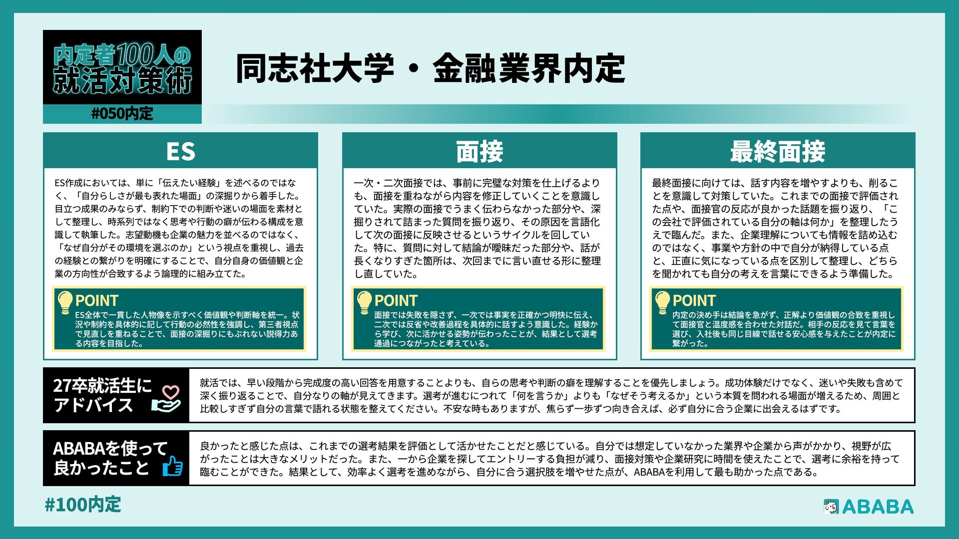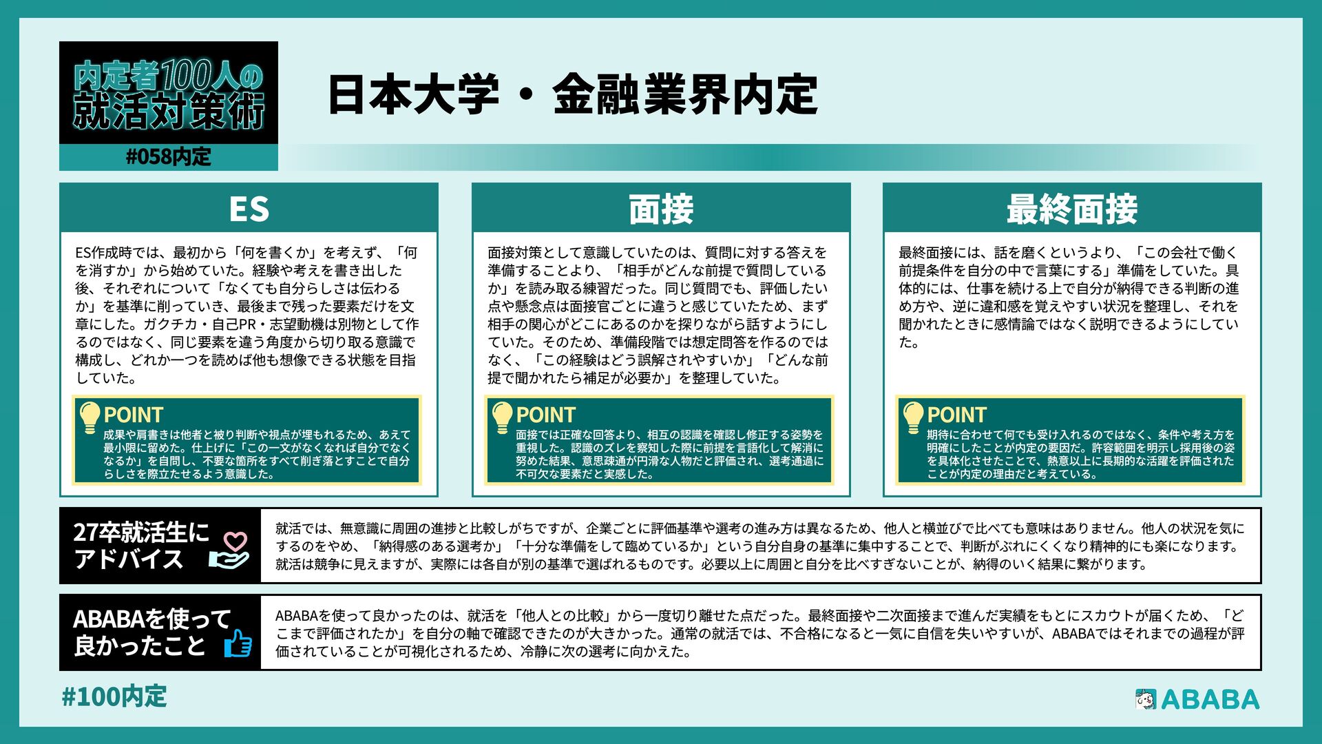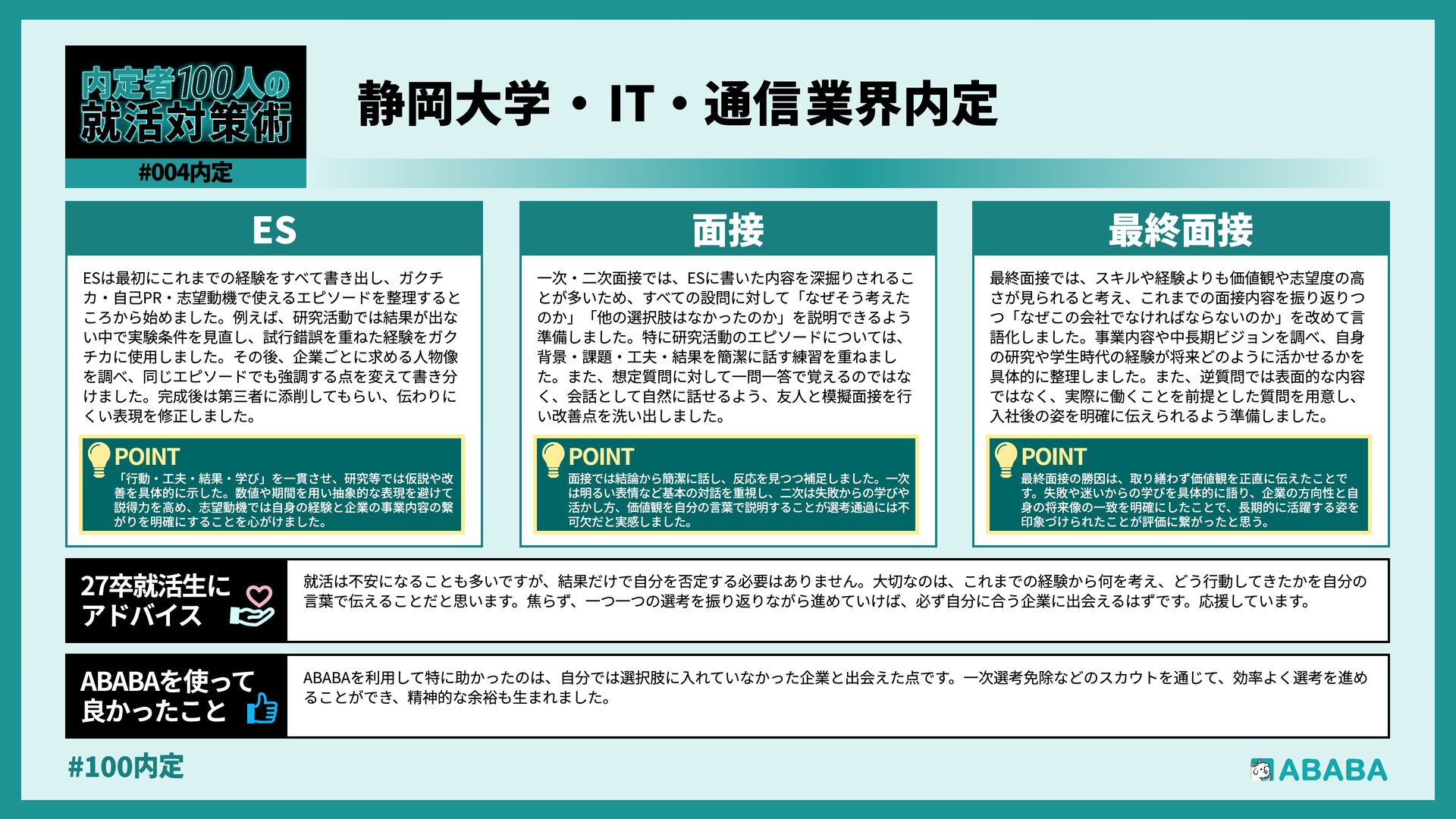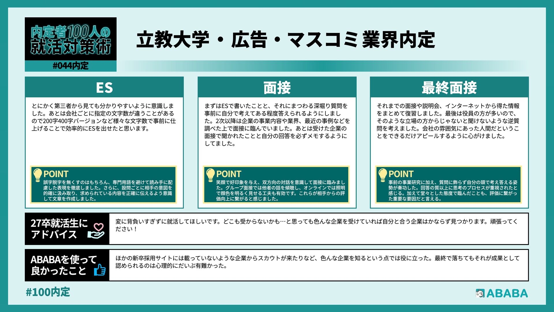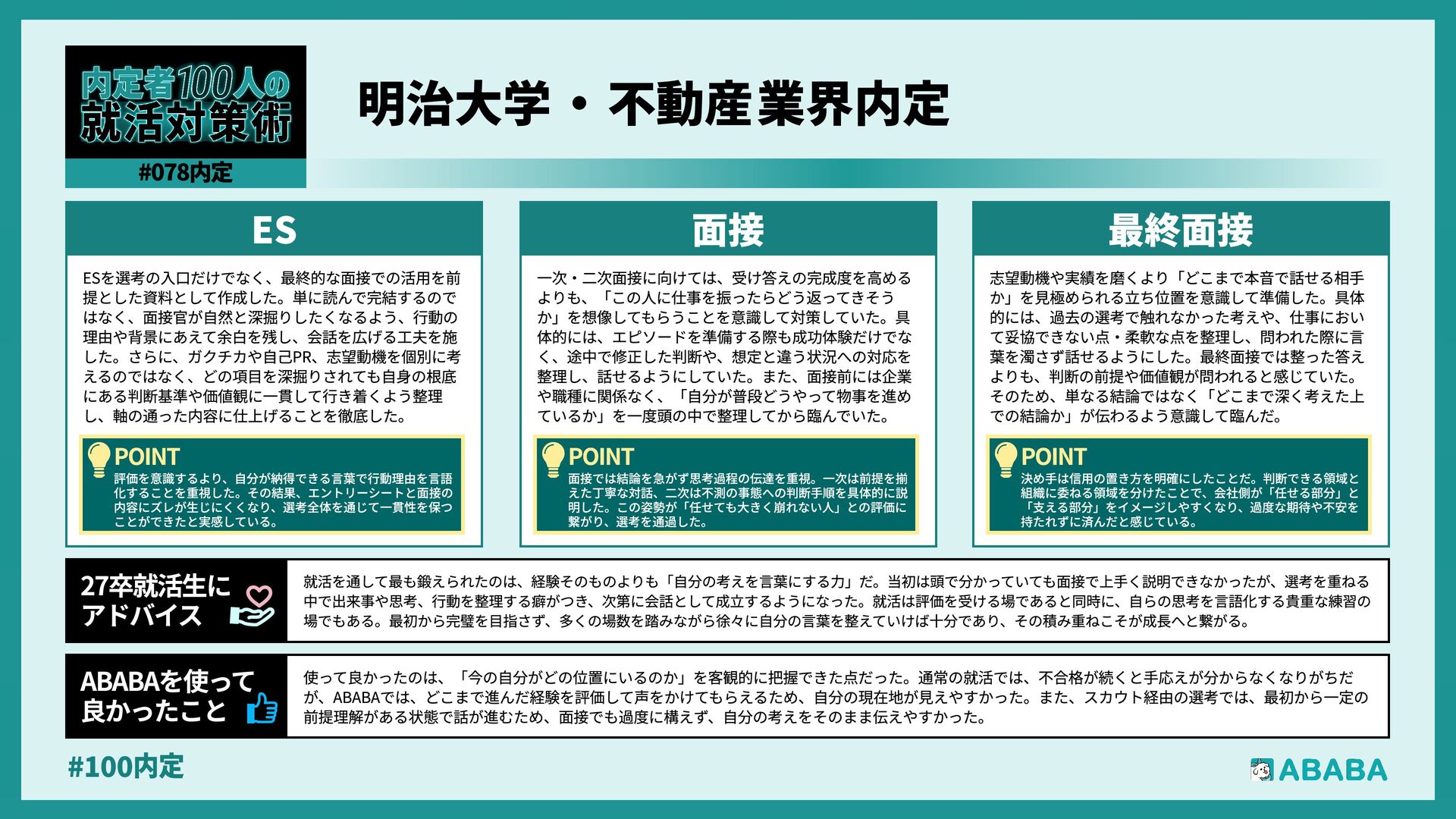 63. #100内 最終選考で落ちた時は絶望しましたが、ABABAに登録した途端に「そこまで評価されたなら」と他社から面接免除のスカウトが届き、努力が報われた気がして 救われました。精神的な余裕ができ、効率よく次へ進めたのが最大のメリットです ABABAを使っ‚ 良かったこ 本格的な選考が始まる27卒の皆さんへ。就活は正解探しではなく、企業との相性を確かめる場です。マニュアル通りではなく、自身の経験に基づいた等身大のストー リーを自分の言葉で伝えることが、面接官の心を動かす鍵となります。また、長期戦の中で思うようにいかない日があっても、それは皆さんの価値を否定するものでは ありません。心身の健康を第一に、適度なリフレッシュを交えながら一歩ずつ進んでください。自分らしく輝ける場所に出会えるよう応援しています 27卒就活生Ó アドバイ