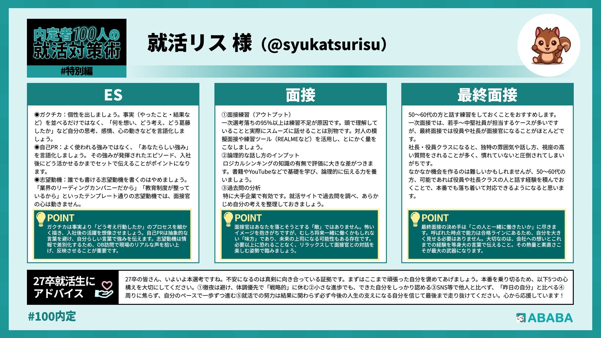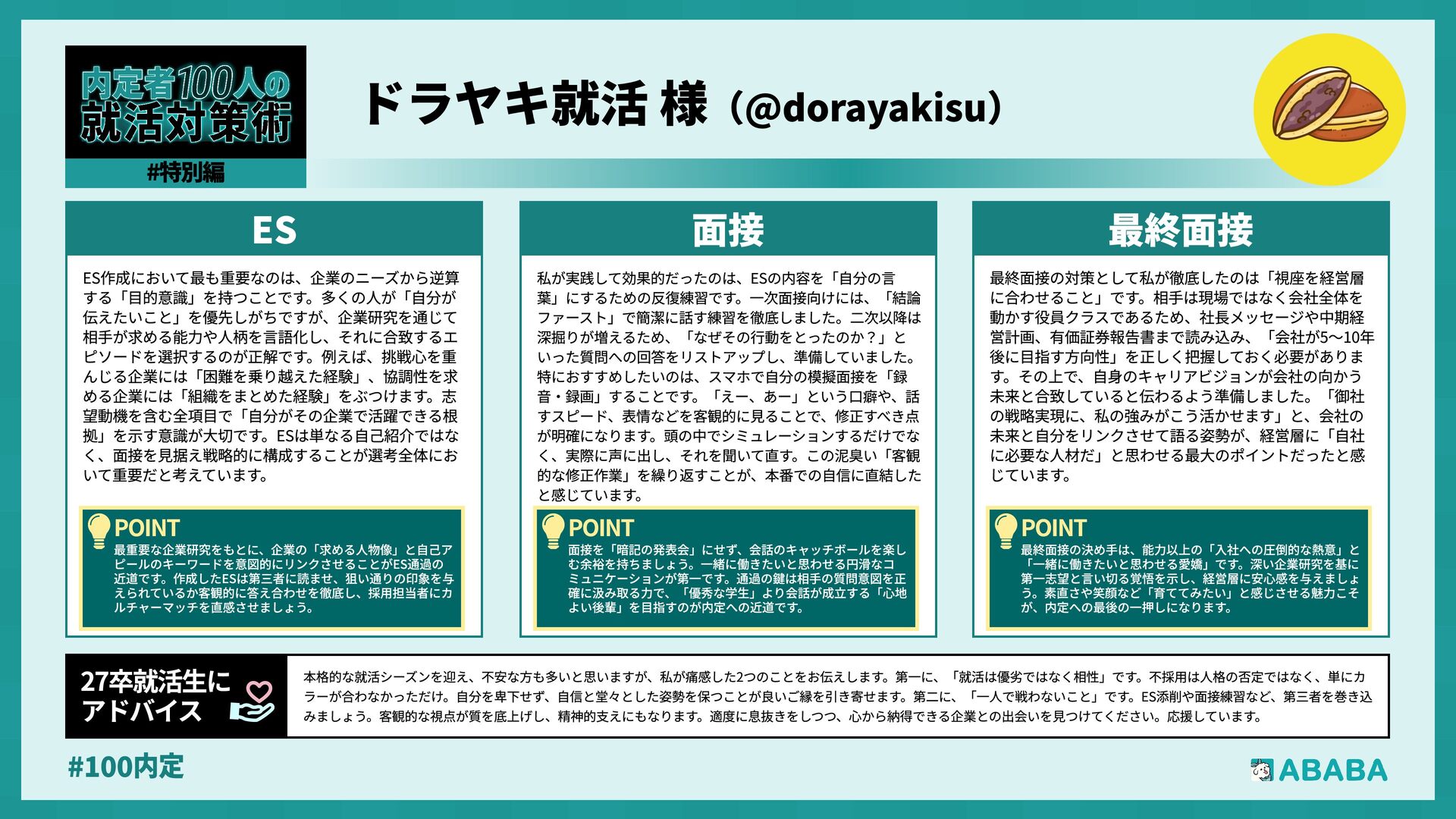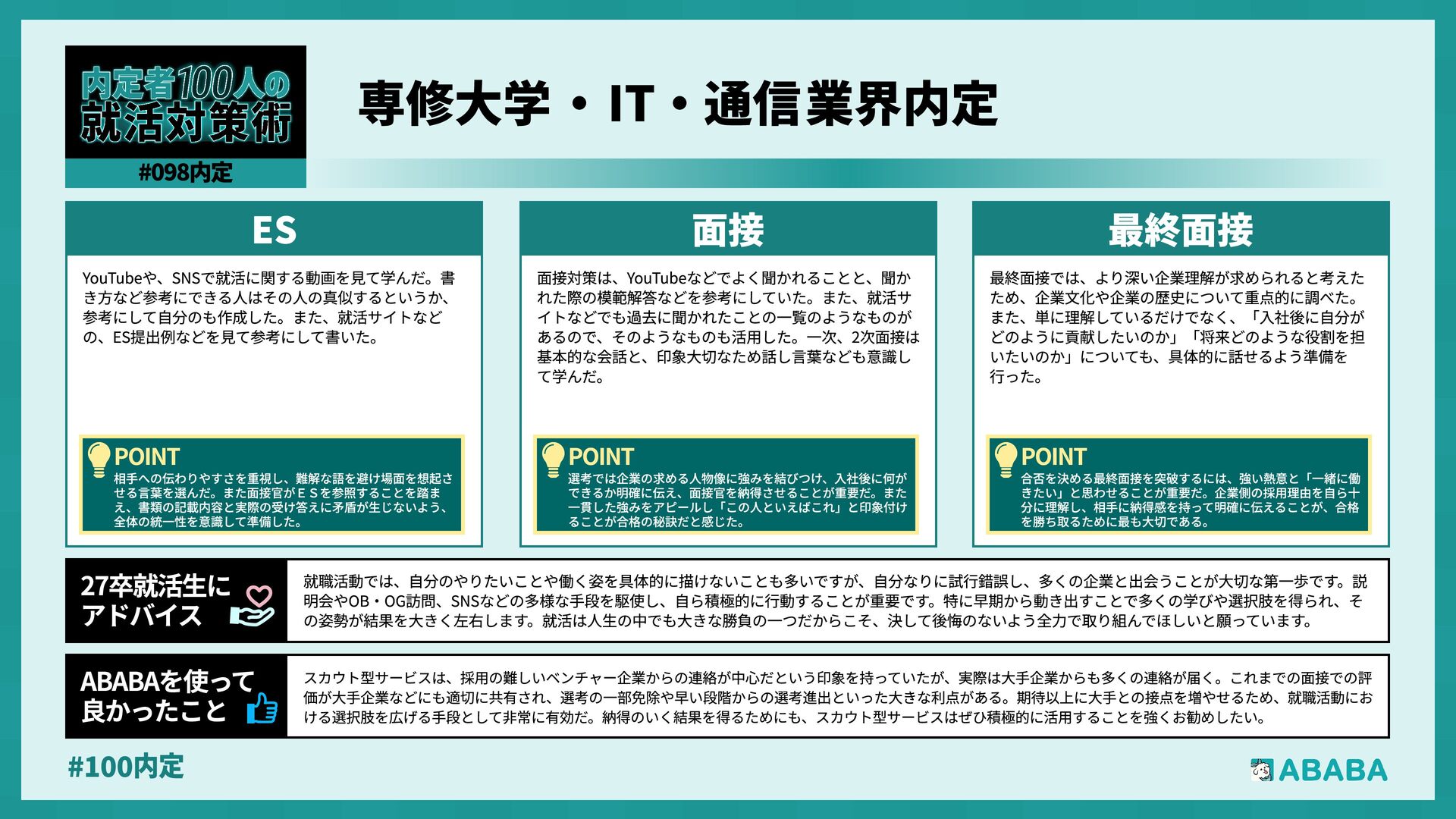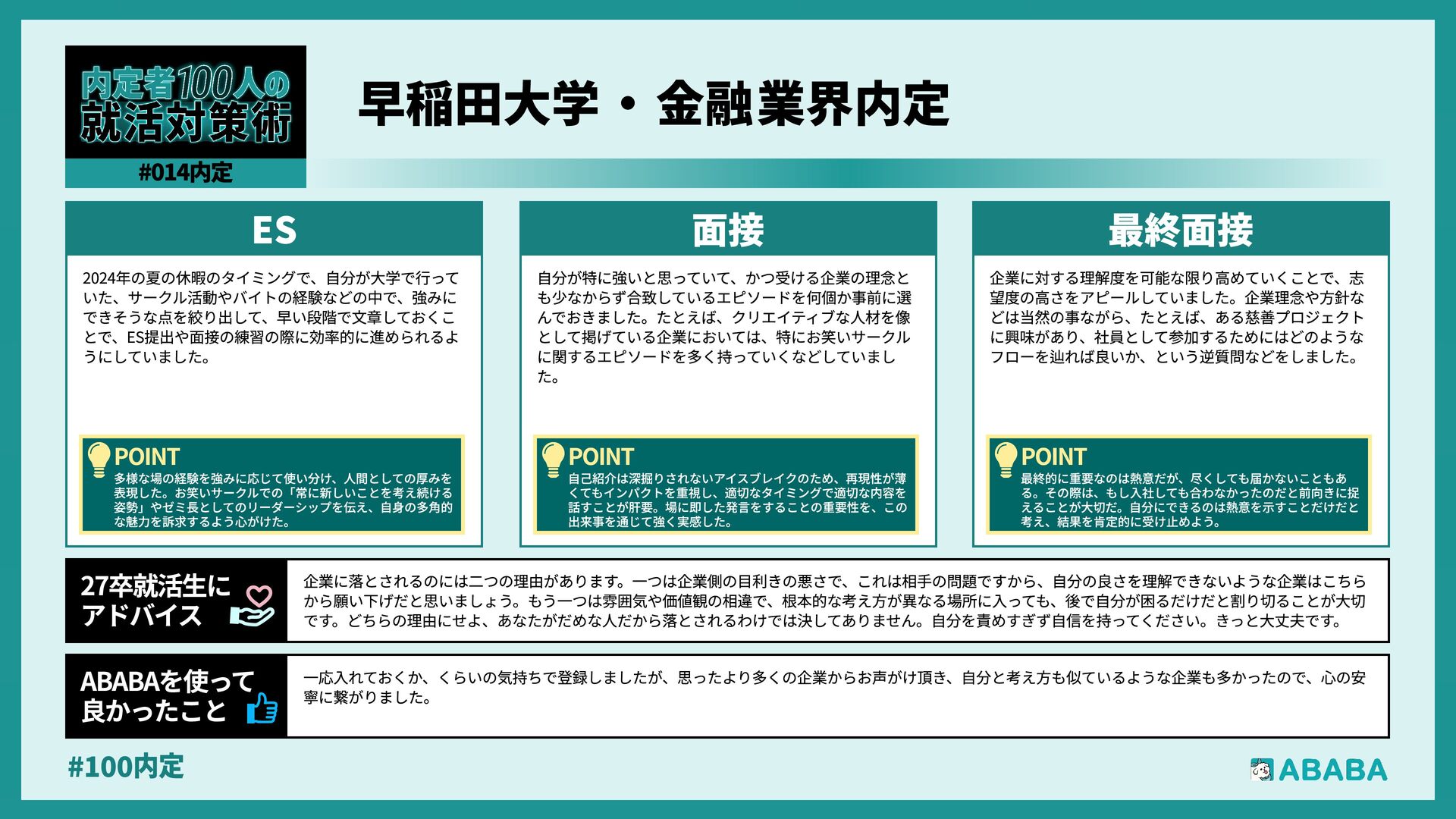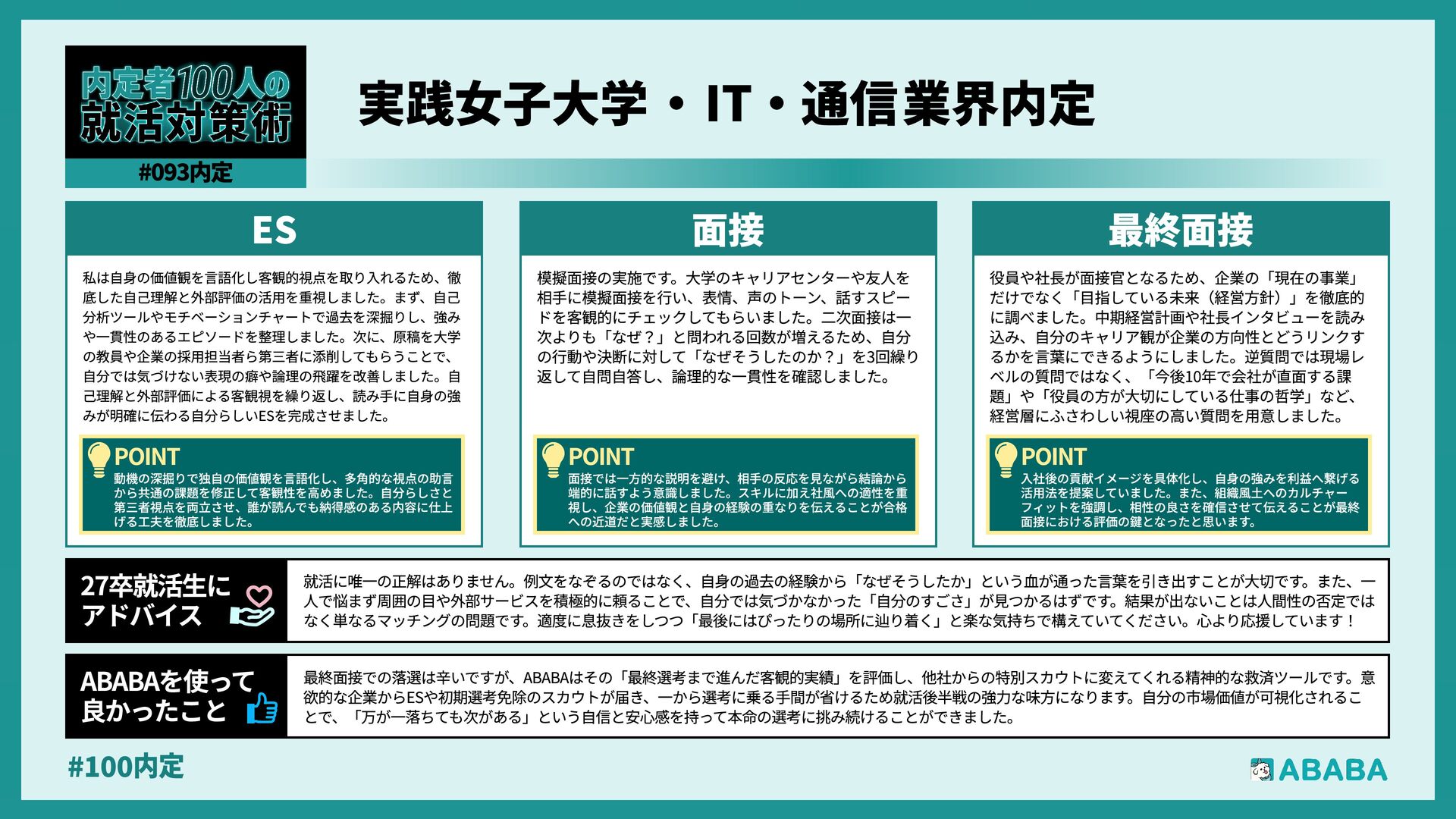 63. #100内 最終選考で落ちた時は絶望しましたが、ABABAに登録した途端に「そこまで評価されたなら」と他社から面接免除のスカウトが届き、努力が報われた気がして 救われました。精神的な余裕ができ、効率よく次へ進めたのが最大のメリットです ABABAを使っ‚ 良かったこ 本格的な選考が始まる27卒の皆さんへ。就活は正解探しではなく、企業との相性を確かめる場です。マニュアル通りではなく、自身の経験に基づいた等身大のストー リーを自分の言葉で伝えることが、面接官の心を動かす鍵となります。また、長期戦の中で思うようにいかない日があっても、それは皆さんの価値を否定するものでは ありません。心身の健康を第一に、適度なリフレッシュを交えながら一歩ずつ進んでください。自分らしく輝ける場所に出会えるよう応援しています 27卒就活生Ó アドバイ