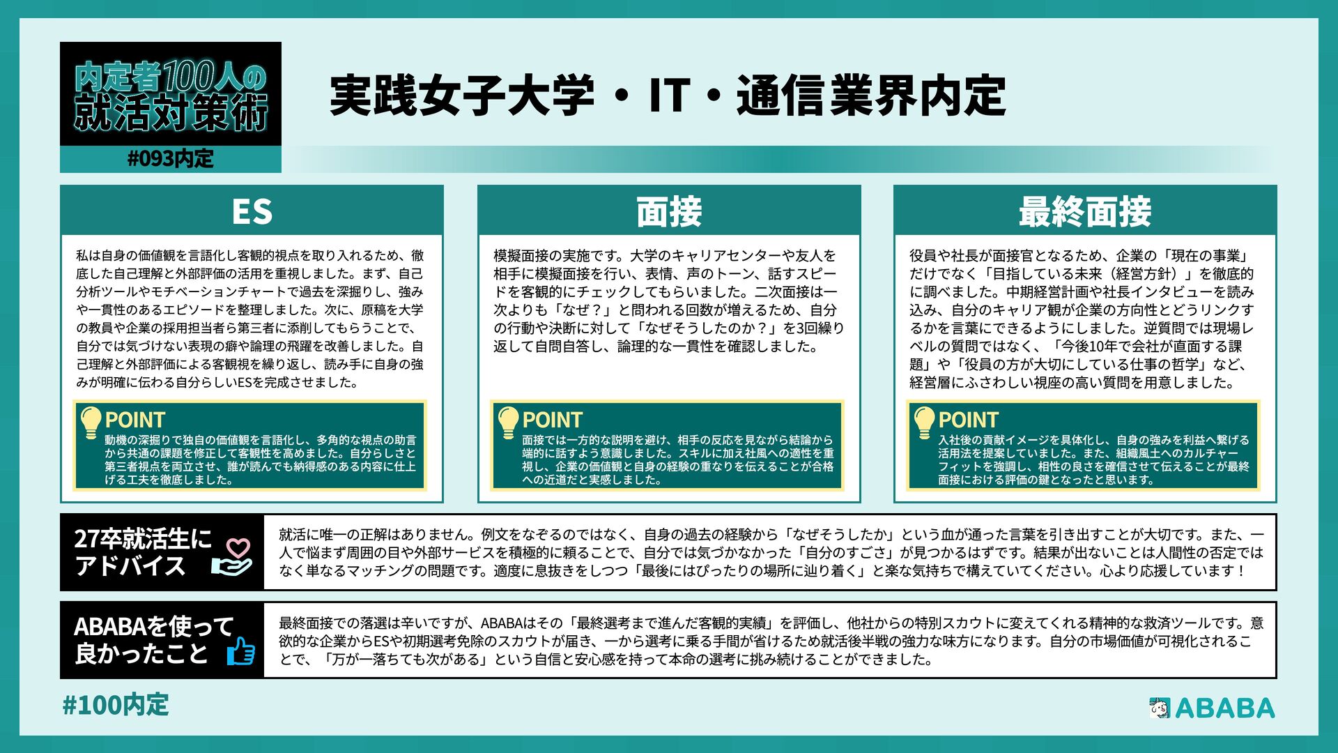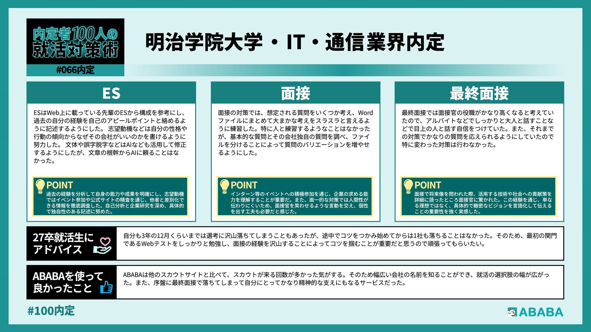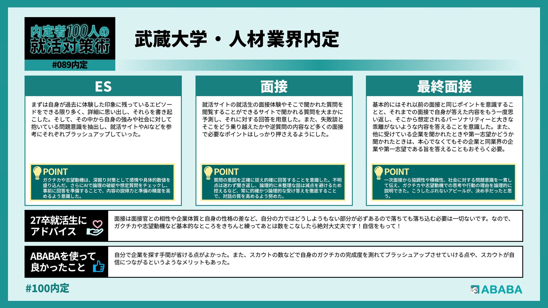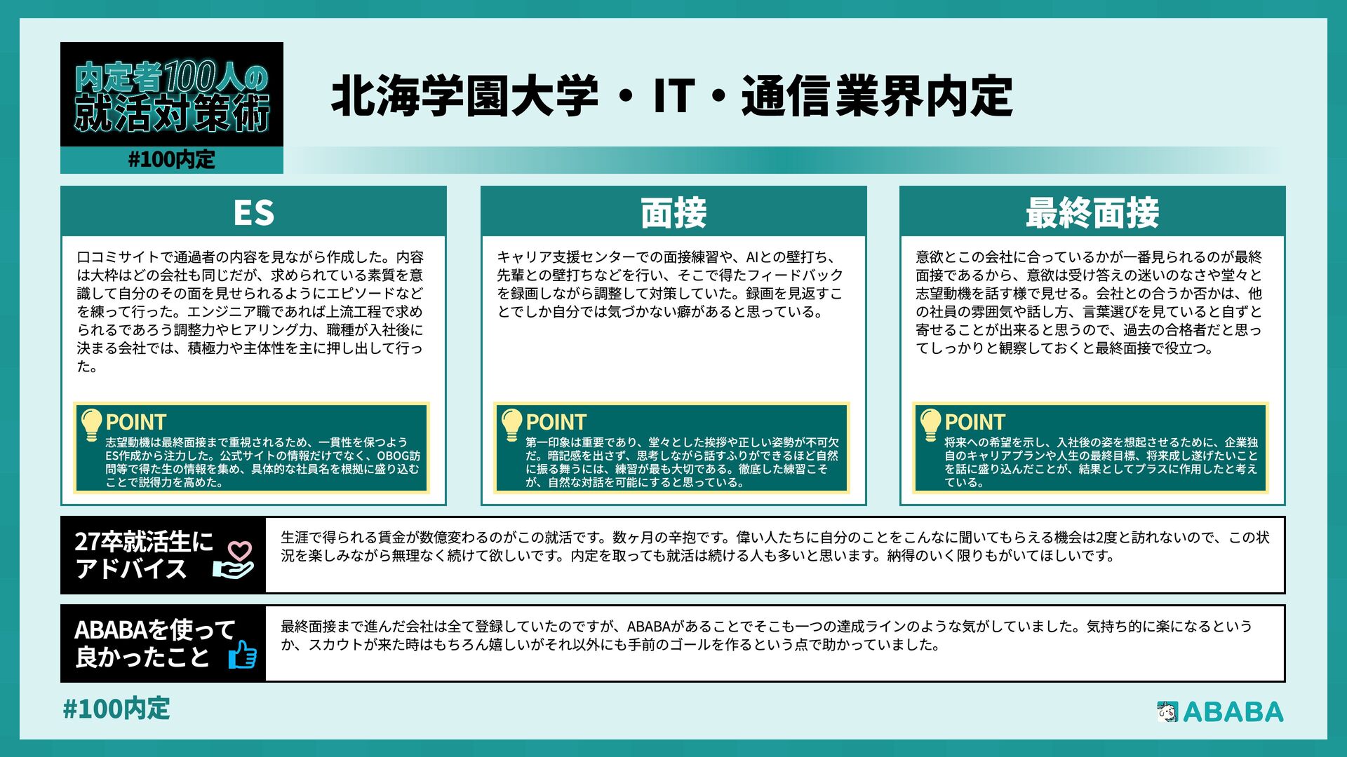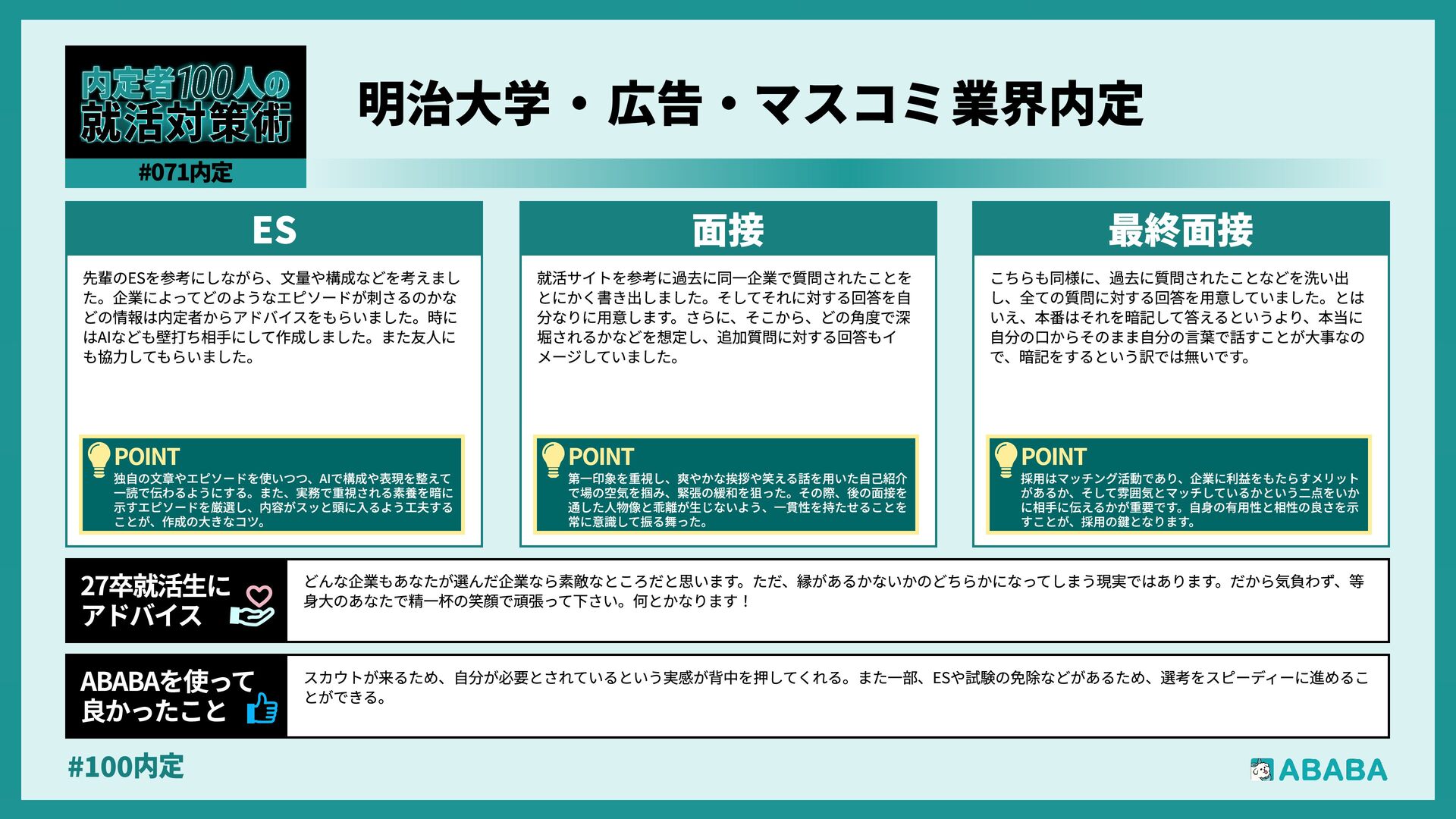 19. #100内 最終面接で落ちた時の絶望感は計り知れませんが、その実績を評価して他社からスカウトが届く仕組みに何度も救われました。「これまでの努力は無駄じゃな かった」と客観的に証明してくれる存在でした ABABAを使っy 良かったこ 私の就職活動(就職留年)は非常に厳しいものでした。挫折や精神的な不調、そして周囲との比較に苦しみ、出口の見えないトンネルを歩いているような感覚 でした。しかし、その痛みを知っているからこそ、自分の言葉に嘘がなくなり、最終的には納得のいく場所から内定をいただくことができました。皆さんも、 もし今が苦しくても、その経験は必ずあなたの「厚み」になります。自分を信じ抜いてください 27卒就活生» アドバイ