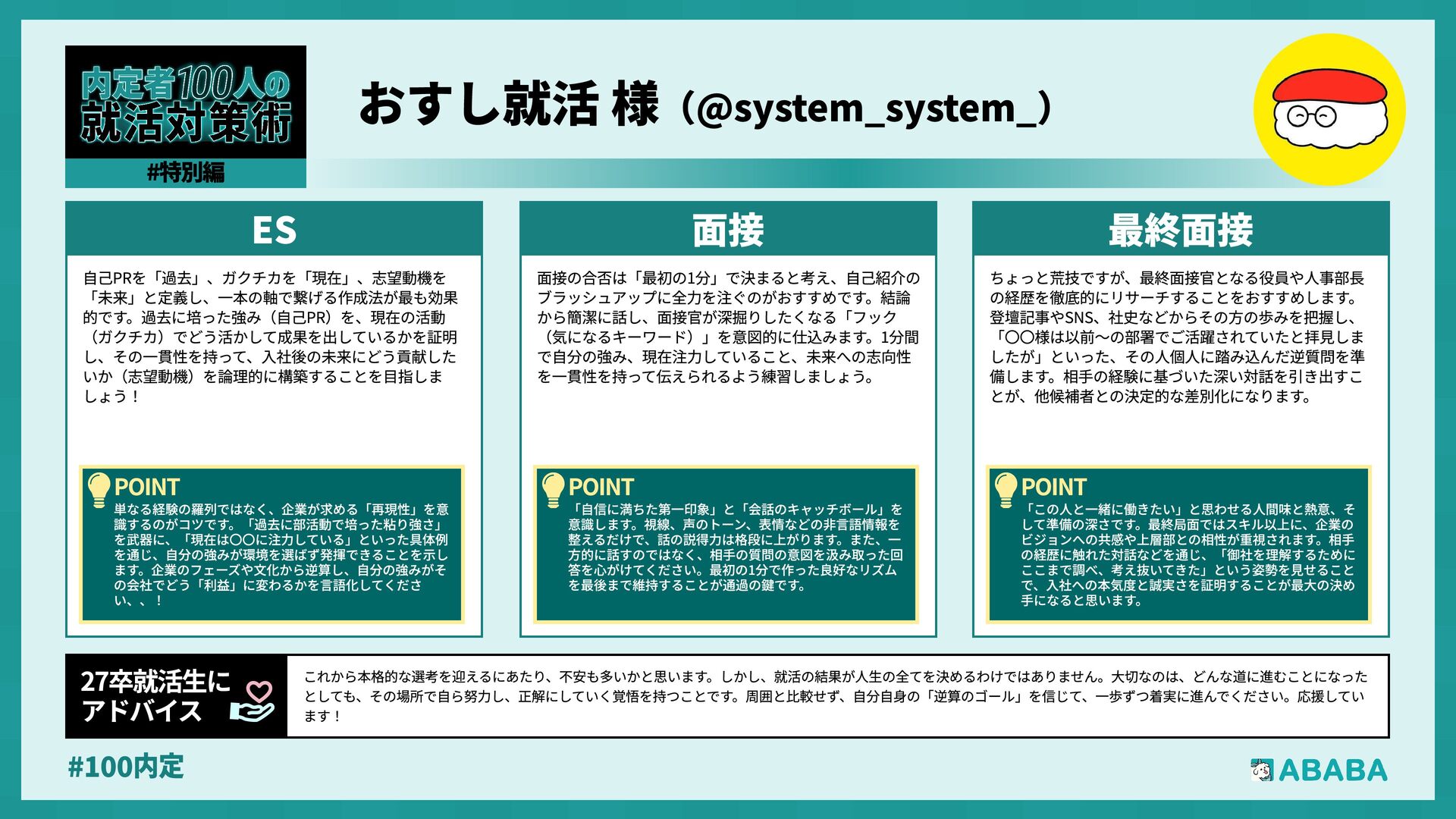 105. #100内 本格的な就活シーズンを迎え、不安な方も多いと思いますが、私が痛感した2つのことをお伝えします。第一に、「就活は優劣ではなく相性」です。不採用は人格の否定ではなく、単にカ ラーが合わなかっただけ。自分を卑下せず、自信と堂々とした姿勢を保つことが良いご縁を引き寄せます。第二に、「一人で戦わないこと」です。ES添削や面接練習など、第三者を巻き込 みましょう。客観的な視点が質を底上げし、精神的支えにもなります。適度に息抜きをしつつ、心から納得できる企業との出会いを見つけてください。応援しています 27卒就活生‹ アドバイ 最終面接の対策として私が徹底したのは「視座を経営層 に合わせること」です。相手は現場ではなく会社全体を 動かす役員クラスであるため、社長メッセージや中期経 営計画、有価証券報告書まで読み込み、「会社が5〜10年