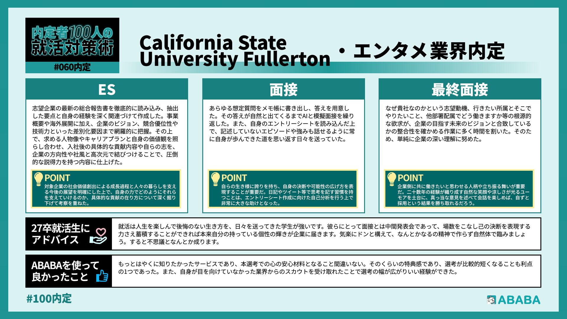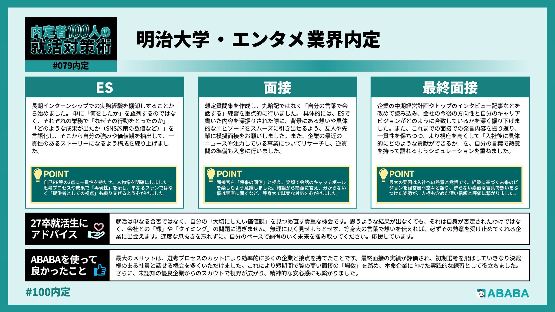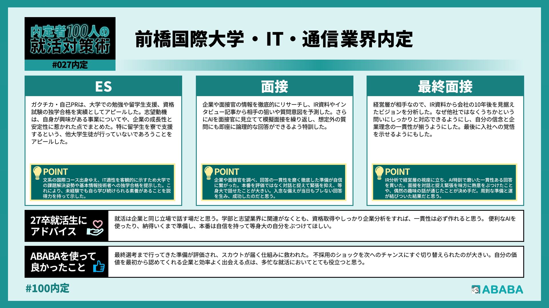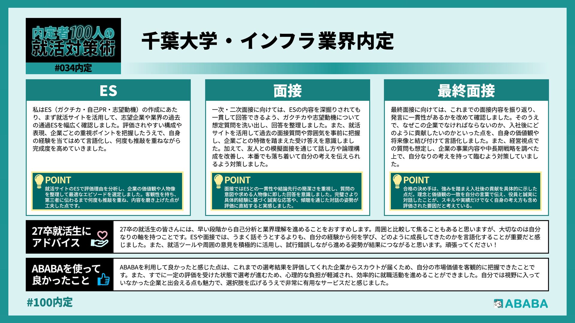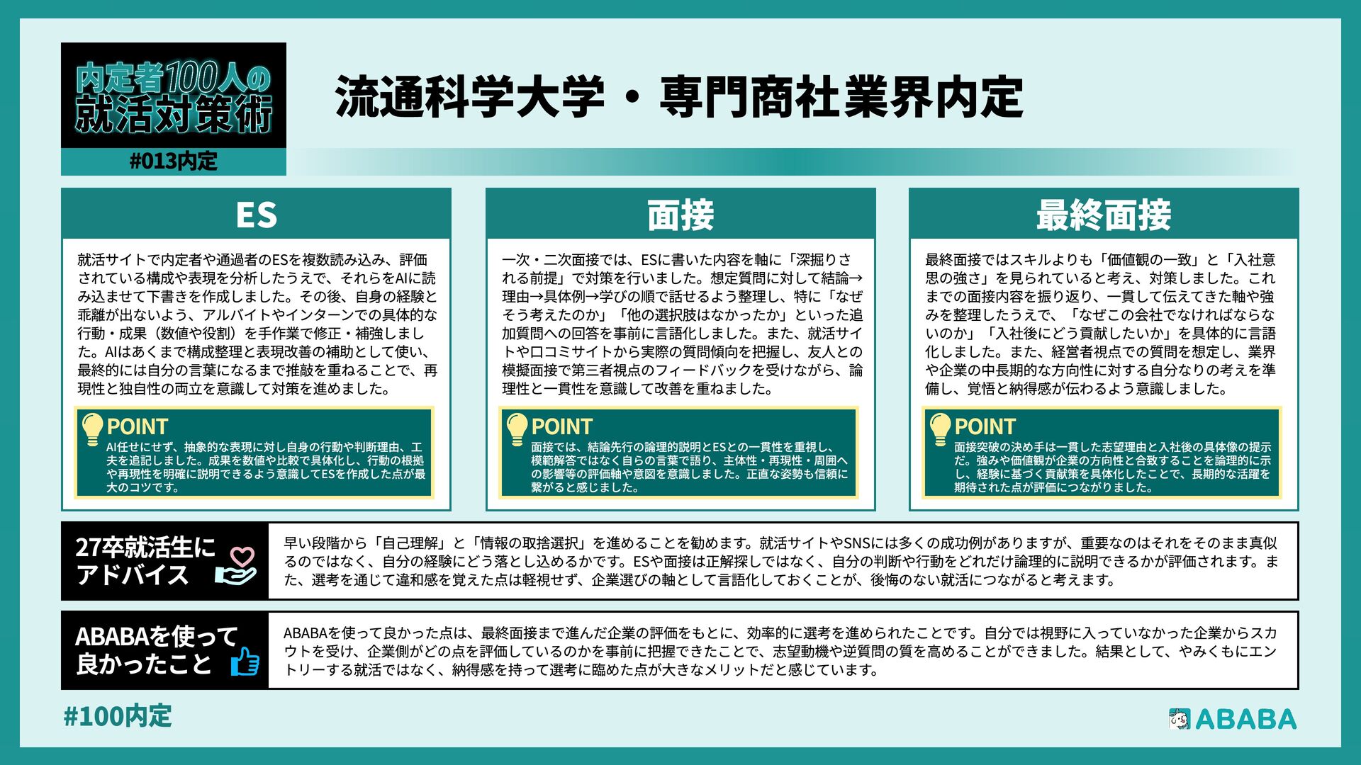 12. #100内 一度最終面接まで進める力があると証明できれば、ESや一次面接を飛ばして、いきなり最終面接や役員面接からスタートできる企業に挑戦でき、実績を評価し てスカウトを送る企業は、プロセスを尊重する文化があるため、マッチングの質も高まりやすいと感じられました ABABAを使っ‚ 良かったこ 就職活動において、インターンシップへの参加は現場の熱量を肌で感じる貴重な機会であり、その経験こそが面接での言葉に説得力を与えてくれると感じまし た。また、面接は『慣れ』と『準備』がすべてで、何度も練習を重ねることで、自分の考えを整理し、自信を持って伝えられるようになりました。選考は相手と のコミュニケーションで、一方的に自分を飾るのではなく、相手に自分の想いを届ける意識を大切にしましょう 27卒就活生Ç アドバイ