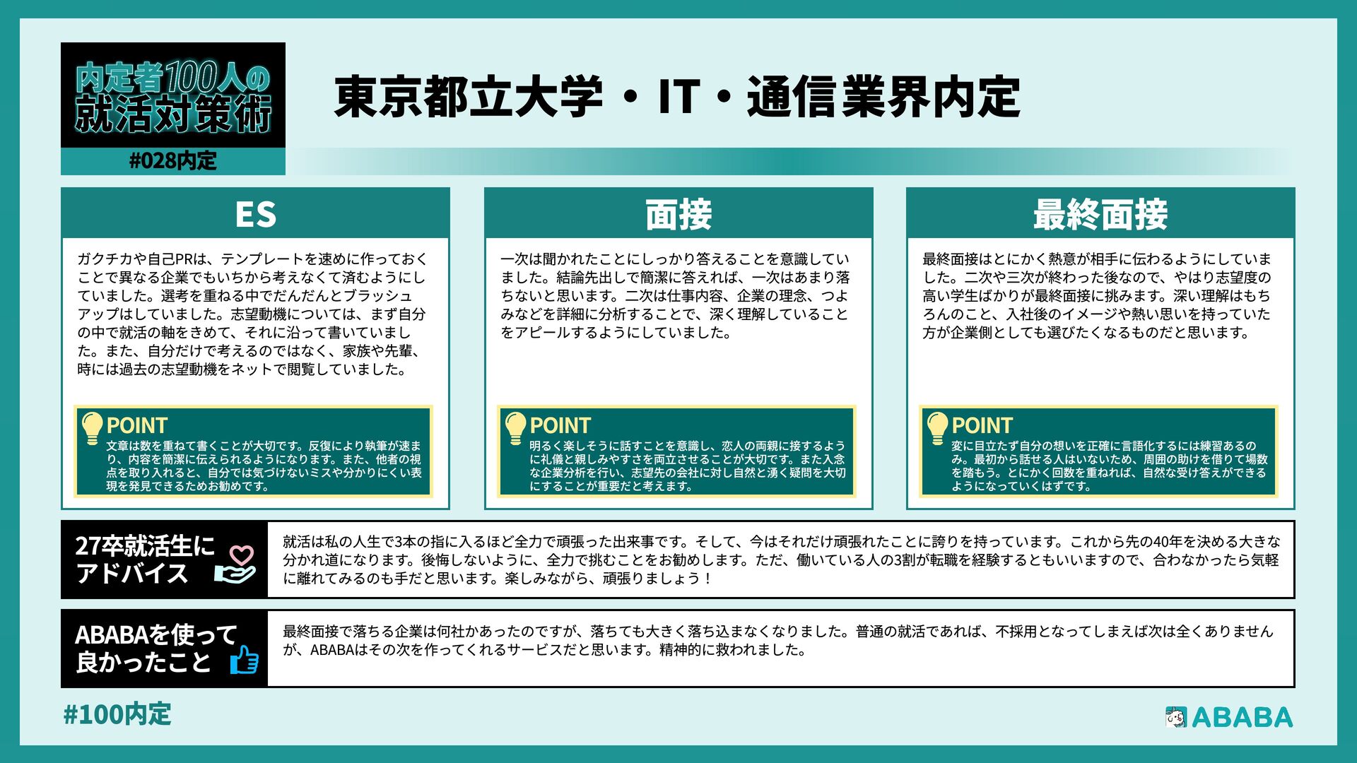 28. #100内 最終選考まで行ってきた準備が評価され、スカウトが届く仕組みに救われた。 不採用のショックを次へのチャンスにすぐ切り替えられたのが大きい。自分の価 値を最初から認めてくれる企業と効率よく出会える点は、多忙な就活においてとても役立つと思う ABABAを使っ” 良かったこ 就活は企業と同じ立場で話す場だと思う。学部と志望業界に関連がなくとも、資格取得やしっかり企業分析をすれば、一貫性は必ず作れると思う。 便利なAIを 使ったり、納得いくまで準備し、本番は自信を持って等身大の自分をぶつけてほしい 27卒就活生·