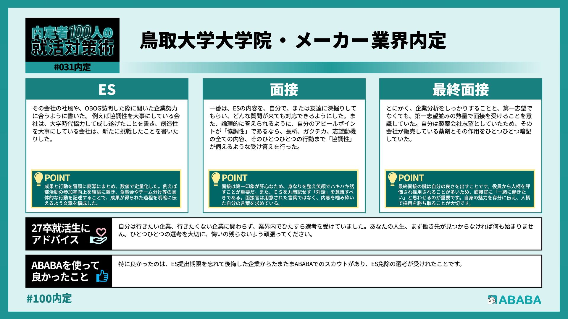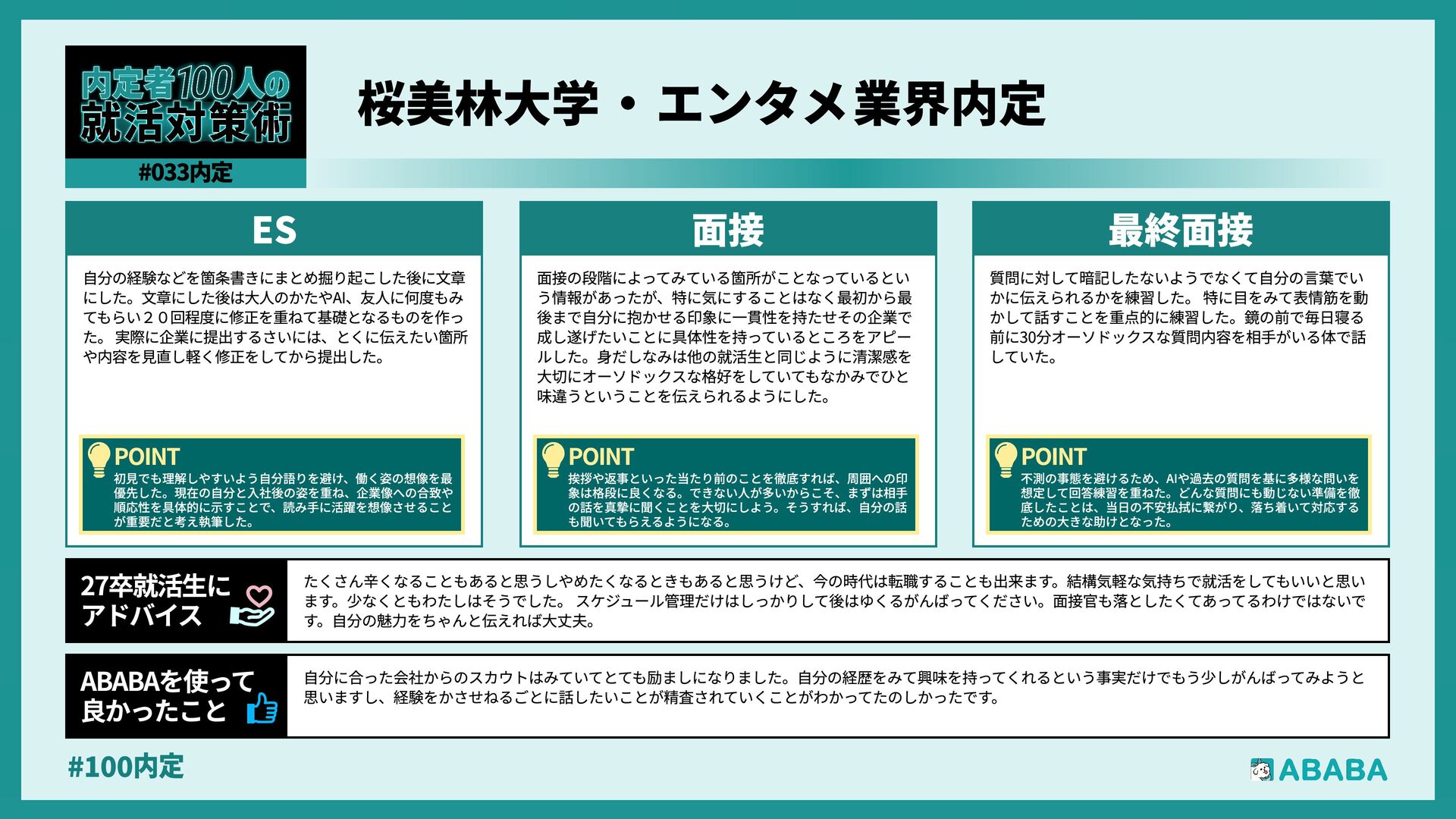 32. #100内 特に良かったのは、ES提出期限を忘れて後悔した企業からたまたまABABAでのスカウトがあり、ES免除の選考が受けれたことです ABABAを使っT 良かったこ 自分は行きたい企業、行きたくない企業に関わらず、業界内でひたすら選考を受けていました。あなたの人生、まず働き先が見つからなければ何も始まりませ ん。ひとつひとつの選考を大切に、悔いの残らないよう頑張ってください 27卒就活生 アドバイ とにかく、企業分析をしっかりすることと、第一志望で なくても、第一志望並みの熱量で面接を受けることを意