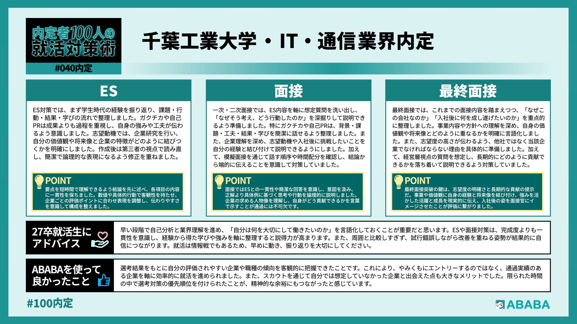 38. #100内 ABABAを利用して良かったのは、自分に合った企業と効率的に出会えた点です。最終面接まで進んだ実績をもとに企業を紹介してもらえるため、書類や一次面 接で落とされることが少なく、自分の強みを正しく評価してくれる企業と出会いやすいと感じました。また、担当の方から企業ごとの面接の特徴や対策も教え てもらえたことで、準備の精度が上がり、安心して選考に臨むことができました ABABAを使っ˜ 良かったこ 就活は周りと比べて不安になりがちですが、大切なのは「自分が何を大事にして働きたいか」を言語化することだと思います。私自身、最初は企業名や条件ば かりを見ていましたが、自分史を振り返り、どんな時にやりがいを感じたのかを整理したことで、軸が明確になりました。早めに自己分析とESの土台作りをし ておくと、面接でも自信を持って話せるので、ぜひ時間をかけて取り組んでみてください 27卒就活生Í