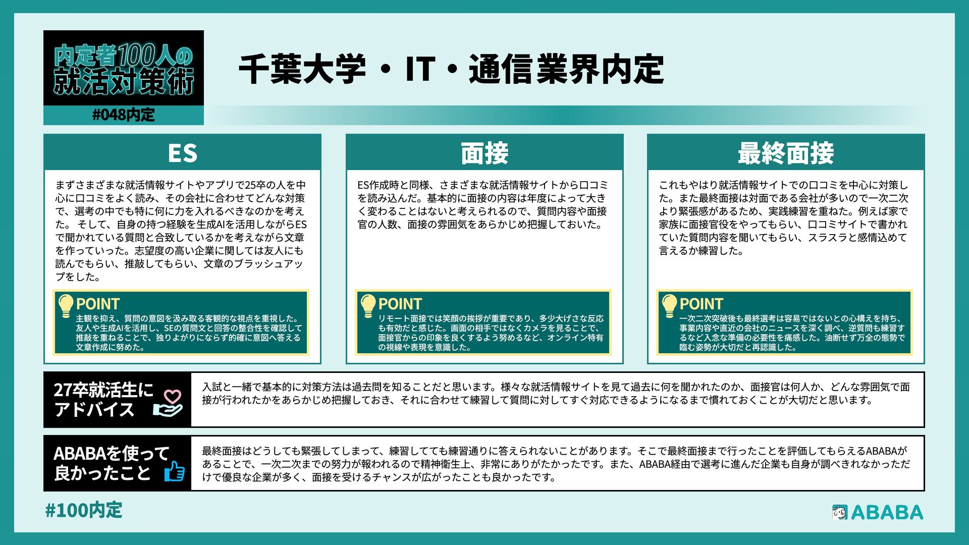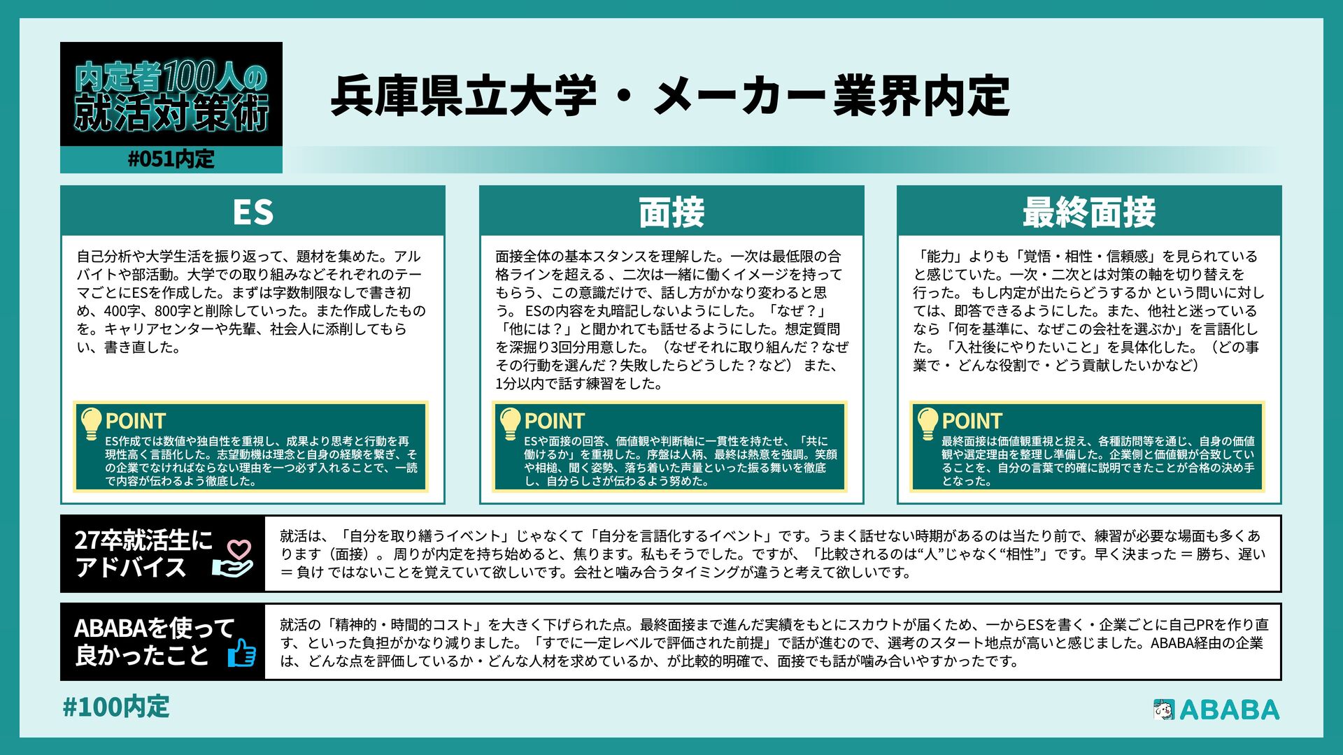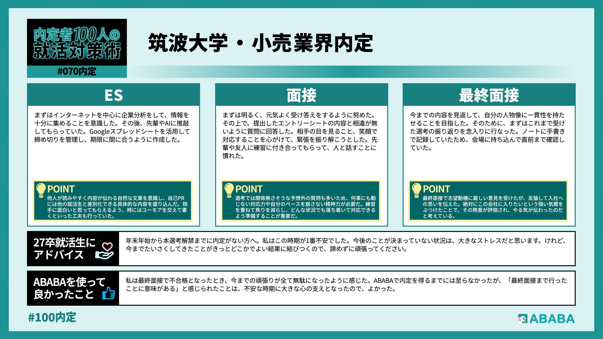 70. #100内 ABABAでは、自分では候補に入れていなかった企業と出会うことができ、視野を広げるきっかけになりました。また、過去の選考結果をもとに企業から声をか けてもらえるため、効率的に選考を進められた点が助かりました。選考がうまくいかなかった後でも次のチャンスにつながり、精神的な負担が軽減されたと感 じています ABABAを使っ‚ 良かったこ 就活は情報量が多く、周囲と比べて焦ってしまうことも多いと思いますが、最終的に大切なのは「自分が納得できる選択かどうか」だと感じました。早く内定 を取ることよりも、自分の価値観や大切にしたい軸を言語化し、それに合う企業を選ぶことが後悔しない就活につながります。うまくいかない時期もあります が、その経験自体が必ず次に活きるので、自分のペースを大切に頑張ってください 27卒就活生¹