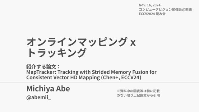 Hang Ma, Yasutaka Furukawa. MapTracker: Tracking with Strided Memory Fusion for Consistent Vector HD Mapping. In ECCV, 2024. • Jonah Philion, Sanja Fidler. Lift, Splat, Shoot: Encoding Images From Arbitrary Camera Rigs by Implicitly Unprojecting to 3D. In ECCV, 2020. • Zhiqi Li, Wenhai Wang, Hongyang Li, Enze Xie, Chonghao Sima, Tong Lu, Qiao Yu, Jifeng Dai. BEVFormer: Learning Bird’s-Eye-View Representation from Multi-Camera Images via Spatiotemporal Transformers. In ECCV, 2022. • Qi Li, Yue Wang, Yilun Wang, Hang Zhao. HDMapNet: An Online HD Map Construction and Evaluation Framework. In ICRA, 2022 • Bencheng Liao, Shaoyu Chen, Xinggang Wang, Tianheng Cheng, Qian Zhang, Wenyu Liu, Chang Huang. MapTR: Structured Modeling and Learning for Online Vectorized HD Map Construction. In ICRA, 2023. • Nicolas Carion, Francisco Massa, Gabriel Synnaeve, Nicolas Usunier, Alexander Kirillov, Sergey Zagoruyko. End-to-End Object Detection with Transformers. In ECCV, 2020. • Xizhou Zhu, Weijie Su, Lewei Lu, Bin Li, Xiaogang Wang, Jifeng Dai. Deformable DETR: Deformable Transformers for End-to-End Object Detection. In ICLR, 2021. • Tianyuan Yuan, Yicheng Liu, Yue Wang, Yilun Wang, Hang Zhao. StreamMapNet: Streaming Mapping Network for Vectorized Online HD Map Construction. In WACV, 2023. • Fangao Zeng, Bin Dong, Yuang Zhang, Tiancai Wang, Xiangyu Zhang, Yichen Wei. MOTR: End-to-End Multiple-Object Tracking with Transformer. In ECCV, 2022. • 講演資料 • 佐藤. ⾃動運転のためのビジョン技術 (MIRU2024, チュートリアル) References