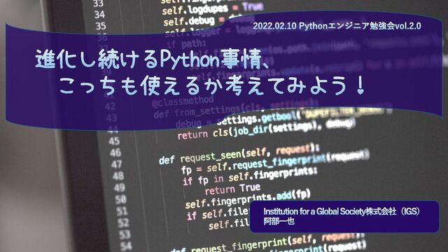 2022年2月10日のPythonエンジニア勉強会vol.2.0で発表した『進化し続けるPython事情、こっちも使えるか考えてみよう!』のスライドです。