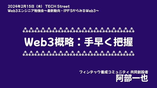 2024年2月15日に開催したWeb3エンジニア勉強会~最新動向・IPFSからみるWeb3~で発表した『Web3概略:手早く把握』のスライドです。 https://tech-street.connpass.com/event/308648/ #テックストリート